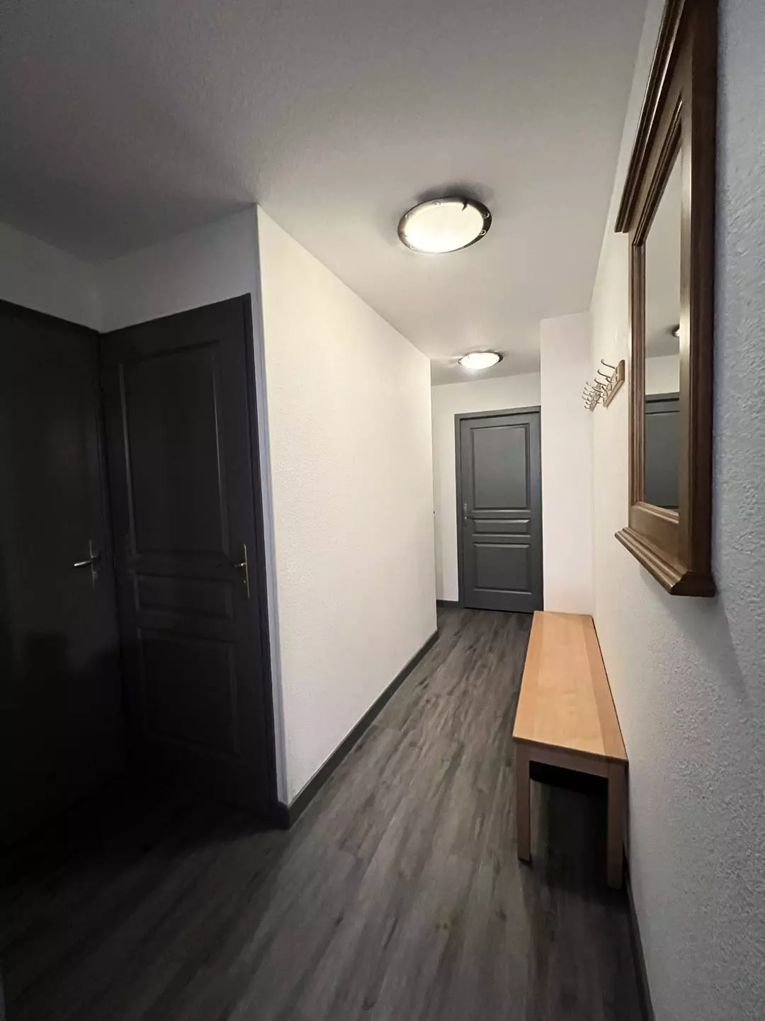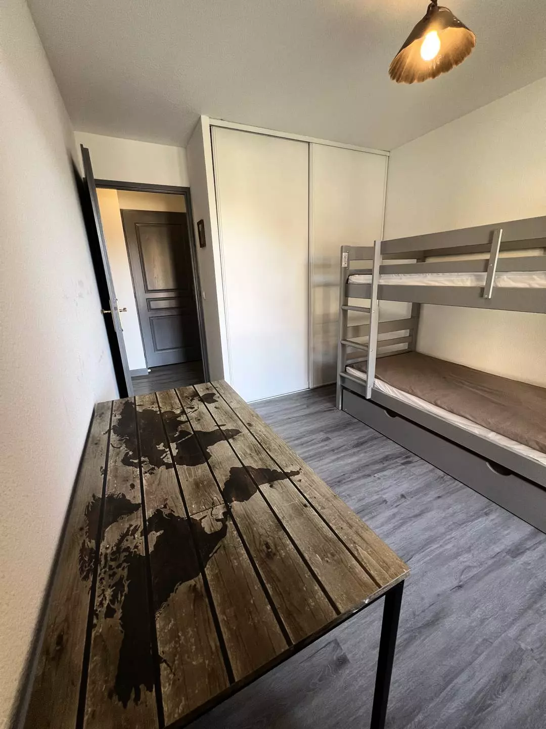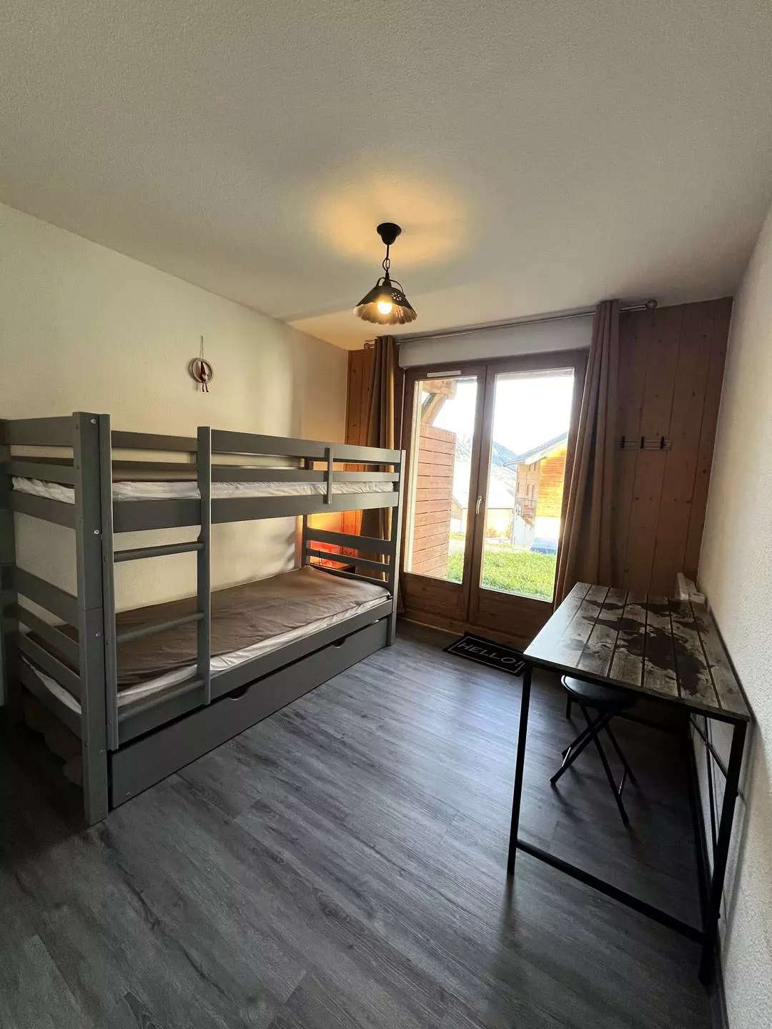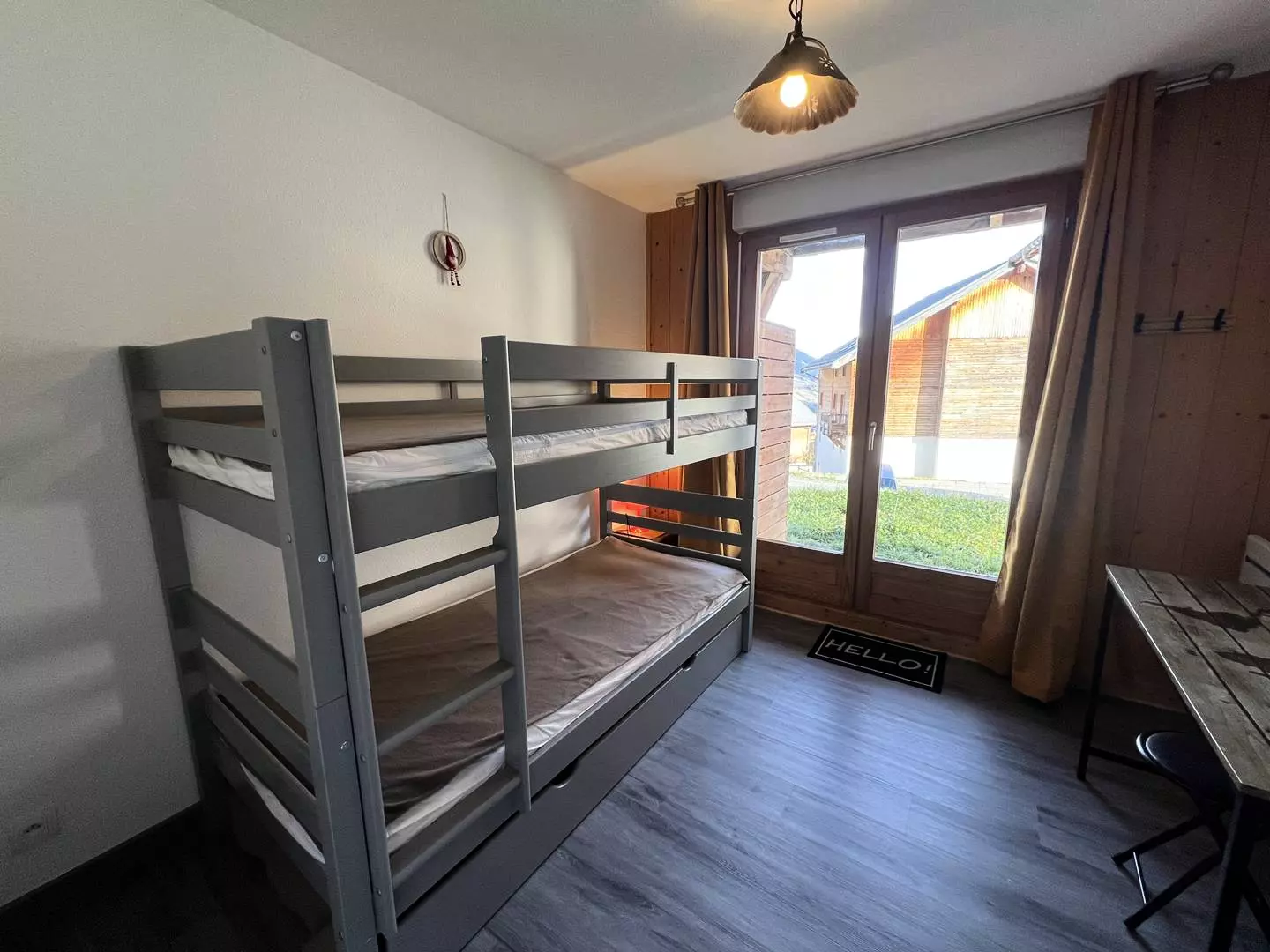 44m2 apartment includes an entrance hall, a bedroom with 1 double bed, a bathroom, a toilet, a living room with equipped kitchen area, a second bedroom with bunk beds and a pull-out bed, a terrace, a ski locker and an outdoor parking space.