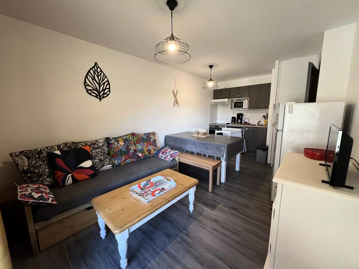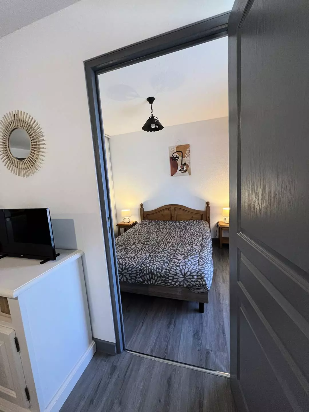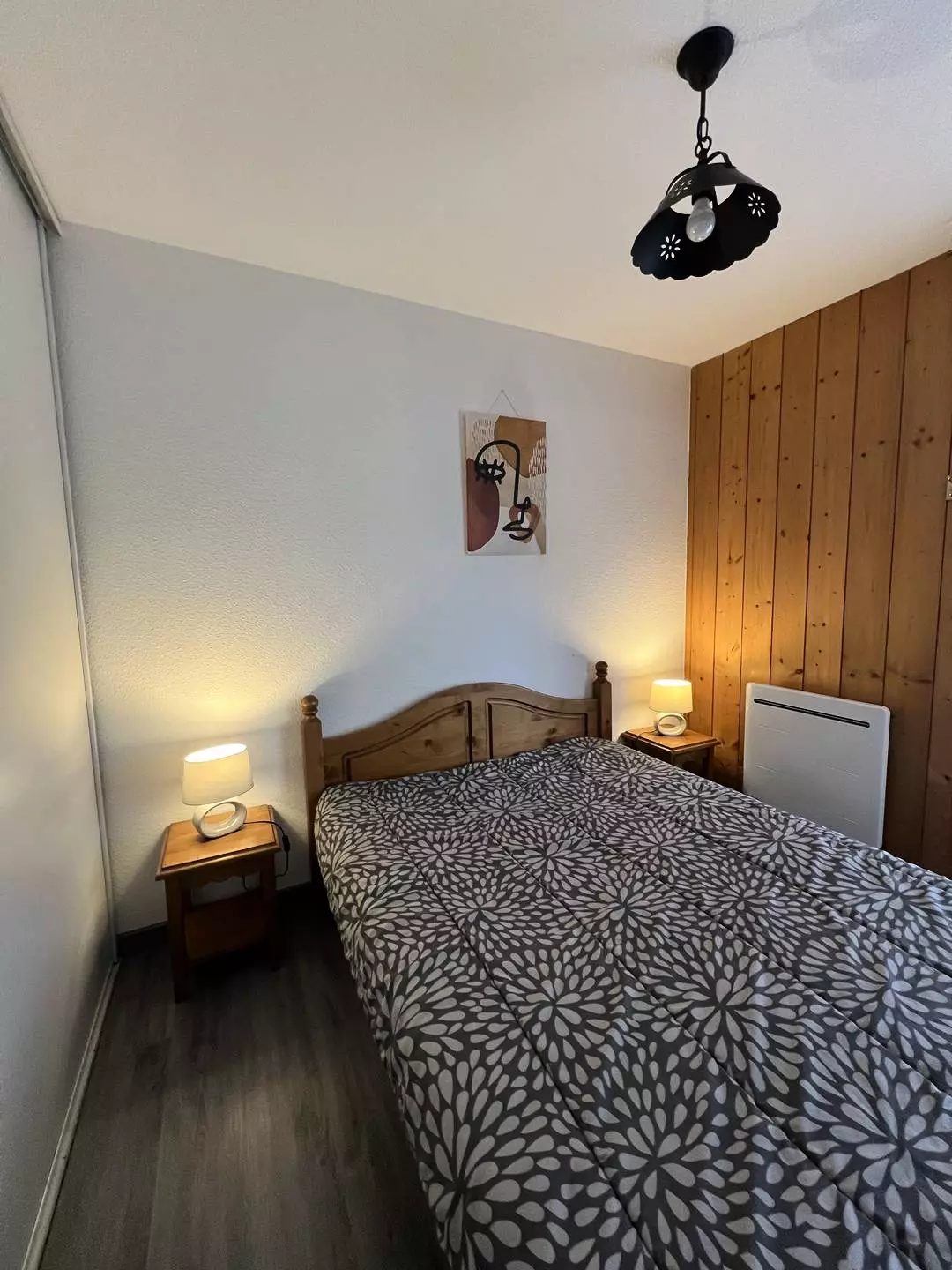44m2 apartment includes an entrance hall, a bedroom with 1 double bed, a bathroom, a toilet, a living room with equipped kitchen area, a second bedroom with bunk beds and a pull-out bed, a terrace, a ski locker and an outdoor parking space.