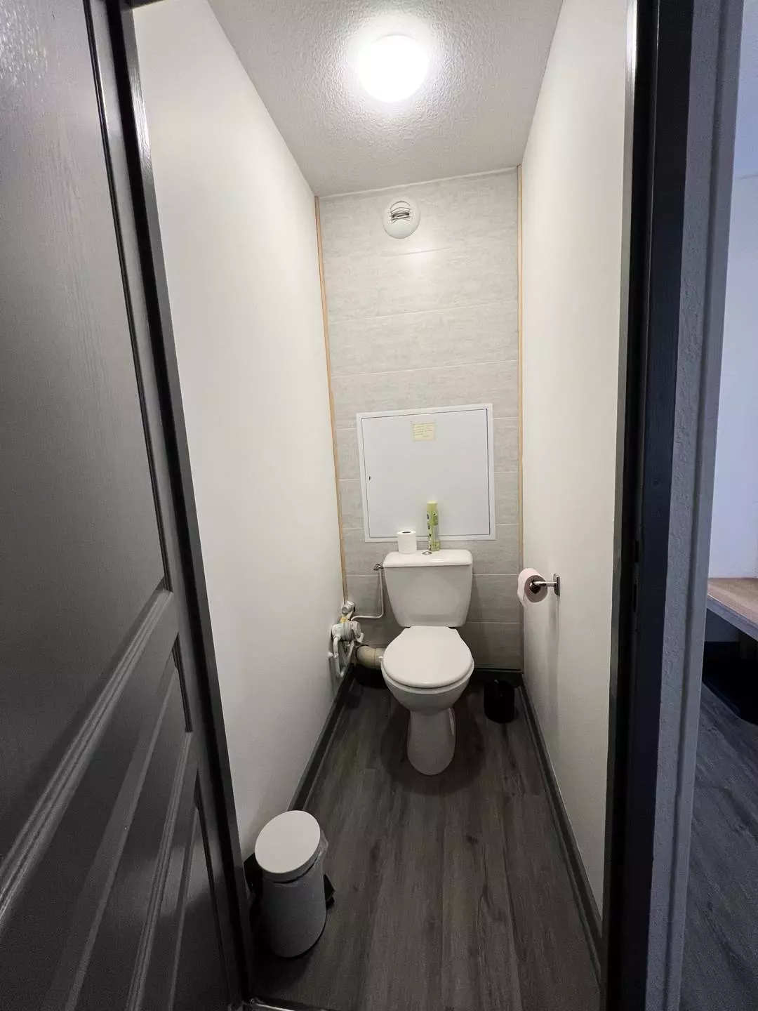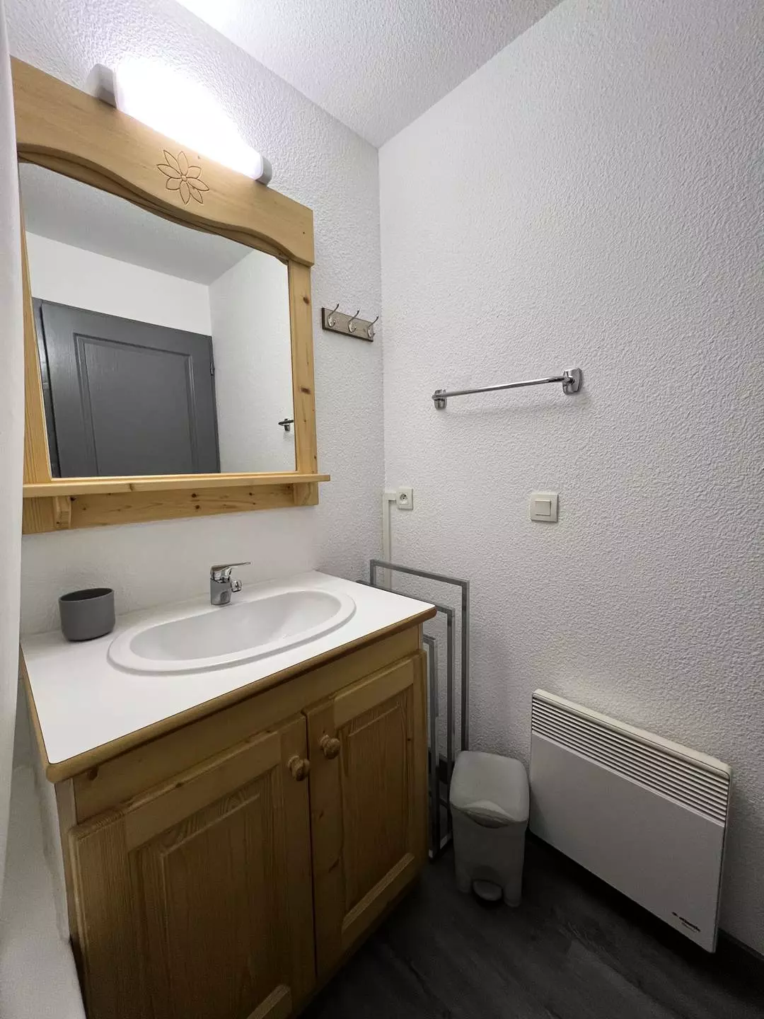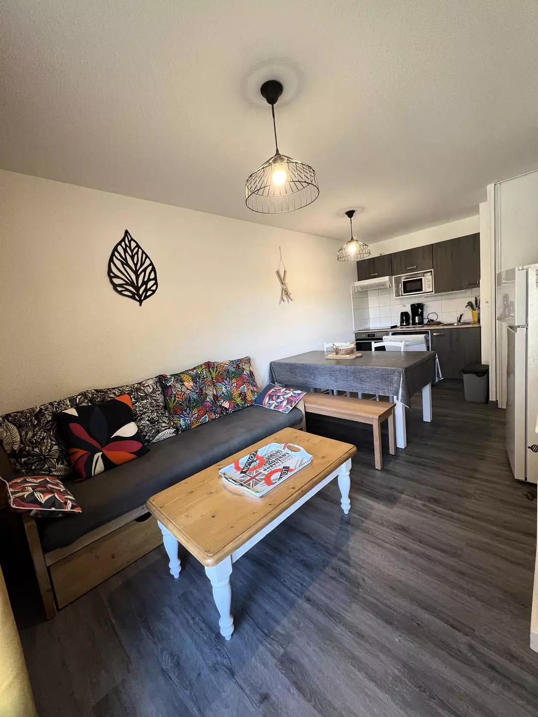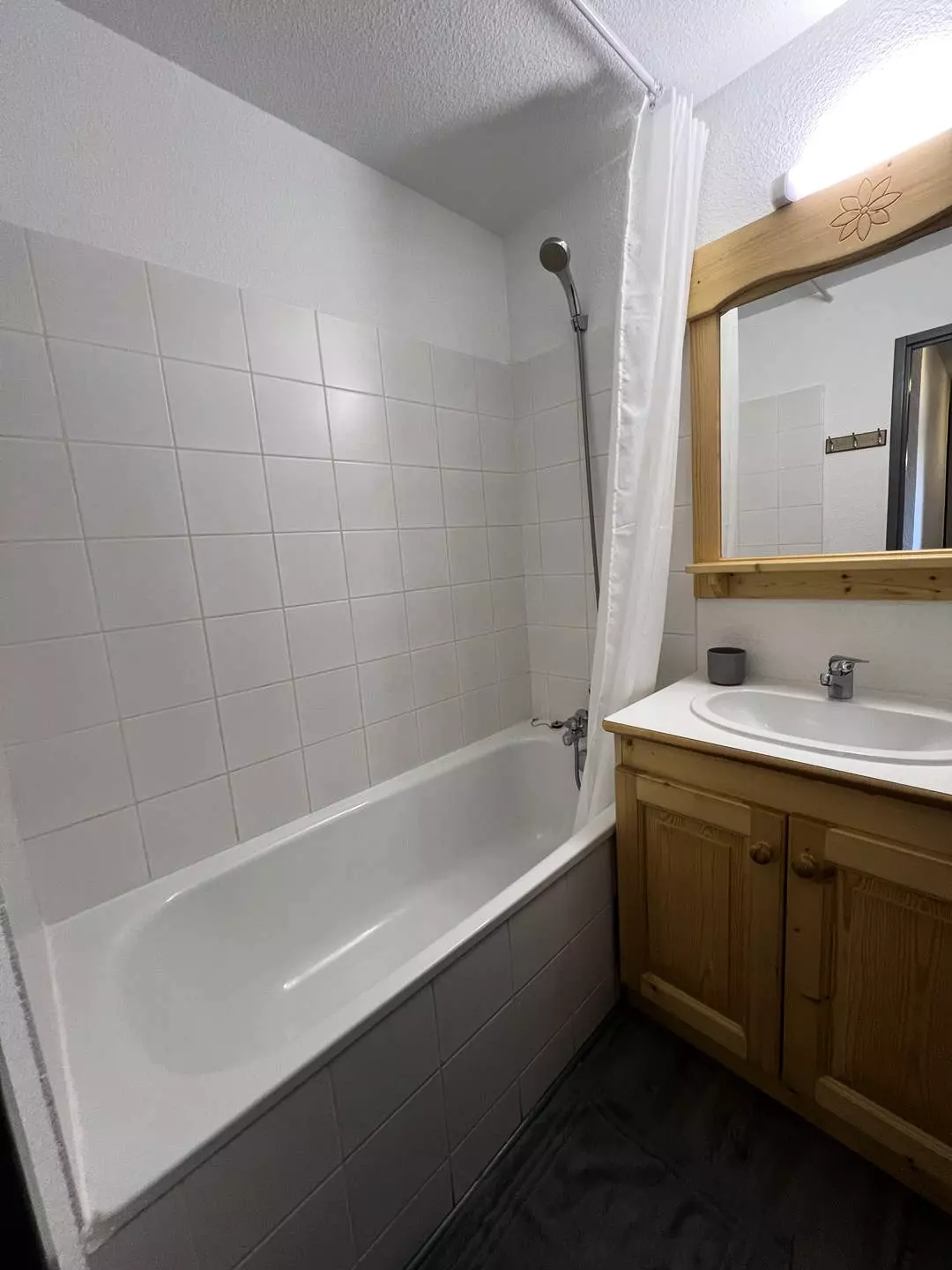 44m2 apartment includes an entrance hall, a bedroom with 1 double bed, a bathroom, a toilet, a living room with equipped kitchen area, a second bedroom with bunk beds and a pull-out bed, a terrace, a ski locker and an outdoor parking space.