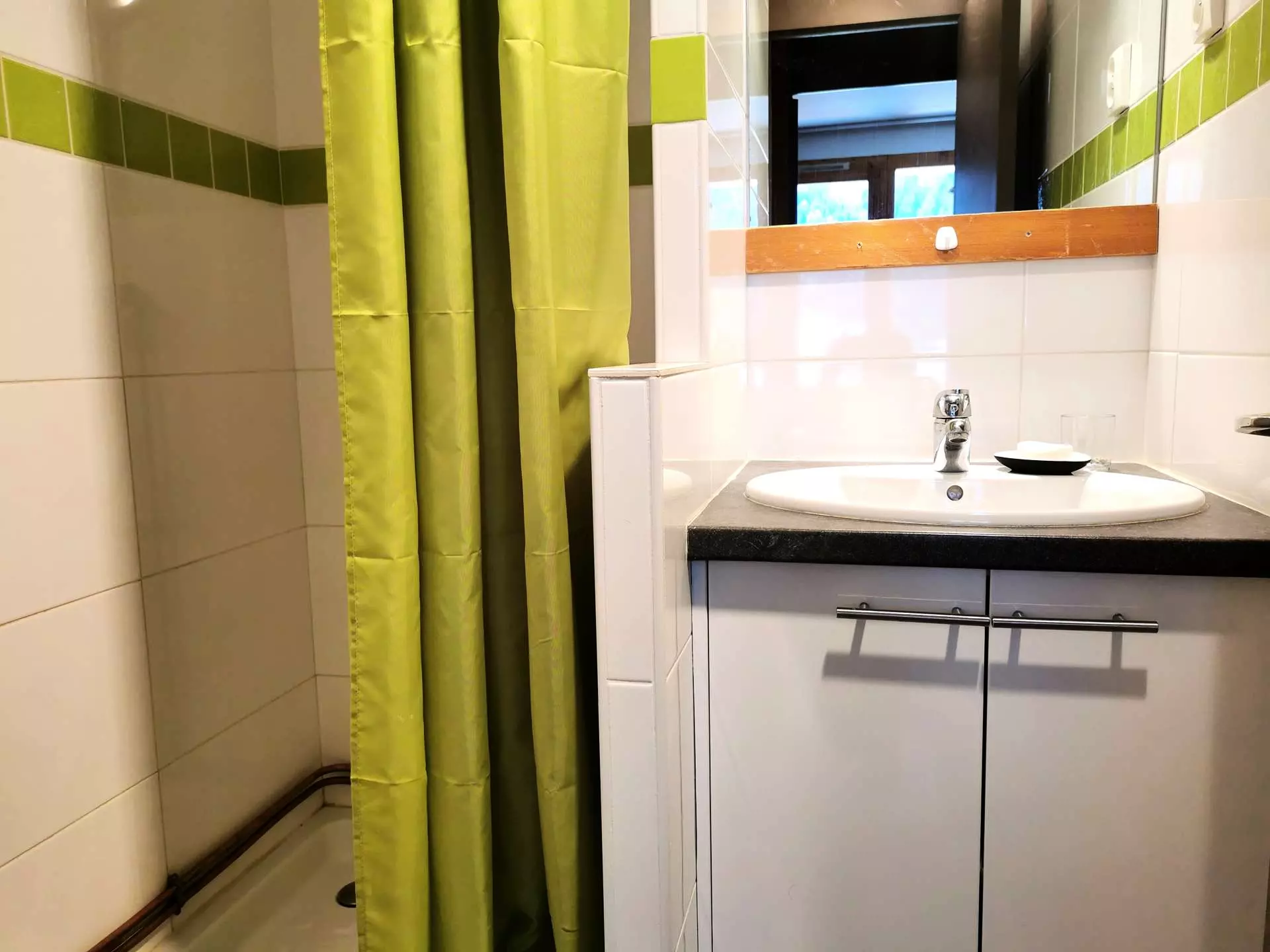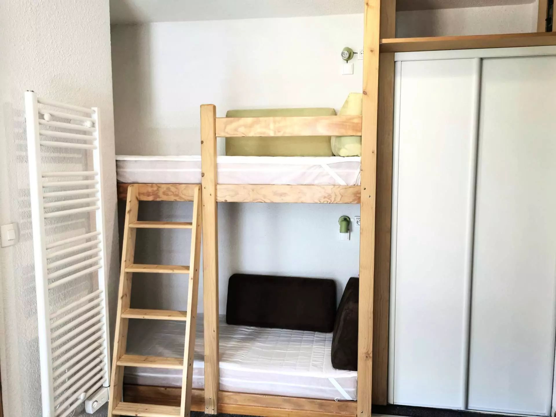 It offers two sleeping areas. The is in the entrance hall, separated from the living room by a movable partition with a set of bunk beds, and the second is separated by a curtain, with a sofa bed and a trundle bed. All beds are equipped with duvets.