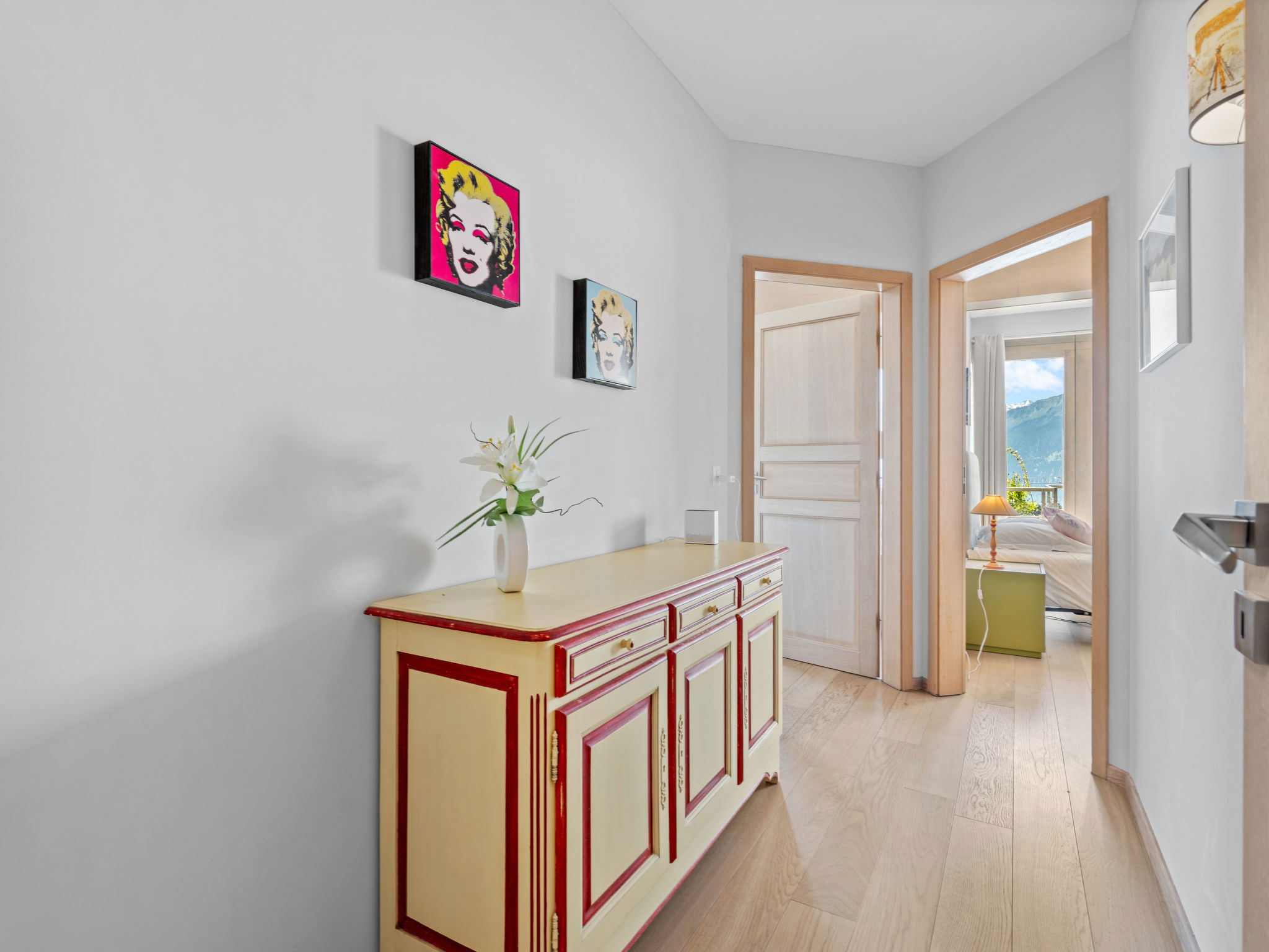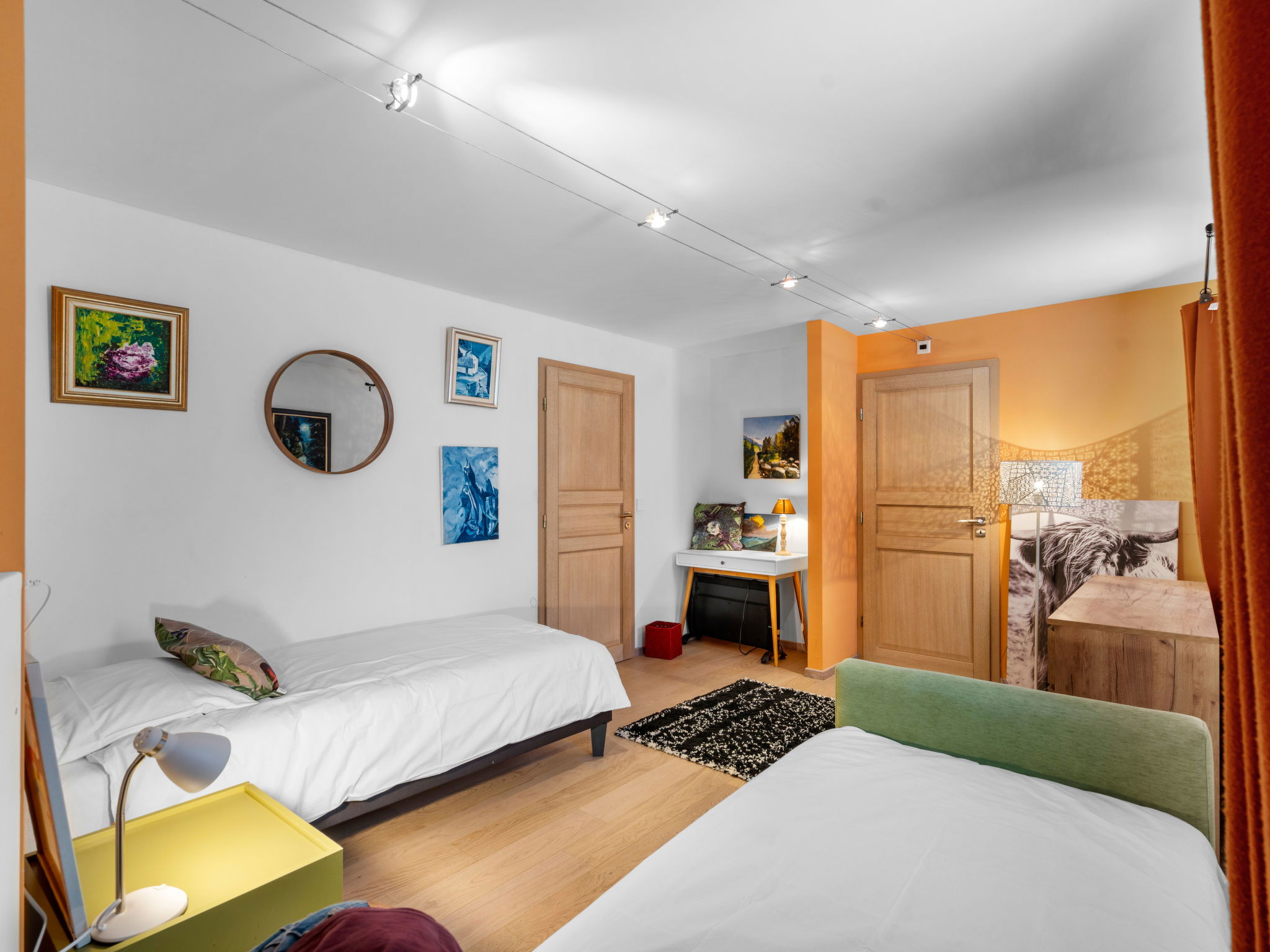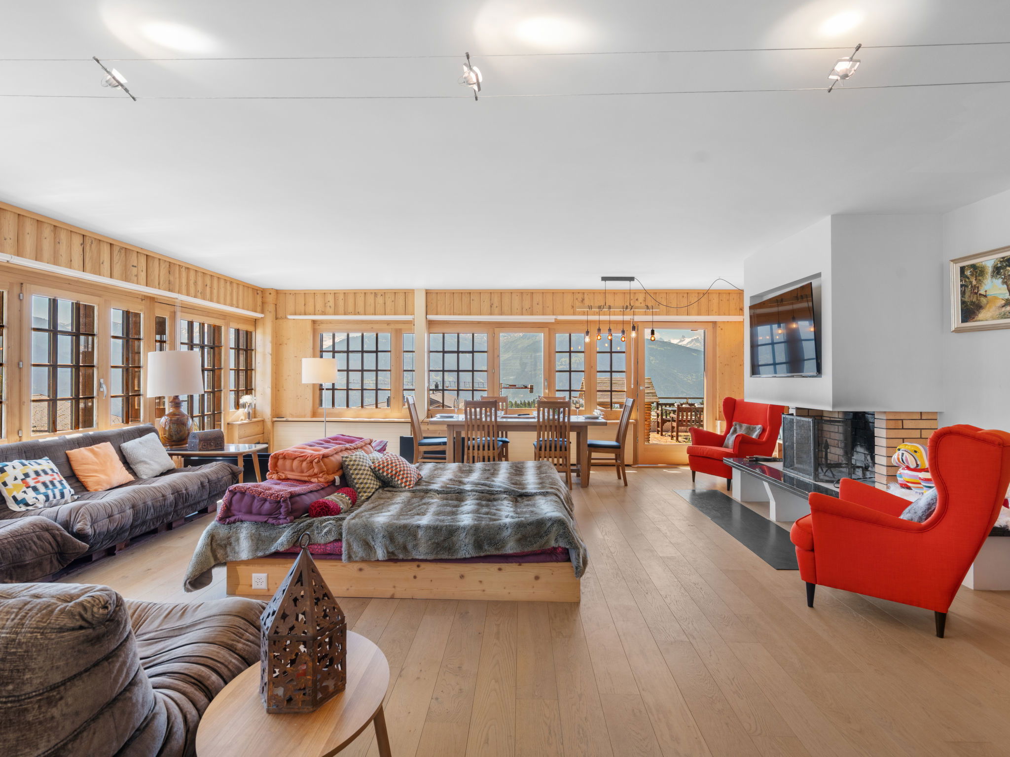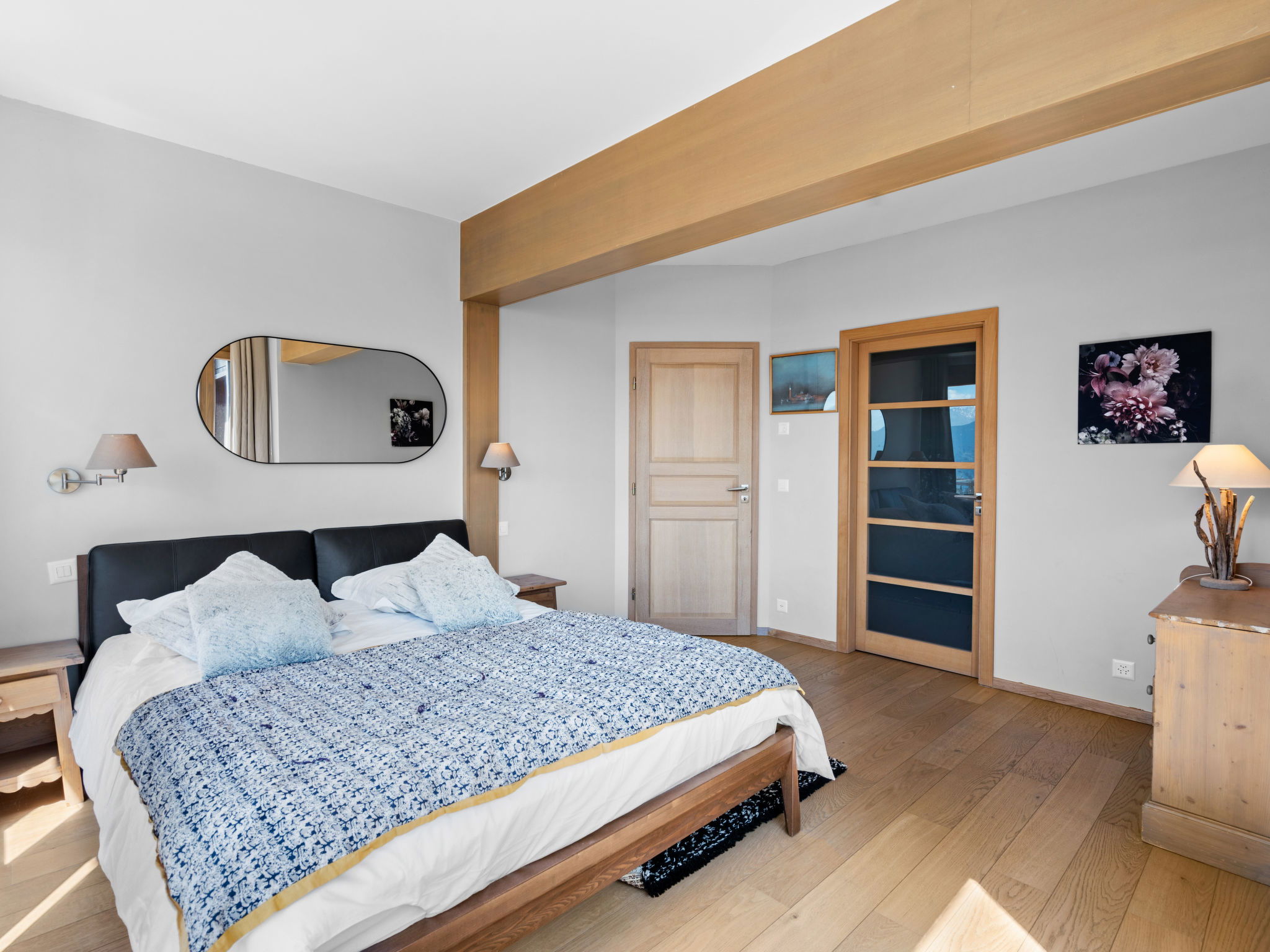 "Jeanne D'Arc LOFT COMBI", 10-room maisonette 350 m2, south facing position. Spacious, comfortable and tasteful furnishings: large living/dining room with open-hearth fireplace, dining table and cable TV. Exit to the terrace. 1 room with 1 french bed (160 cm, length 200 cm), bath/WC, double hand-basin and cable TV. 1 room with 2 beds (80 cm, length 200 cm), shower/WC. 1 room with 2 beds (80 cm, length 200 cm), shower/WC. Exit to the terrace. 1 room with 2 beds (90 cm, length 190 cm), shower/WC. 1 room with 1 french bed (160 cm, length 200 cm), bath/WC and double hand-basin. Exit to the terrace. 1 room with 1 double bed (2 x 90 cm, length 200 cm), shower/WC. Exit to the terrace. Open kitchen (oven, dishwasher, 4 ceramic glass hob hotplates, toaster, kettle, microwave, freezer, electric coffee machine, Capsules for coffee machine (Nespresso) extra, raclette grill, fondue Set (chinoise)) with bar. Sep. WC. On the lower ground floor: (spiral staircase) large playroom with bar. Large lounge. Sep. WC, Sauna. Large terrace 50 m2, south facing position, large terrace 50 m2, south facing position and, east facing position. Terrace furniture, barbecue (portable). Very beautiful panoramic view of the lake, the mountains, the valley and the countryside. Facilities: washing machine, dryer, iron, hair dryer. Internet (WiFi, free). Garage space n 21 (1 car) at 350 m, height 200 cm, width 290 cm. Please note: suitable for families. Non-smoking house. Private entrance, no lift. Combination (connecting door) from 2 apartments. Electric stairlift available.