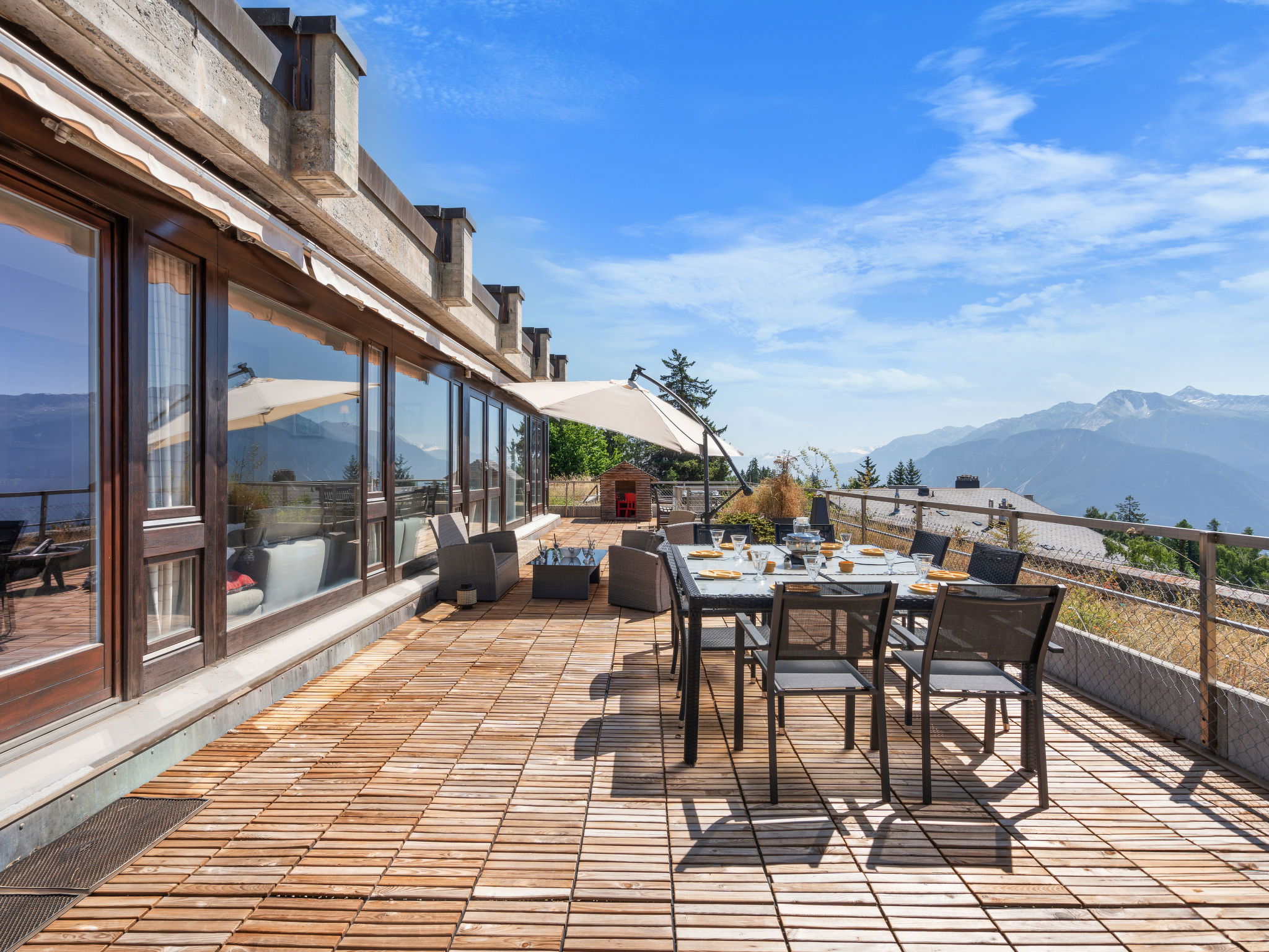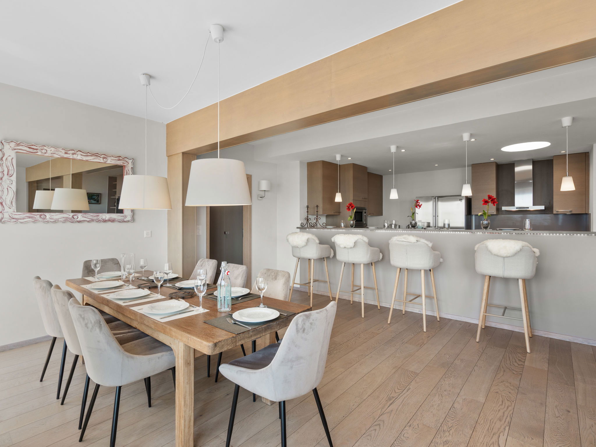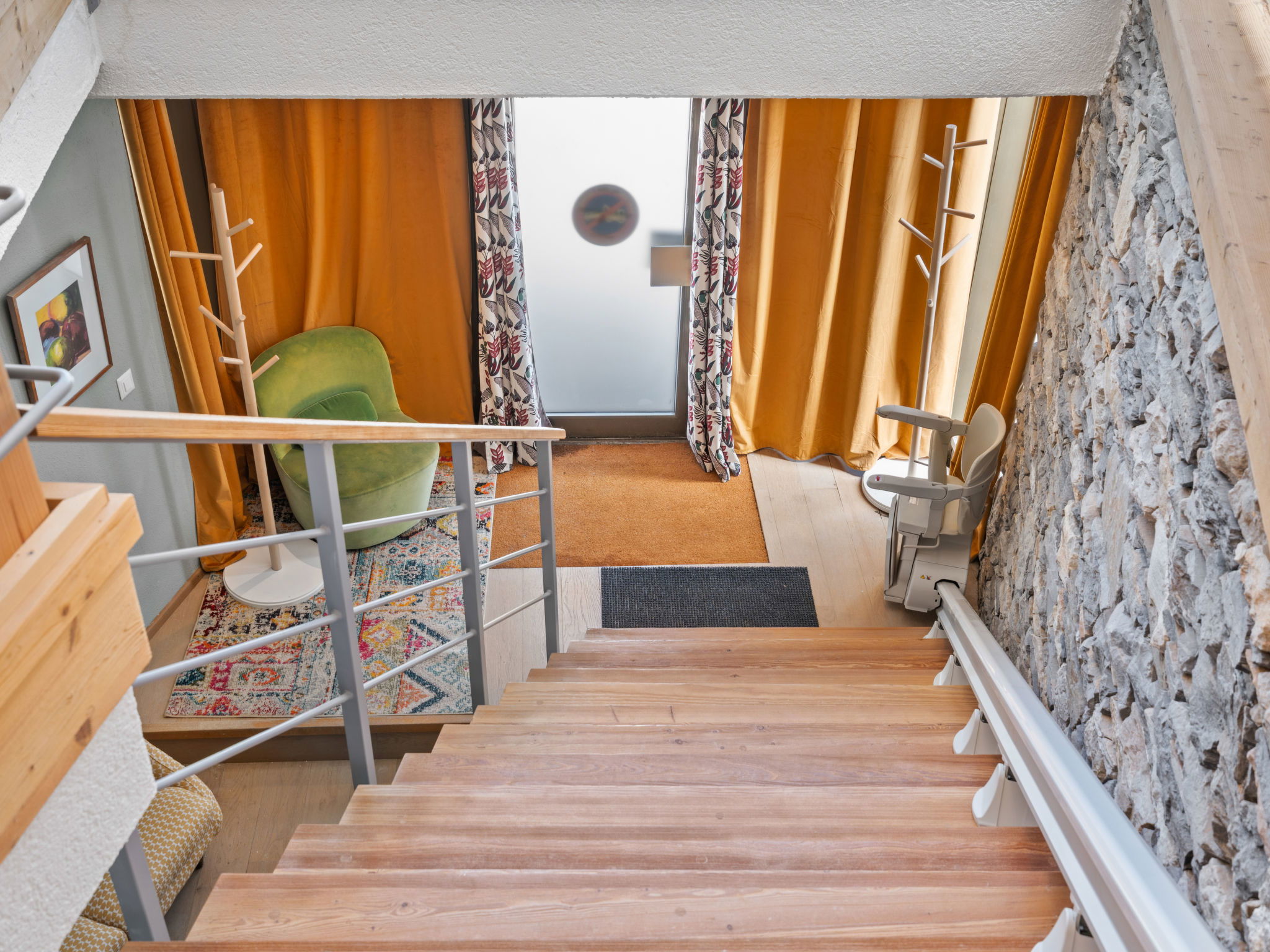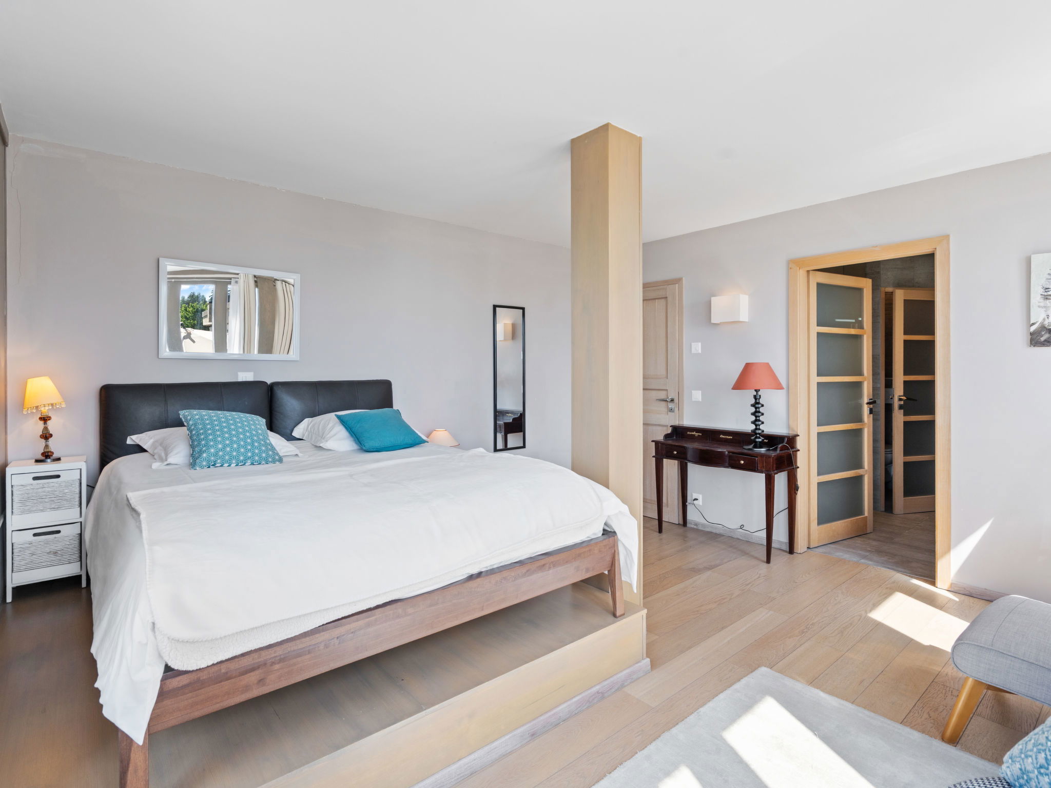 "Jeanne D'Arc LOFT COMBI", 10-room maisonette 350 m2, south facing position. Spacious, comfortable and tasteful furnishings: large living/dining room with open-hearth fireplace, dining table and cable TV. Exit to the terrace. 1 room with 1 french bed (160 cm, length 200 cm), bath/WC, double hand-basin and cable TV. 1 room with 2 beds (80 cm, length 200 cm), shower/WC. 1 room with 2 beds (80 cm, length 200 cm), shower/WC. Exit to the terrace. 1 room with 2 beds (90 cm, length 190 cm), shower/WC. 1 room with 1 french bed (160 cm, length 200 cm), bath/WC and double hand-basin. Exit to the terrace. 1 room with 1 double bed (2 x 90 cm, length 200 cm), shower/WC. Exit to the terrace. Open kitchen (oven, dishwasher, 4 ceramic glass hob hotplates, toaster, kettle, microwave, freezer, electric coffee machine, Capsules for coffee machine (Nespresso) extra, raclette grill, fondue Set (chinoise)) with bar. Sep. WC. On the lower ground floor: (spiral staircase) large playroom with bar. Large lounge. Sep. WC, Sauna. Large terrace 50 m2, south facing position, large terrace 50 m2, south facing position and, east facing position. Terrace furniture, barbecue (portable). Very beautiful panoramic view of the lake, the mountains, the valley and the countryside. Facilities: washing machine, dryer, iron, hair dryer. Internet (WiFi, free). Garage space n 21 (1 car) at 350 m, height 200 cm, width 290 cm. Please note: suitable for families. Non-smoking house. Private entrance, no lift. Combination (connecting door) from 2 apartments. Electric stairlift available.