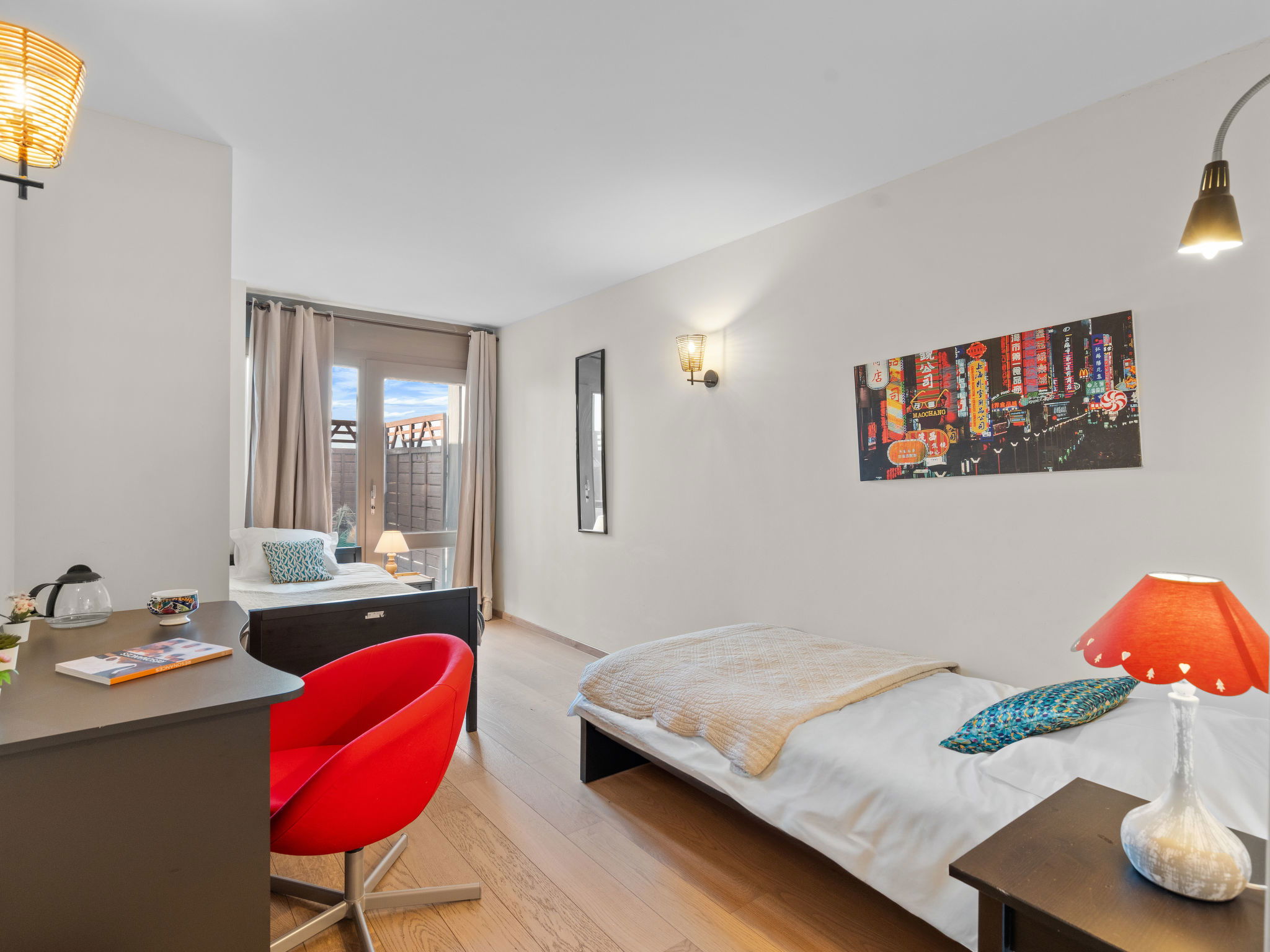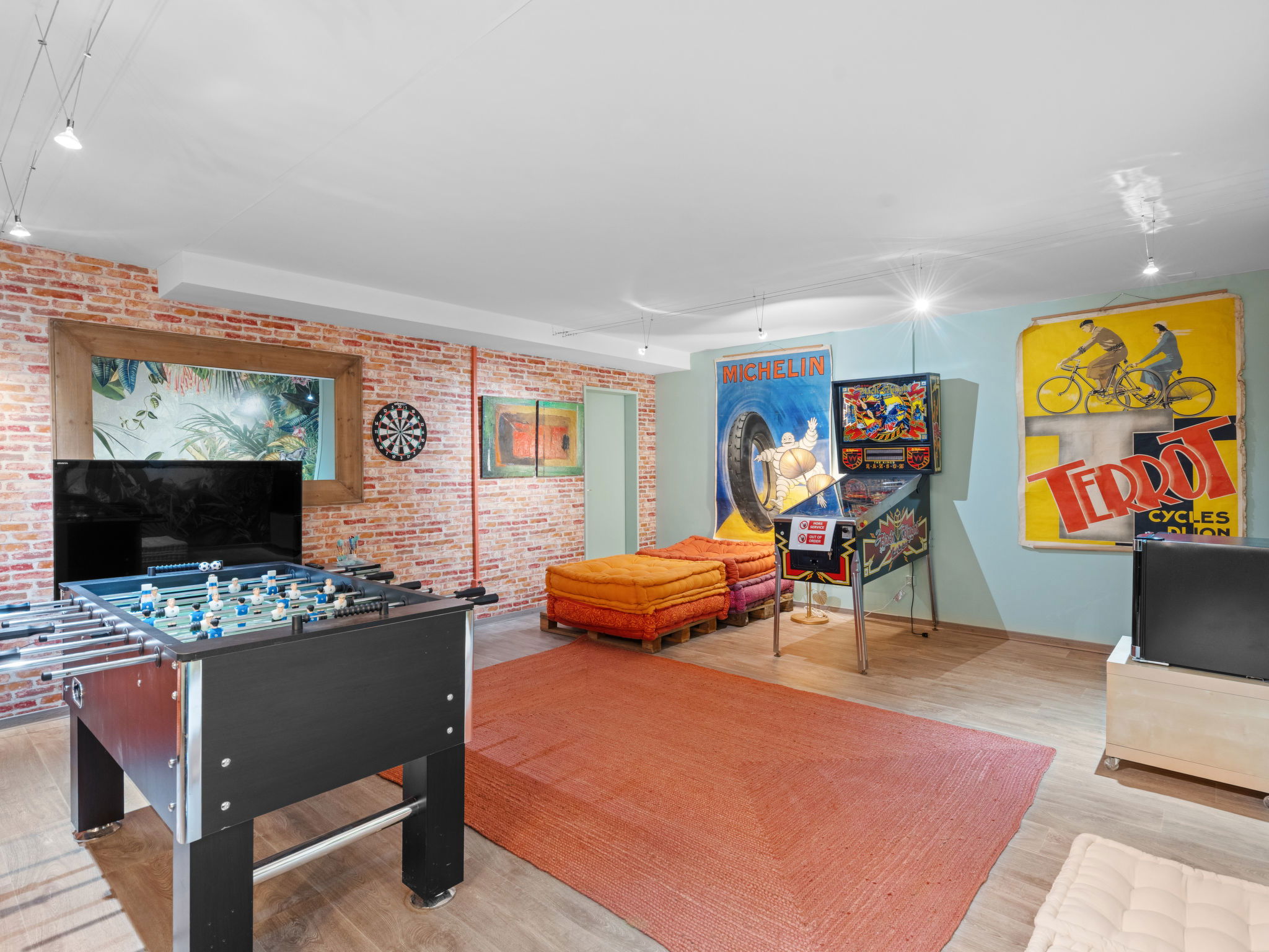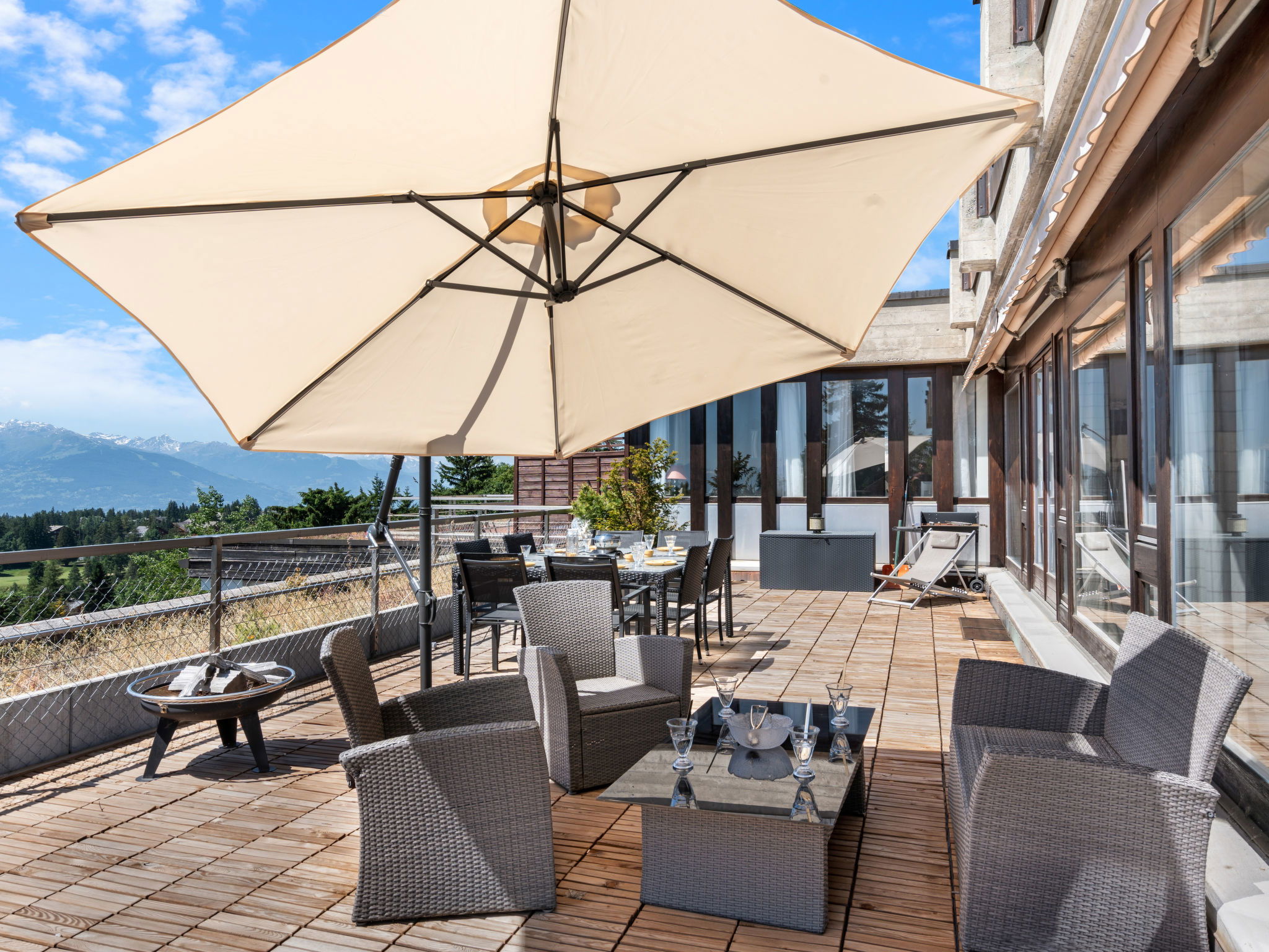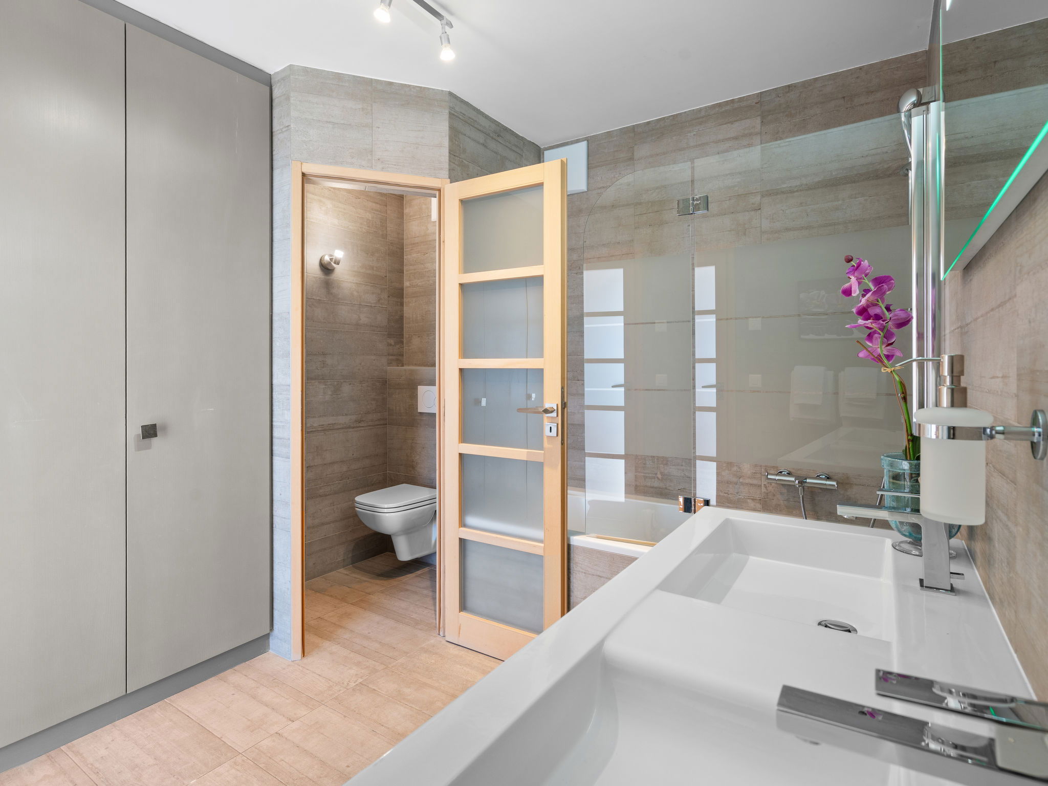 "Jeanne D'Arc LOFT COMBI", 10-room maisonette 350 m2, south facing position. Spacious, comfortable and tasteful furnishings: large living/dining room with open-hearth fireplace, dining table and cable TV. Exit to the terrace. 1 room with 1 french bed (160 cm, length 200 cm), bath/WC, double hand-basin and cable TV. 1 room with 2 beds (80 cm, length 200 cm), shower/WC. 1 room with 2 beds (80 cm, length 200 cm), shower/WC. Exit to the terrace. 1 room with 2 beds (90 cm, length 190 cm), shower/WC. 1 room with 1 french bed (160 cm, length 200 cm), bath/WC and double hand-basin. Exit to the terrace. 1 room with 1 double bed (2 x 90 cm, length 200 cm), shower/WC. Exit to the terrace. Open kitchen (oven, dishwasher, 4 ceramic glass hob hotplates, toaster, kettle, microwave, freezer, electric coffee machine, Capsules for coffee machine (Nespresso) extra, raclette grill, fondue Set (chinoise)) with bar. Sep. WC. On the lower ground floor: (spiral staircase) large playroom with bar. Large lounge. Sep. WC, Sauna. Large terrace 50 m2, south facing position, large terrace 50 m2, south facing position and, east facing position. Terrace furniture, barbecue (portable). Very beautiful panoramic view of the lake, the mountains, the valley and the countryside. Facilities: washing machine, dryer, iron, hair dryer. Internet (WiFi, free). Garage space n 21 (1 car) at 350 m, height 200 cm, width 290 cm. Please note: suitable for families. Non-smoking house. Private entrance, no lift. Combination (connecting door) from 2 apartments. Electric stairlift available.