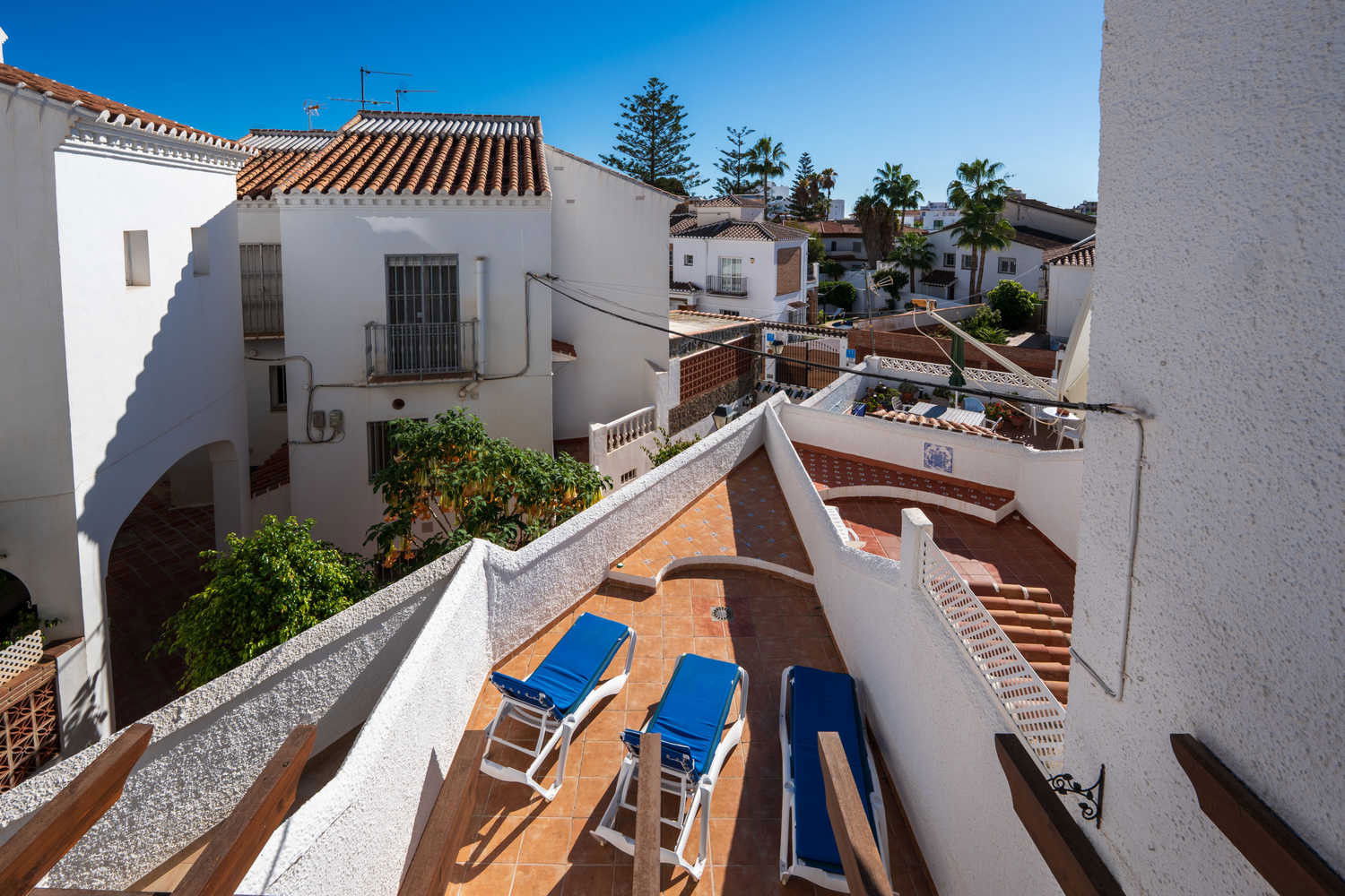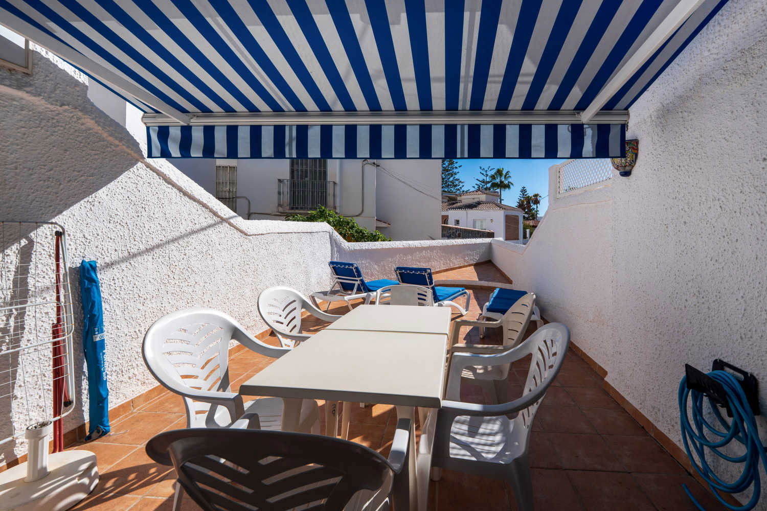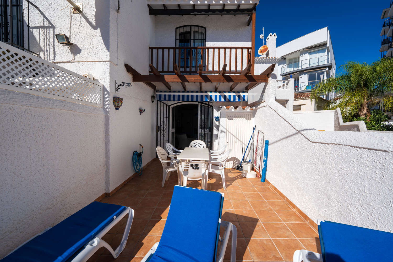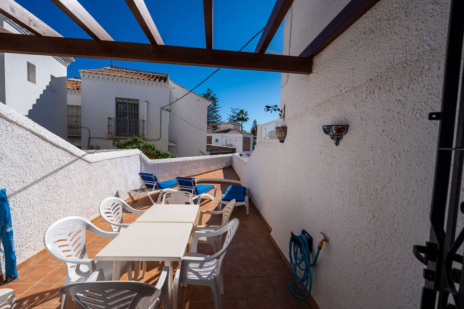 Semi-detached house in the Parador Nerja area with private terrace and swimming poolEnjoy the comfort of this house located in one of the most sought-after areas of Nerja. Upon entering, you will find a space designed for practical living: you can prepare breakfast in your fully equipped open-plan kitchen and step directly onto the terrace with sun loungers to enjoy the morning sun without leaving home. This semi-detached property combines the spaciousness of a family home with proximity to the town's key amenities, ideal for those seeking independence and sunshine in an established residential area. Functional layout on two levels for 4 peopleThe house has 80 m² optimised for relaxation. The 2 bedrooms with single beds are positioned to ensure privacy, supported by a full bathroom with bathtub and an additional toilet, which streamlines family logistics in the mornings. The kitchen has an oven, washing machine and dishwasher, allowing for long stays in complete comfort. The living room, equipped with Wi-Fi for teleworking and satellite TV, is a cool meeting place thanks to the air conditioning system. Private 15 m² terrace and access to communal swimming pool The private outdoor area is the distinguishing feature of Los Pinos 29. The terrace is large enough for al fresco dining or relaxing on the sun loungers. For swimming, the development offers a well-maintained communal swimming pool. It is important to note that the complex is divided into two areas, so to access the pool area you will need to cross the street, a journey of just a few seconds that guarantees acoustic separation between the swimming area and your accommodation. Why choose Los Pinos 29 for your holiday?✔ Strategic location: It is located just 600 metres from Burriana Beach, avoiding the steeper slopes of other areas.