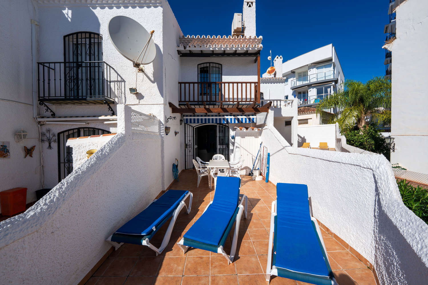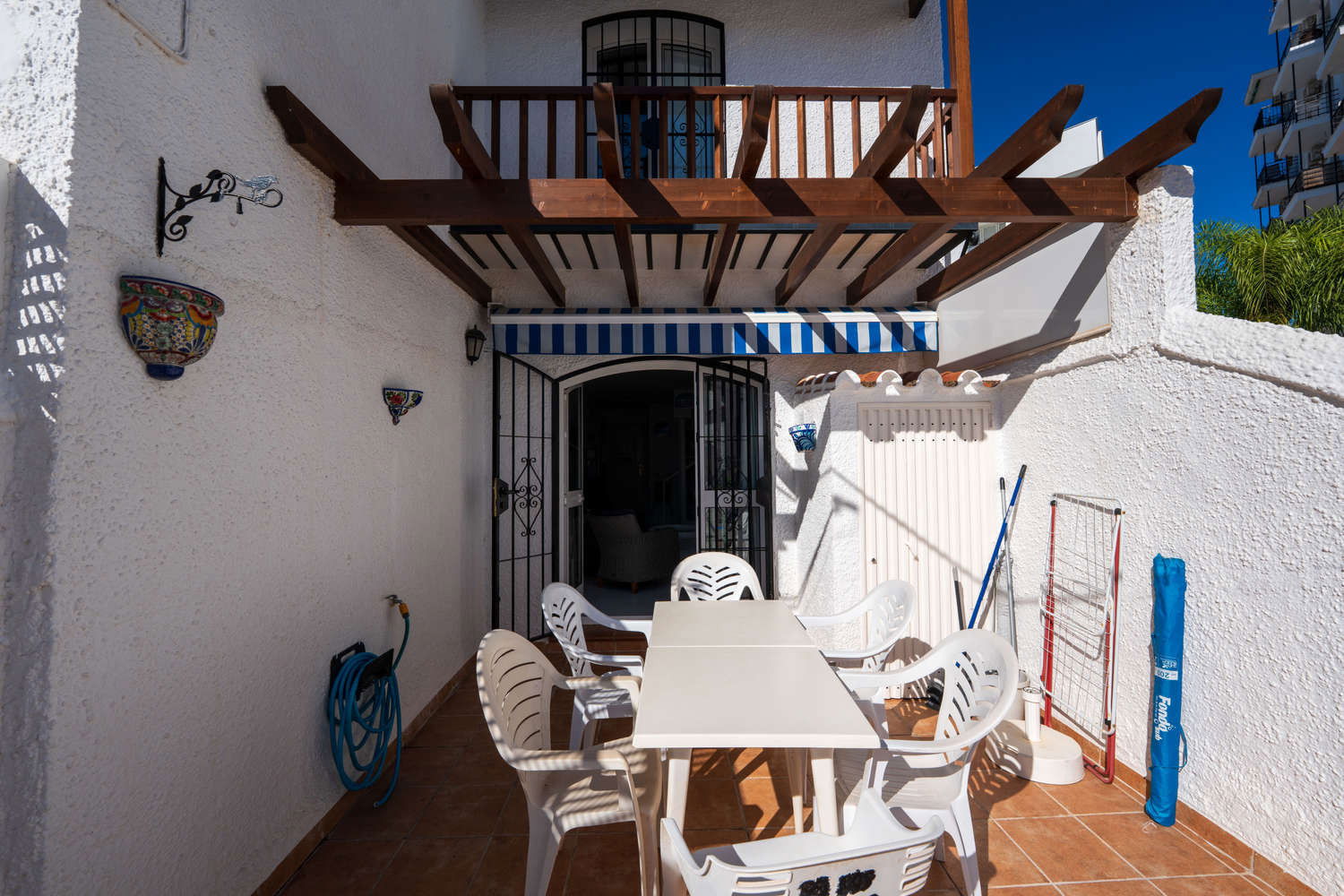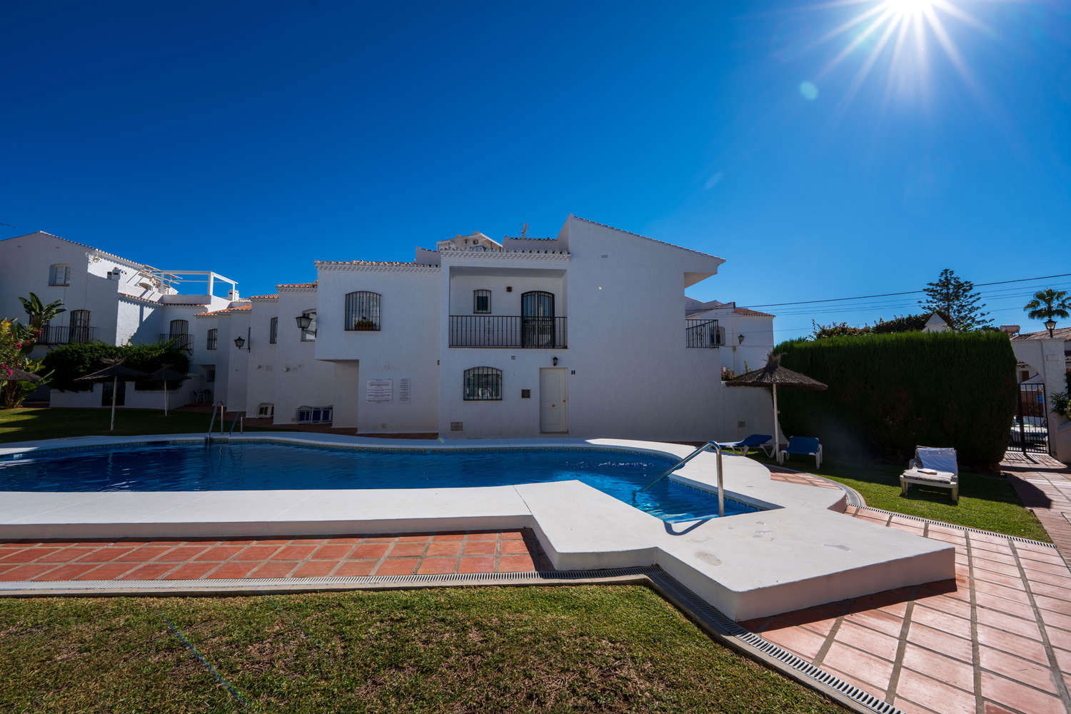 Semi-detached house in the Parador Nerja area with private terrace and swimming poolEnjoy the comfort of this house located in one of the most sought-after areas of Nerja. Upon entering, you will find a space designed for practical living: you can prepare breakfast in your fully equipped open-plan kitchen and step directly onto the terrace with sun loungers to enjoy the morning sun without leaving home. This semi-detached property combines the spaciousness of a family home with proximity to the town's key amenities, ideal for those seeking independence and sunshine in an established residential area. Functional layout on two levels for 4 peopleThe house has 80 m² optimised for relaxation. The 2 bedrooms with single beds are positioned to ensure privacy, supported by a full bathroom with bathtub and an additional toilet, which streamlines family logistics in the mornings. The kitchen has an oven, washing machine and dishwasher, allowing for long stays in complete comfort. The living room, equipped with Wi-Fi for teleworking and satellite TV, is a cool meeting place thanks to the air conditioning system. Private 15 m² terrace and access to communal swimming pool The private outdoor area is the distinguishing feature of Los Pinos 29. The terrace is large enough for al fresco dining or relaxing on the sun loungers. For swimming, the development offers a well-maintained communal swimming pool. It is important to note that the complex is divided into two areas, so to access the pool area you will need to cross the street, a journey of just a few seconds that guarantees acoustic separation between the swimming area and your accommodation. Why choose Los Pinos 29 for your holiday?✔ Strategic location: It is located just 600 metres from Burriana Beach, avoiding the steeper slopes of other areas.