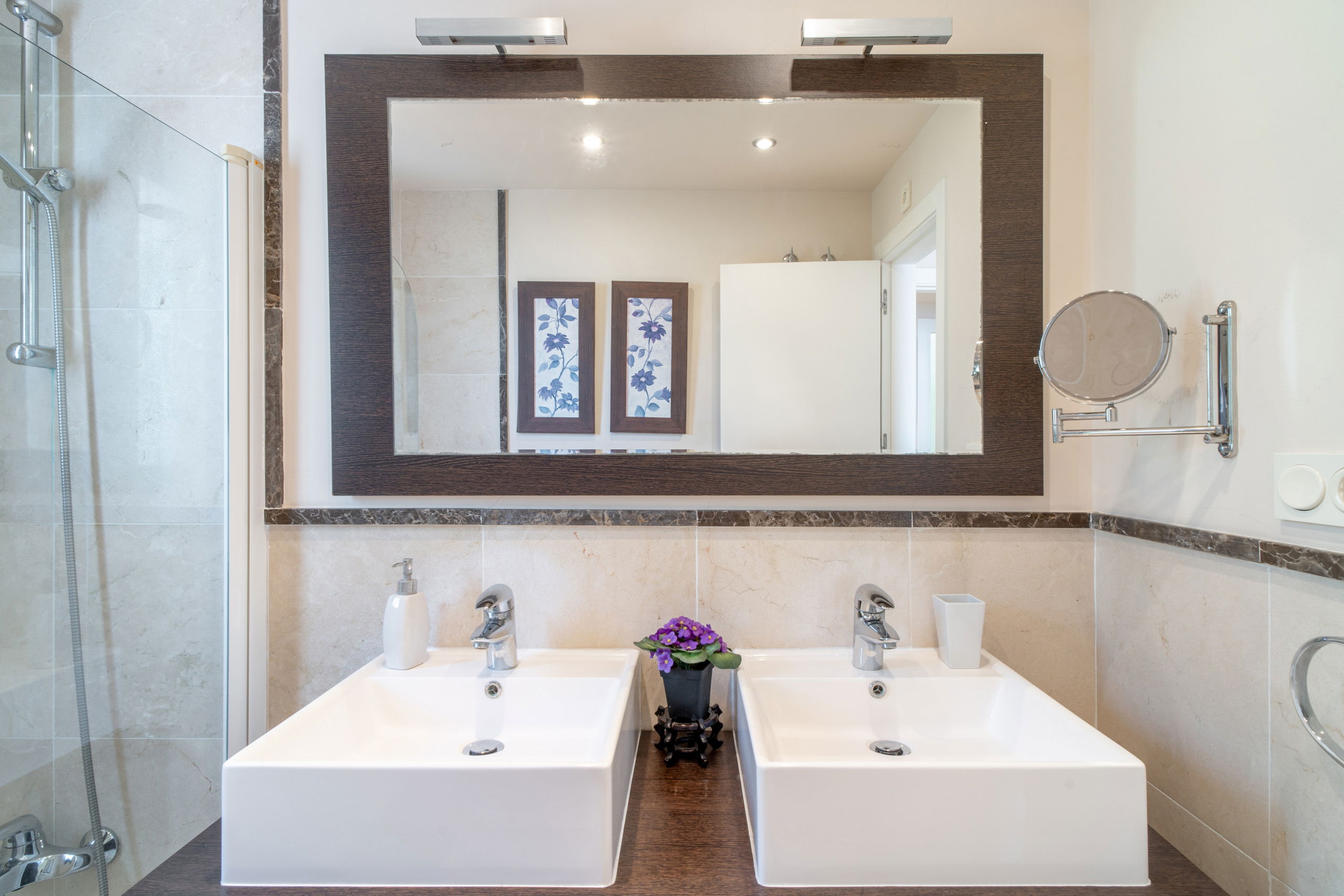 The flat has 2 bedrooms, one of them with double bed and en suite bathroom and the other with two single beds. It also has a fully equipped kitchen with state of the art appliances and centralised air conditioning.