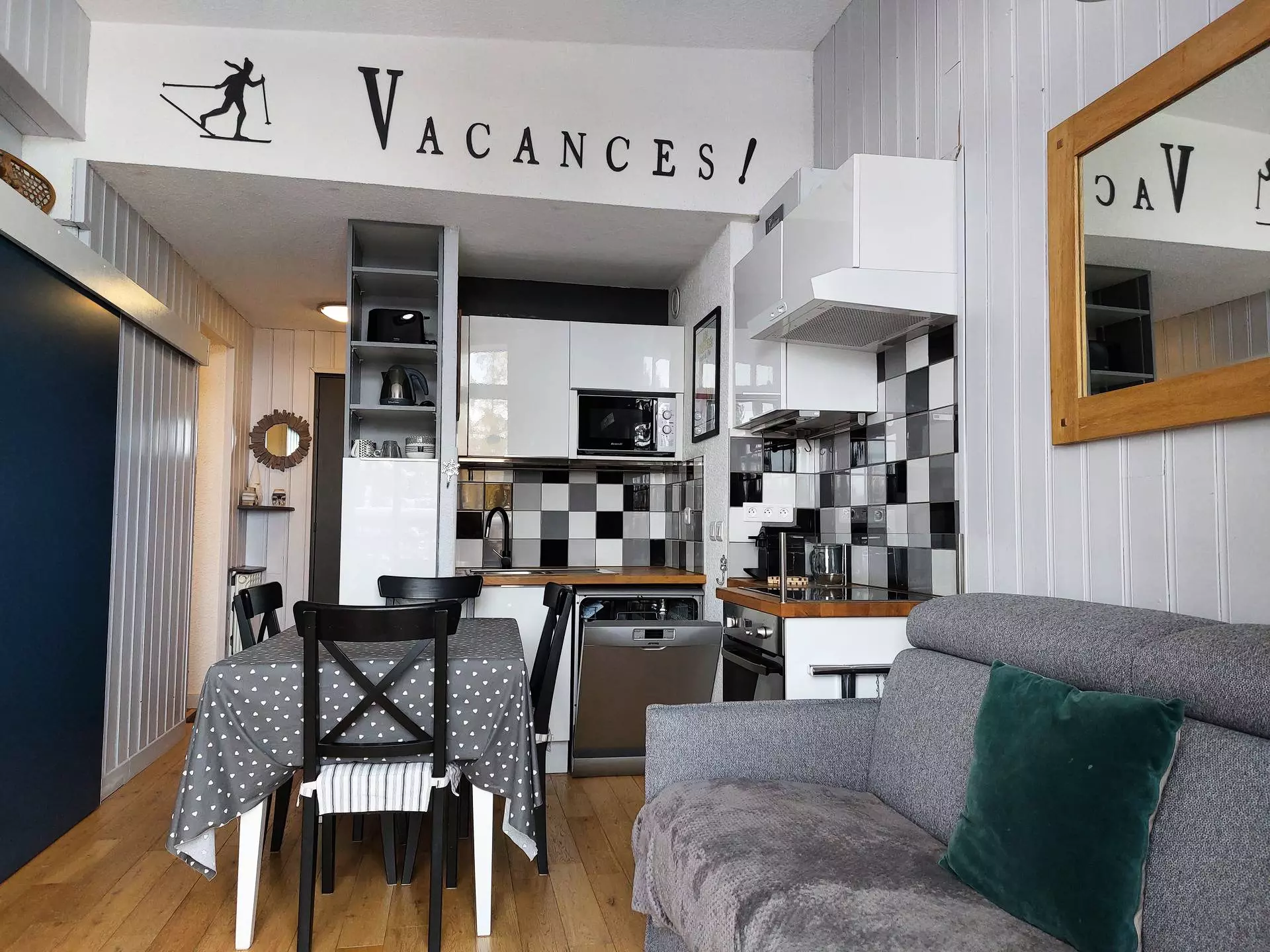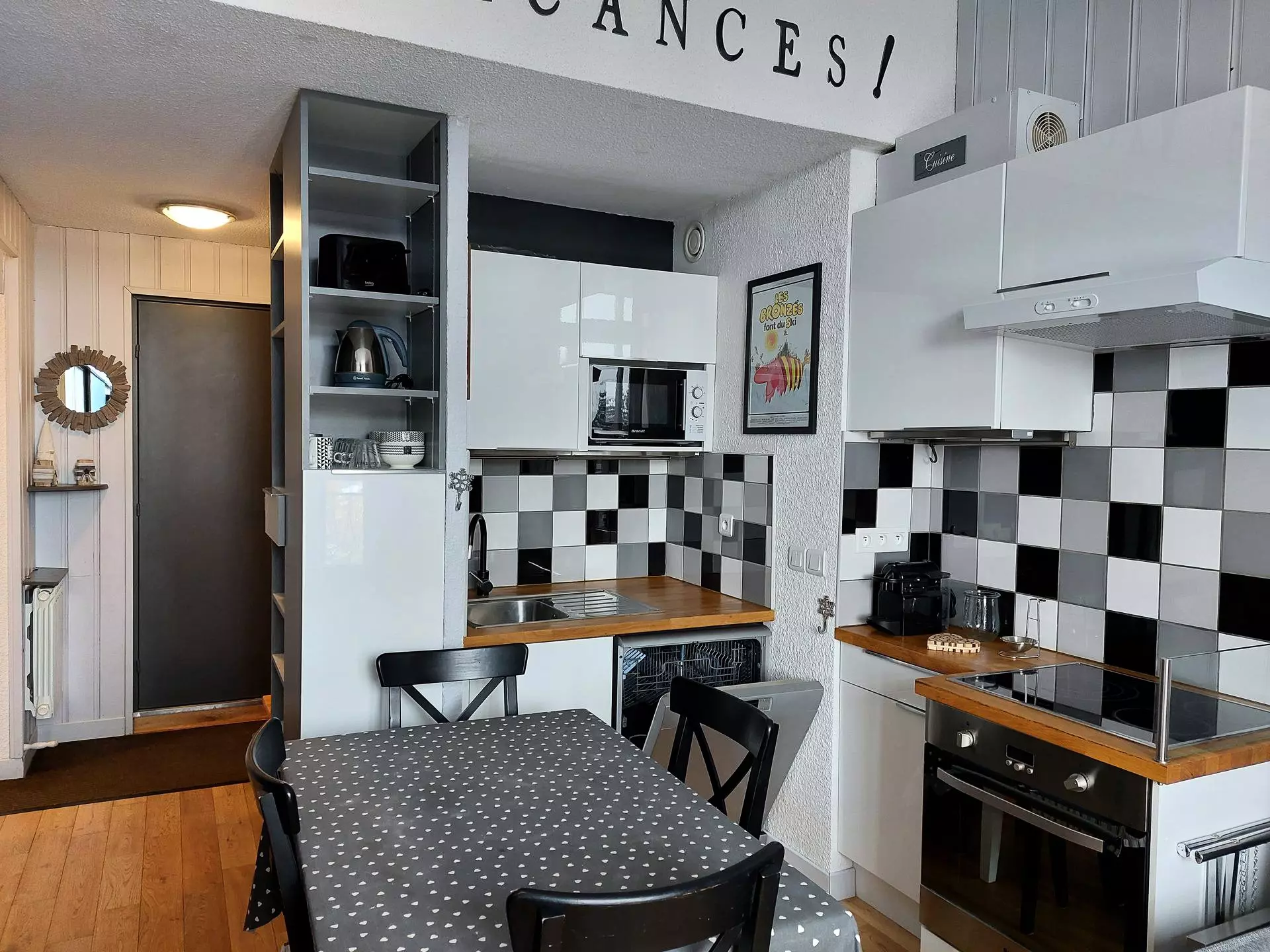 It is fully equipped with induction hobs, an oven, a refrigerator, a dishwasher, a toaster, a kettle, a coffee maker and a microwave.