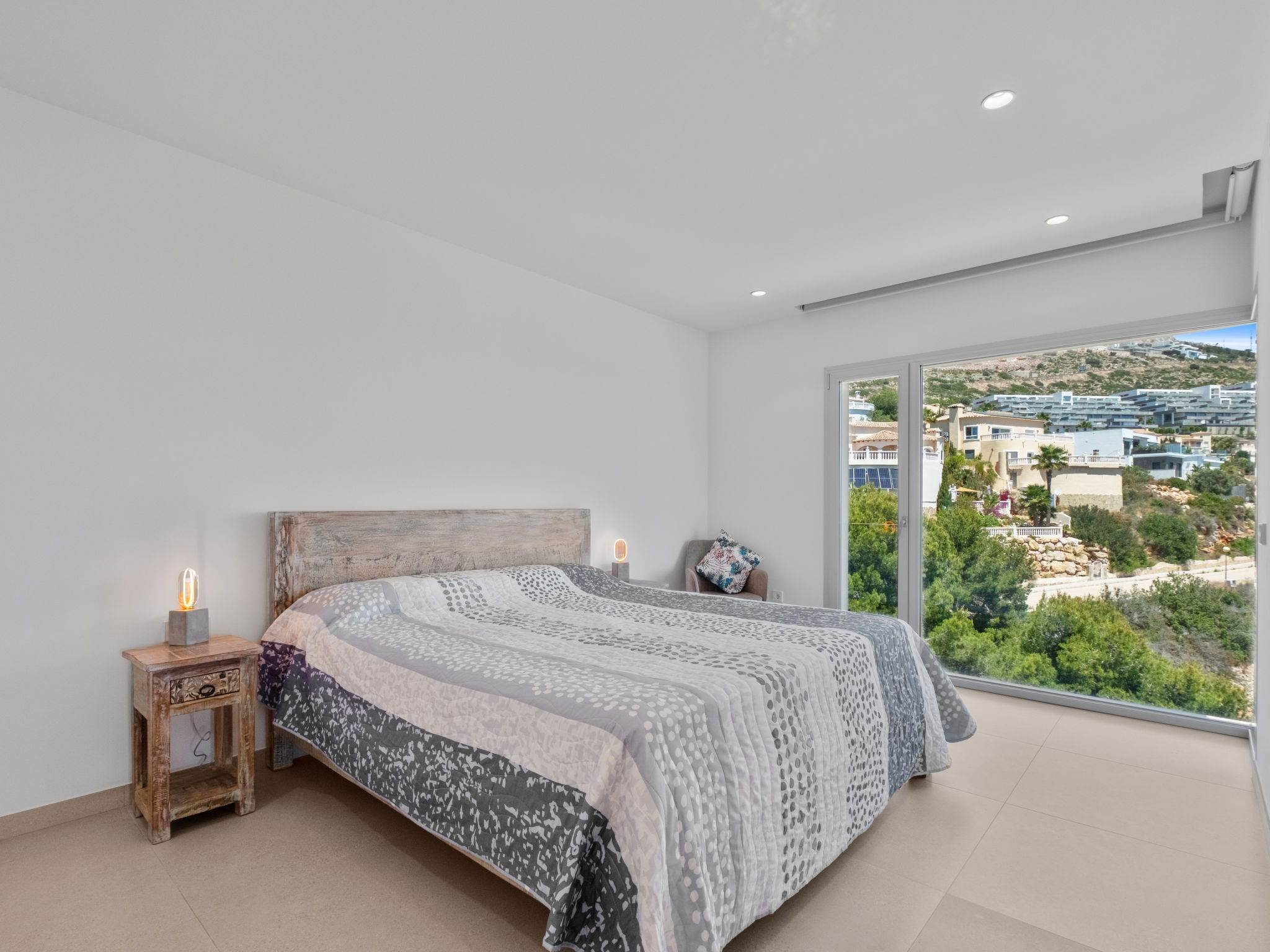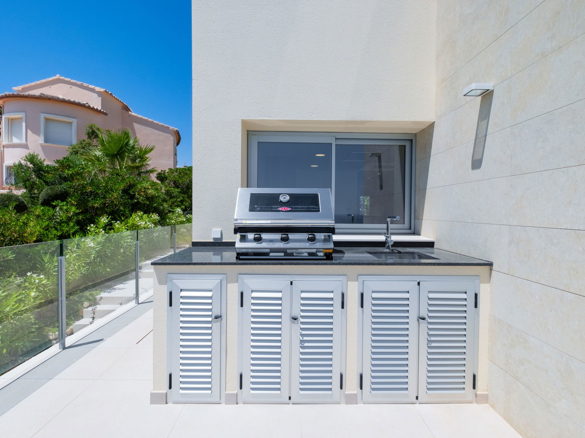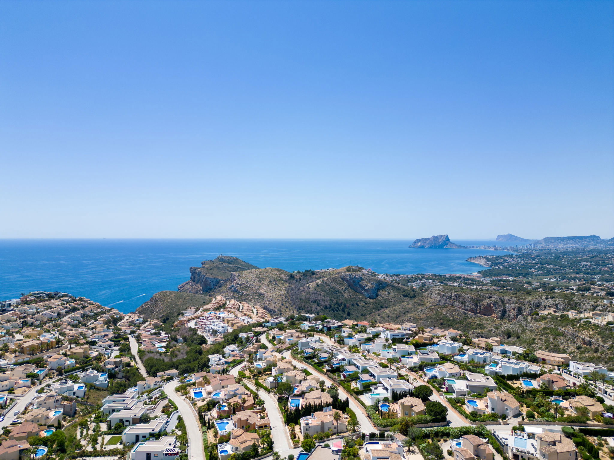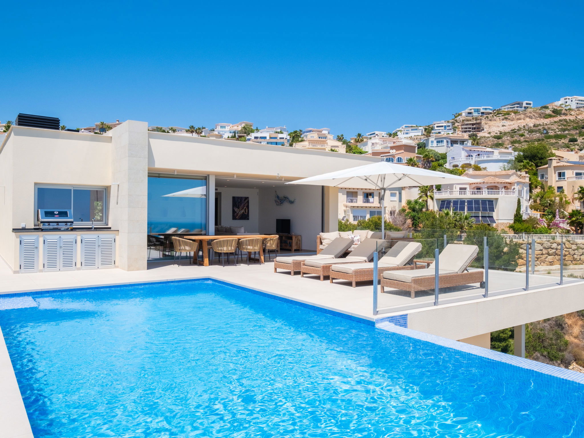 Cumbre del Sol: Very modern, beautiful villa "Iris", 2 storeys, built in 2025. 6 km from the centre of Moraira, in a quiet, sunny position residential area (villas), traffic calmed area, 2 km from the sea, 2 km from the beach. Private: property 826 m2 (fenced), swimming pool (8 x 4 m, seasonal availability: 01.Jan. - 31.Dec.) with internal staircase. Outdoor shower, terrace, barbecue, parking at the house. Shop 3 km, grocery 3 km, supermarket 3 km, restaurant 4 km, bus stop 3 km, sandy beach "Playa L'Ampolla" 7 km, rocky beach "Cala del Moraig" 2 km. Sports harbour 7 km, marina 7 km, golf course (12 hole) 10 km. Nearby attractions: Aqualandia, Mundomar, Terra Mítica, Terra Natura, Benidorm Palace (Benidorm), Les Fonts de l'Algar, Castillo de Guadalest. The owner does not accept any youth groups.