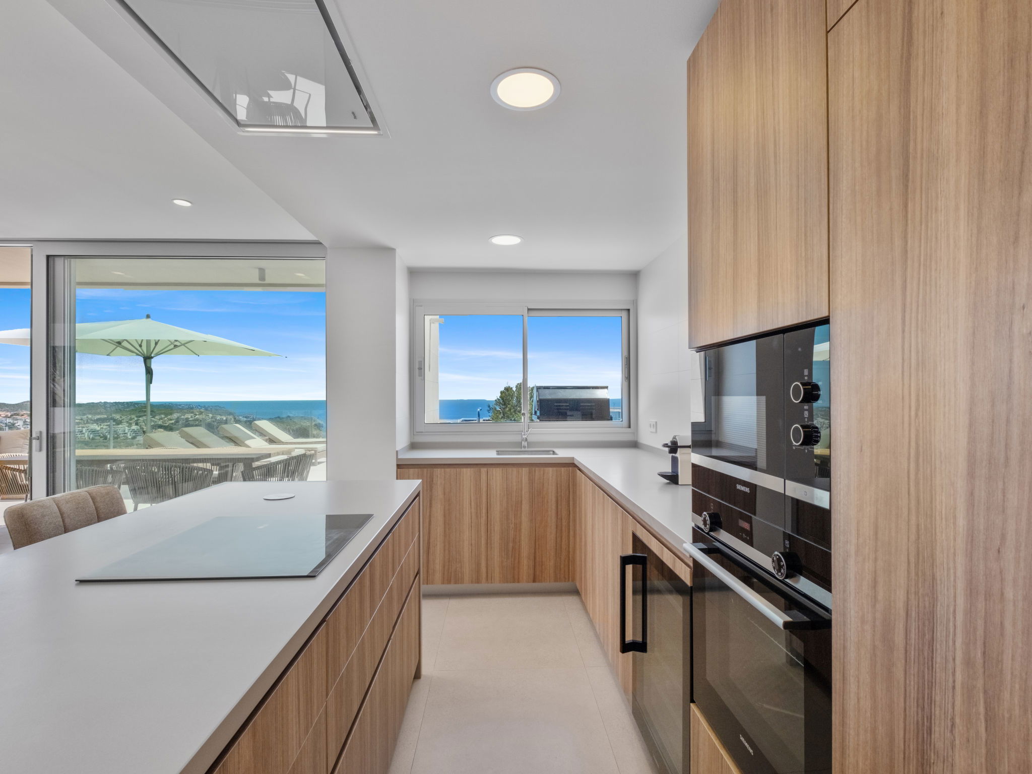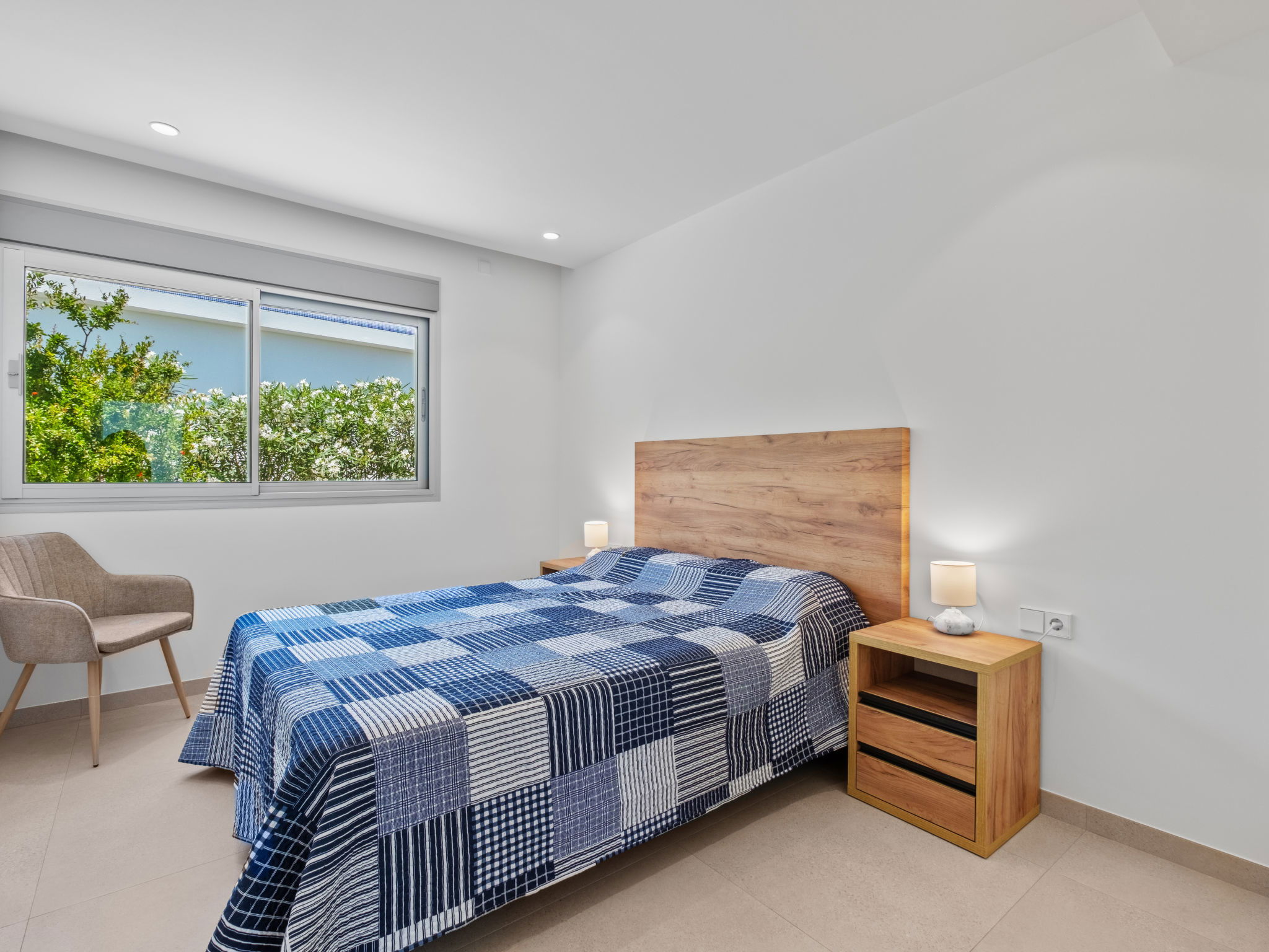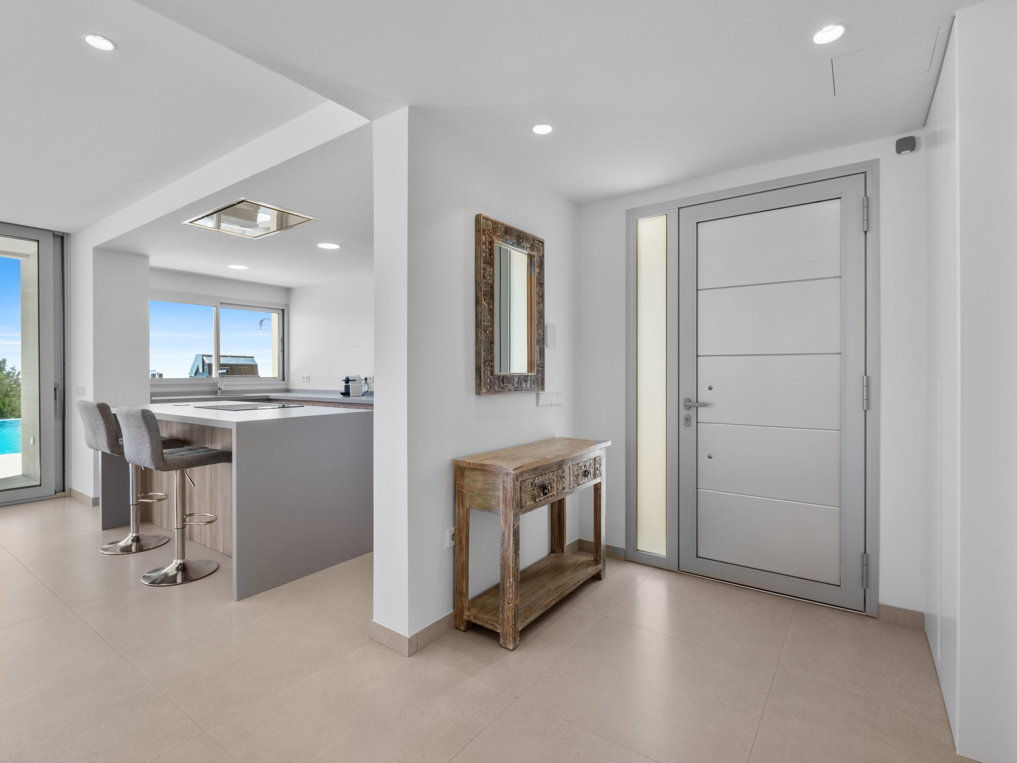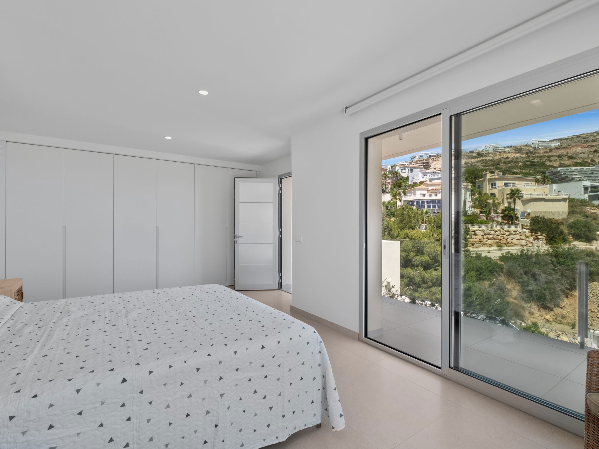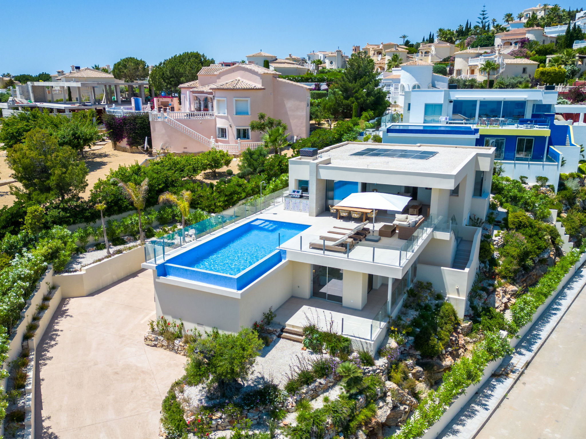 Cumbre del Sol: Very modern, beautiful villa "Iris", 2 storeys, built in 2025. 6 km from the centre of Moraira, in a quiet, sunny position residential area (villas), traffic calmed area, 2 km from the sea, 2 km from the beach. Private: property 826 m2 (fenced), swimming pool (8 x 4 m, seasonal availability: 01.Jan. - 31.Dec.) with internal staircase. Outdoor shower, terrace, barbecue, parking at the house. Shop 3 km, grocery 3 km, supermarket 3 km, restaurant 4 km, bus stop 3 km, sandy beach "Playa L'Ampolla" 7 km, rocky beach "Cala del Moraig" 2 km. Sports harbour 7 km, marina 7 km, golf course (12 hole) 10 km. Nearby attractions: Aqualandia, Mundomar, Terra Mítica, Terra Natura, Benidorm Palace (Benidorm), Les Fonts de l'Algar, Castillo de Guadalest. The owner does not accept any youth groups.