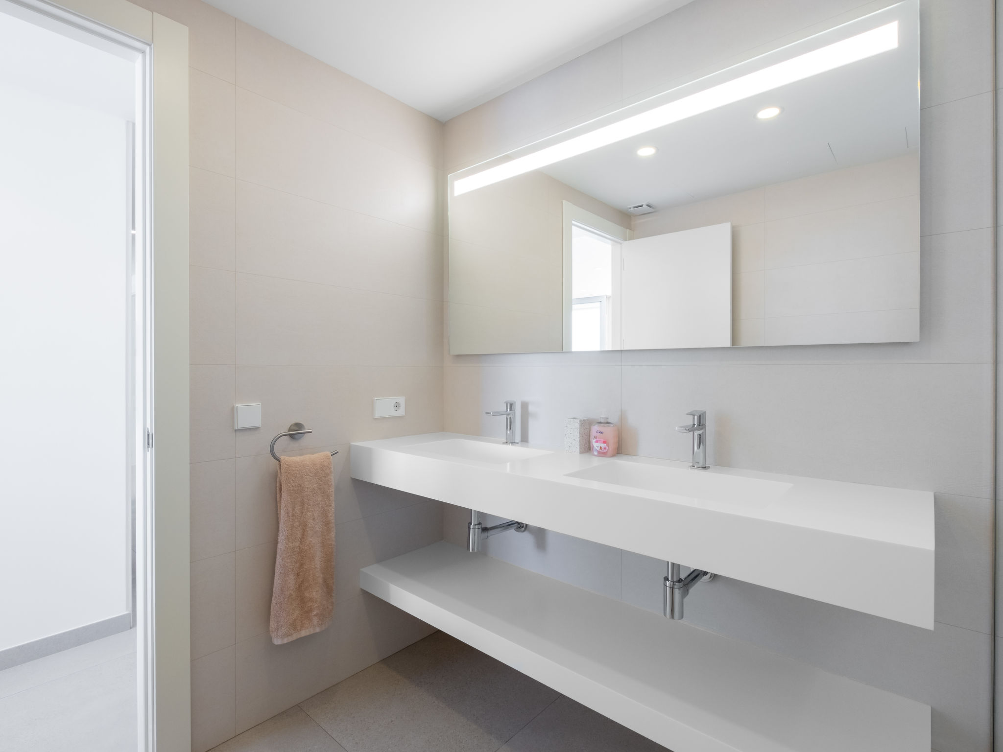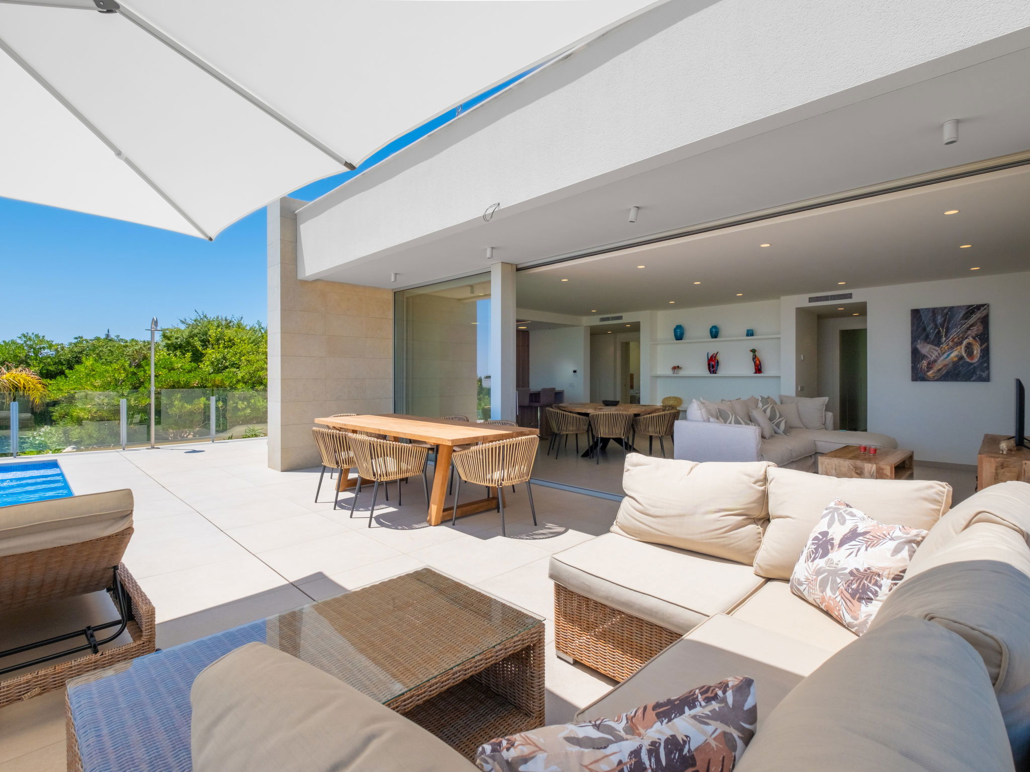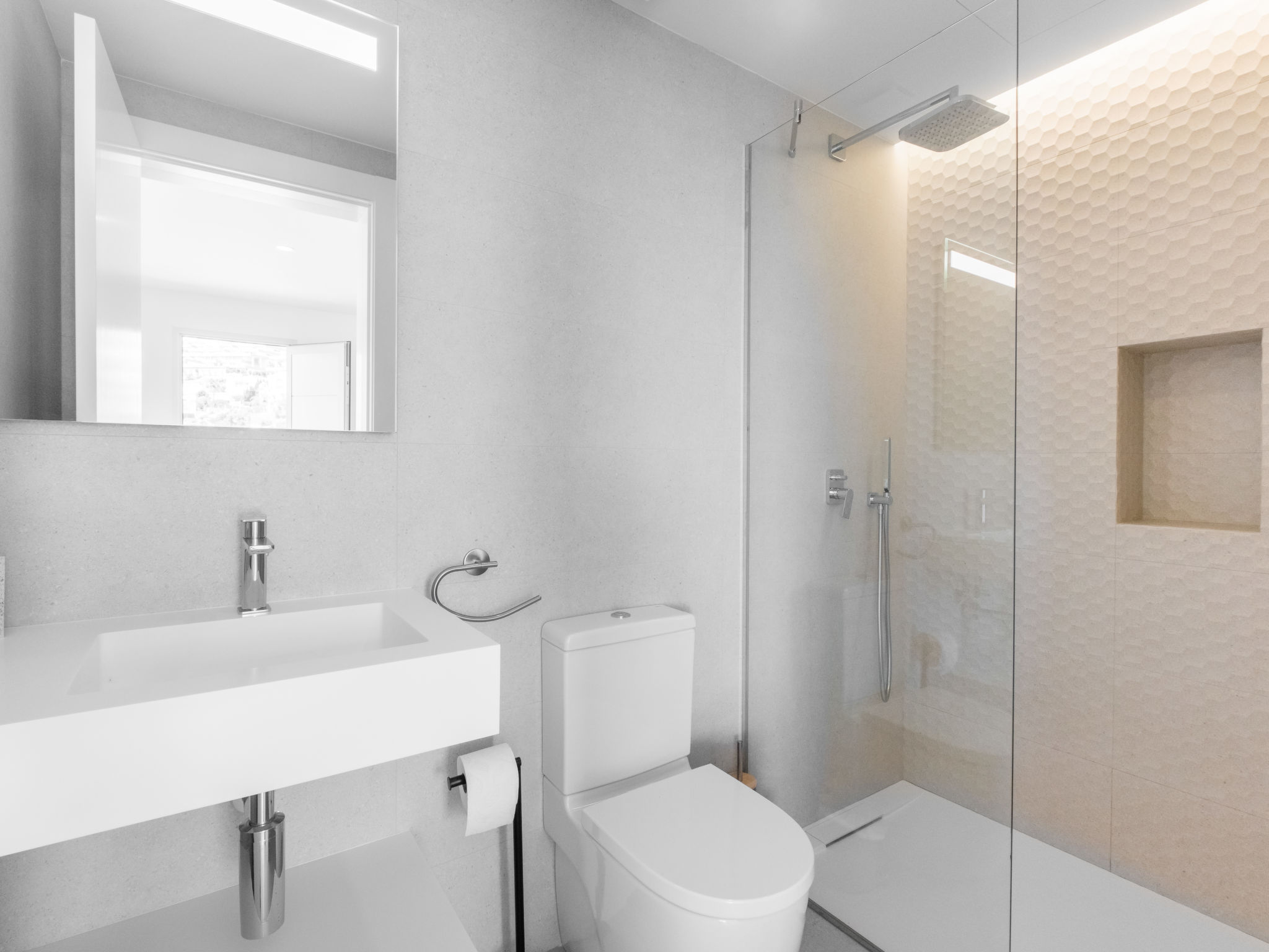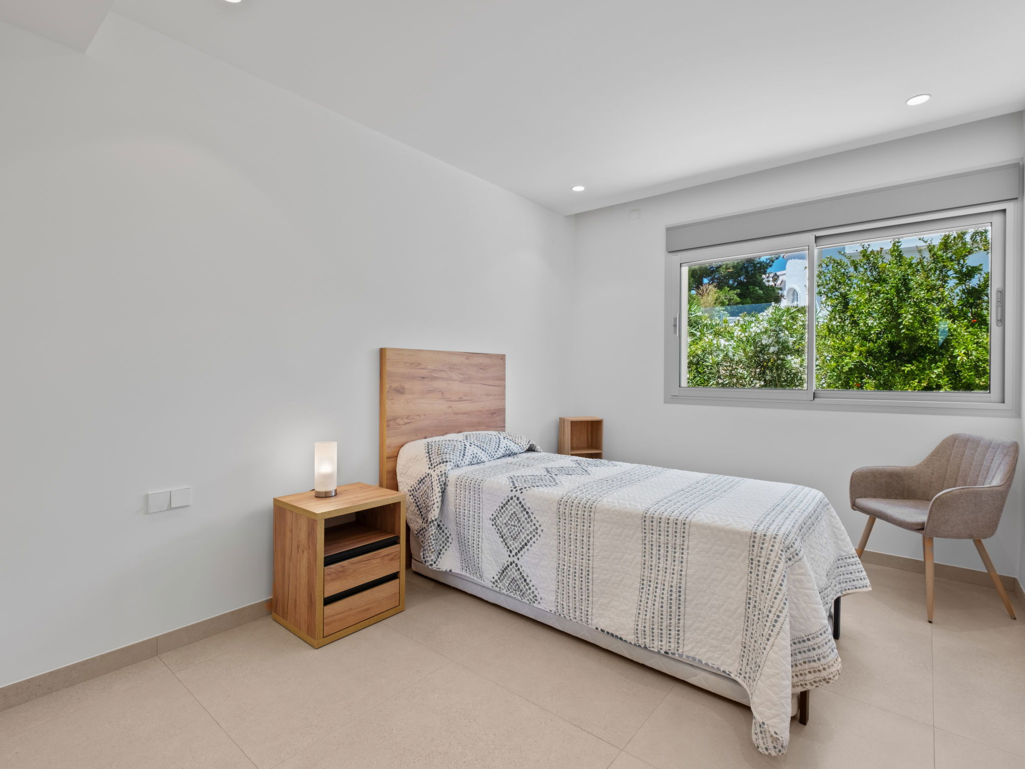 Cumbre del Sol: Very modern, beautiful villa "Iris", 2 storeys, built in 2025. 6 km from the centre of Moraira, in a quiet, sunny position residential area (villas), traffic calmed area, 2 km from the sea, 2 km from the beach. Private: property 826 m2 (fenced), swimming pool (8 x 4 m, seasonal availability: 01.Jan. - 31.Dec.) with internal staircase. Outdoor shower, terrace, barbecue, parking at the house. Shop 3 km, grocery 3 km, supermarket 3 km, restaurant 4 km, bus stop 3 km, sandy beach "Playa L'Ampolla" 7 km, rocky beach "Cala del Moraig" 2 km. Sports harbour 7 km, marina 7 km, golf course (12 hole) 10 km. Nearby attractions: Aqualandia, Mundomar, Terra Mítica, Terra Natura, Benidorm Palace (Benidorm), Les Fonts de l'Algar, Castillo de Guadalest. The owner does not accept any youth groups.