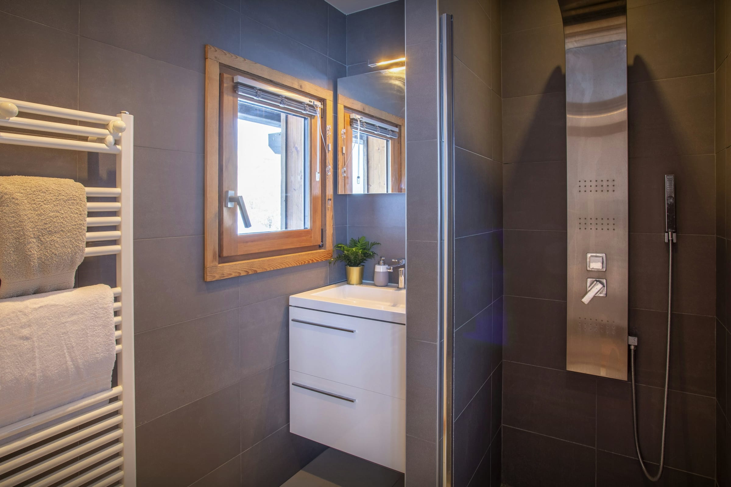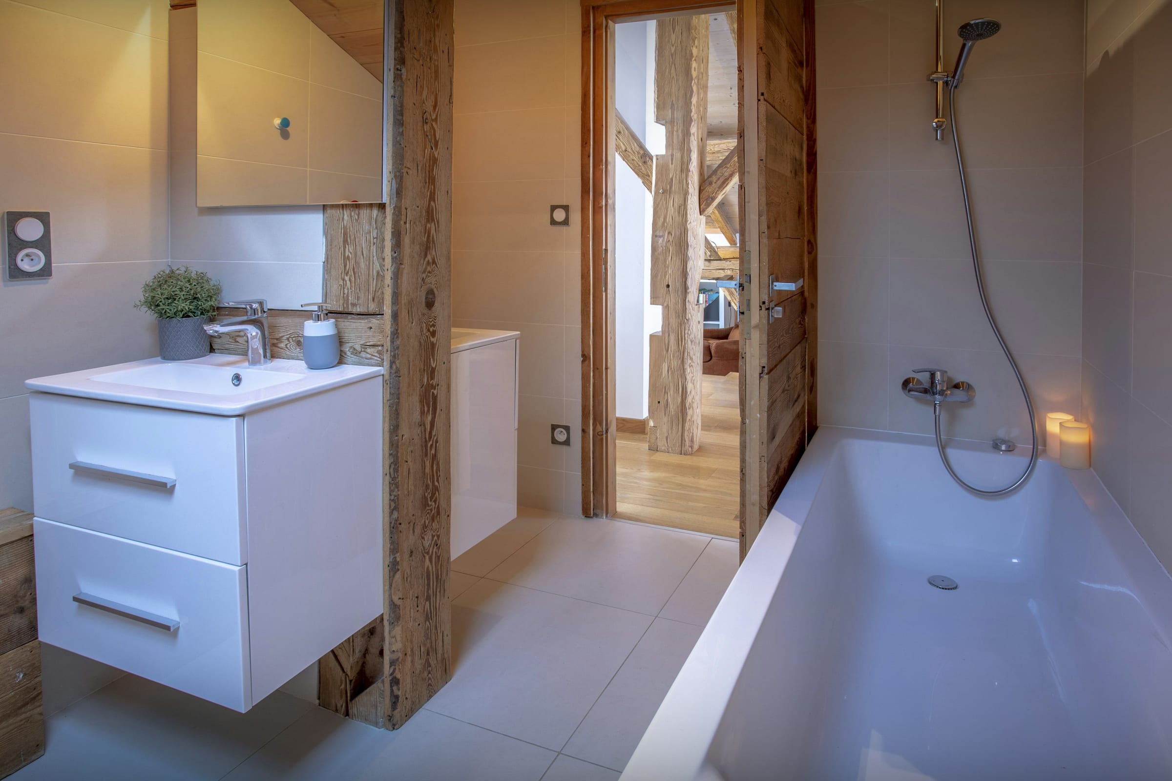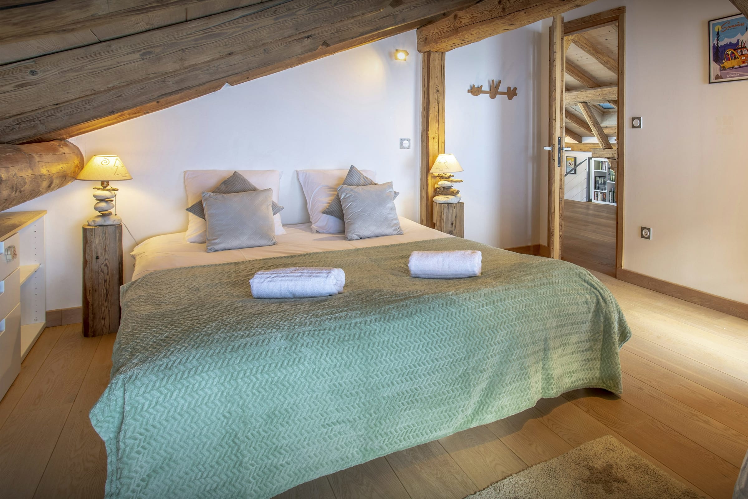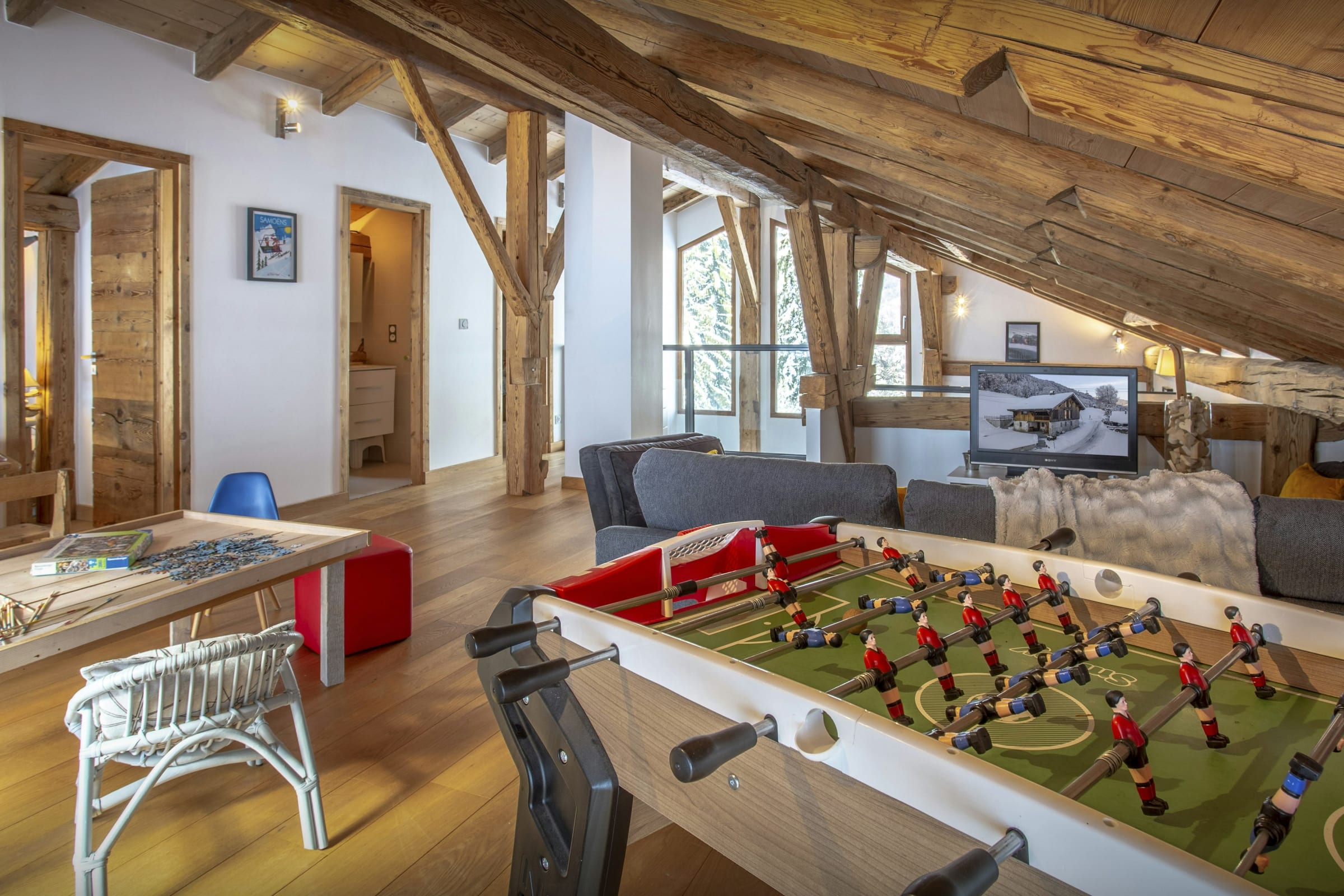 Chalet Pativerdan has four bedrooms - two doubles on the lower floor, and on the upper floor you'll find a double bedroom and another which sleeps four. These two share a bathroom and the beds can be arranged as doubles or twins, making for very flexible sleeping arrangements. There's also a super playroom with a TV on the mezzanine floor, making it a great family area. There's a sofa bed in the playroom too, should you need extra space.