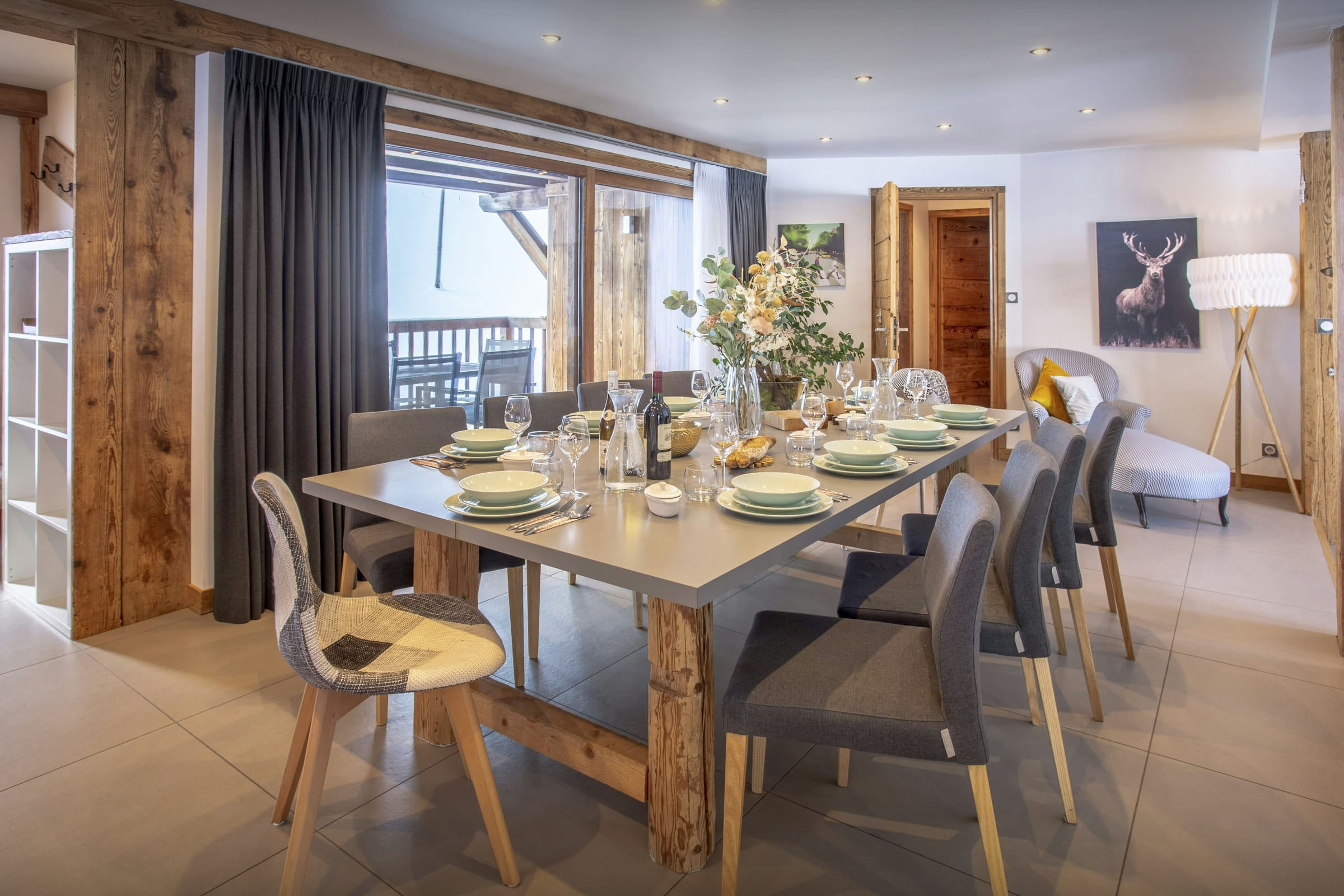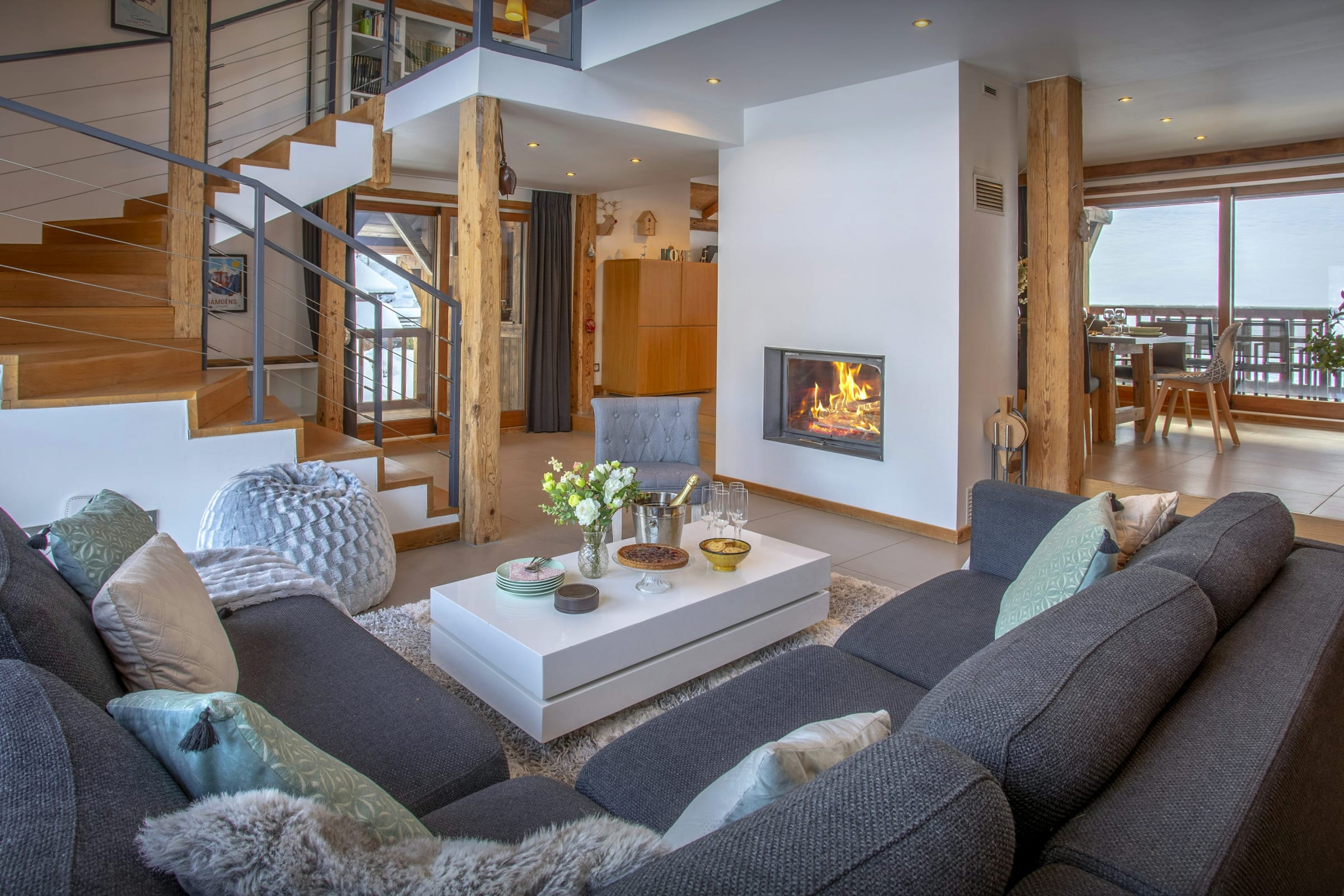 The living room is a great place to relax after an action-packed day in the mountains - light floods in through the double height windows and there's a covered terrace with seating and a hot tub. There's plenty of space in the kitchen for a couple of chefs to share the cooking, and a great breakfast bar for kids' suppers. The dining area is separated from the living area by a central fireplace, keeping both sides cosy!