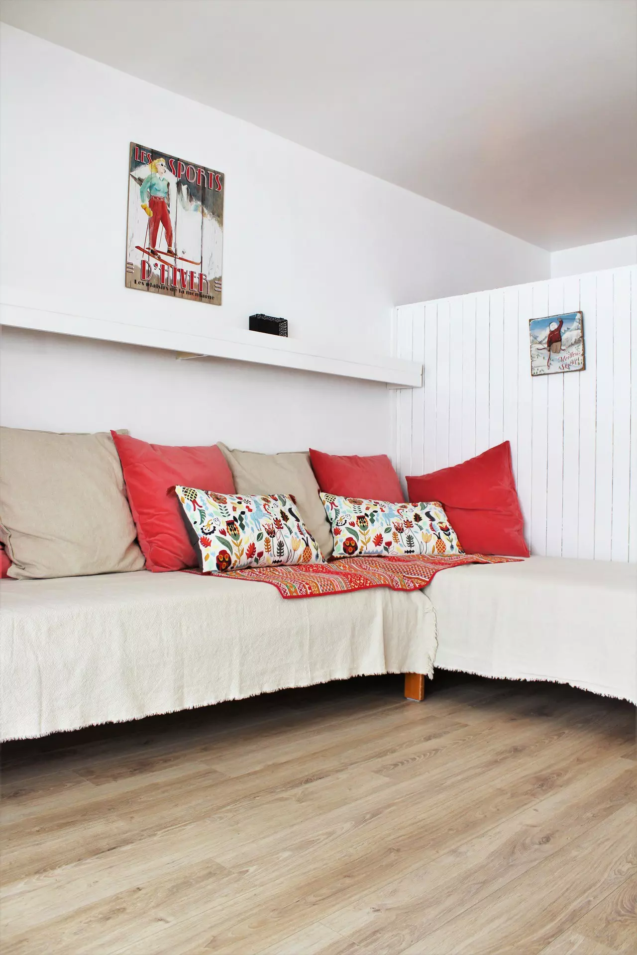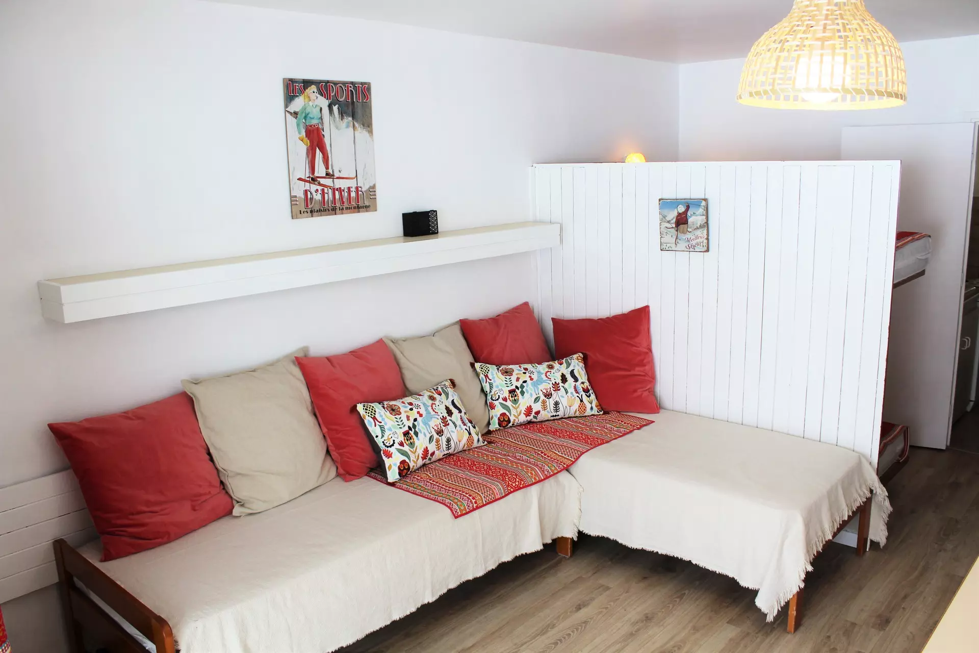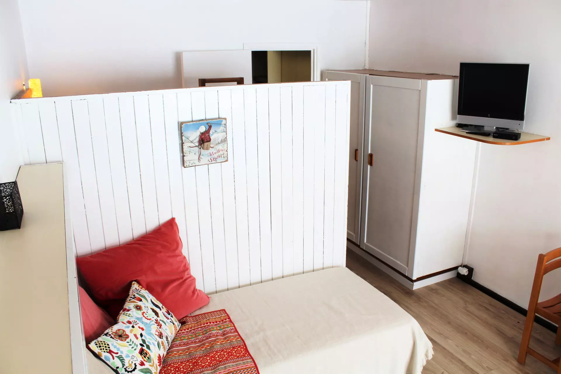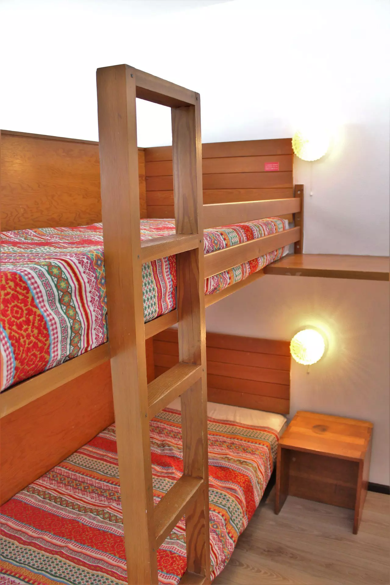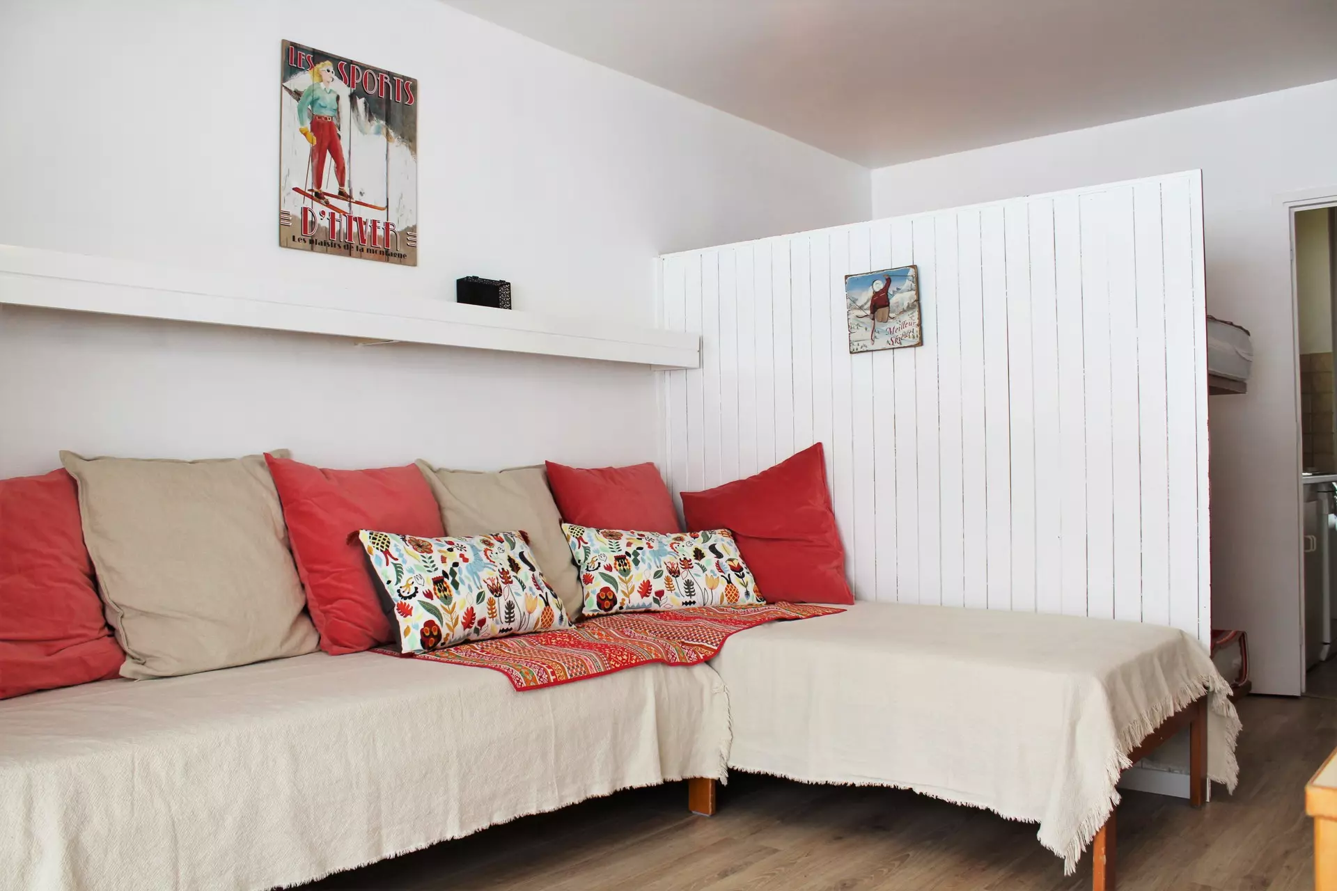 Living room with dining area and 2 single beds. Separated from the sleeping area (2 bunk beds) by a wooden partition, TV included.