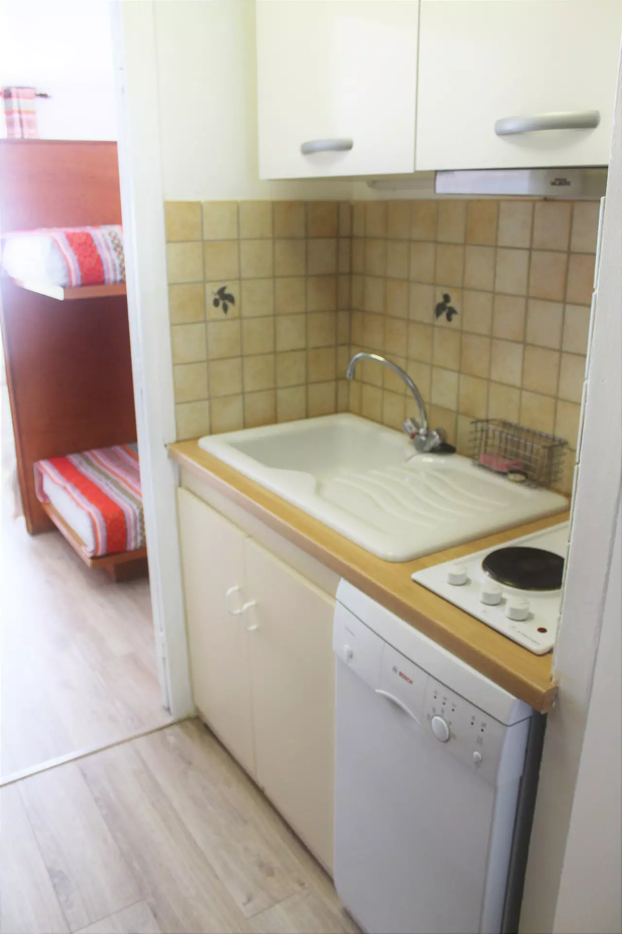 Kitchenette with 2 electric hotplates, oven and microwave, electric coffee maker, refrigerator and dishwasher.