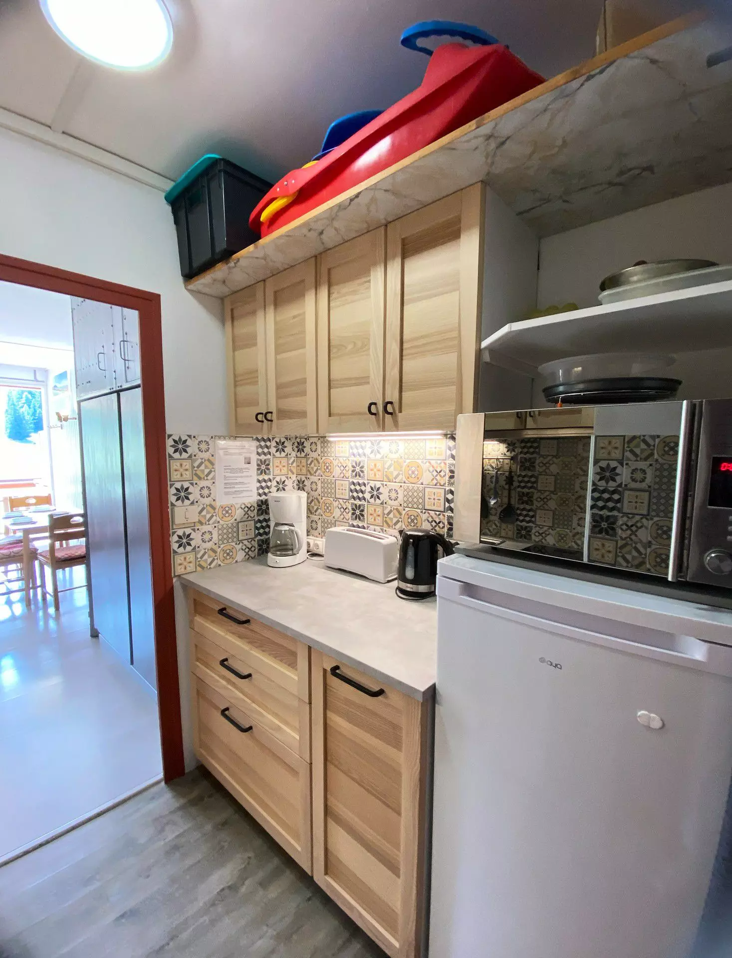 Studio with sleeping alcove. Living room with sofa bed, sleeping alcove with sofa bed and a mezzanine bed. Shower room with shower and toilet.