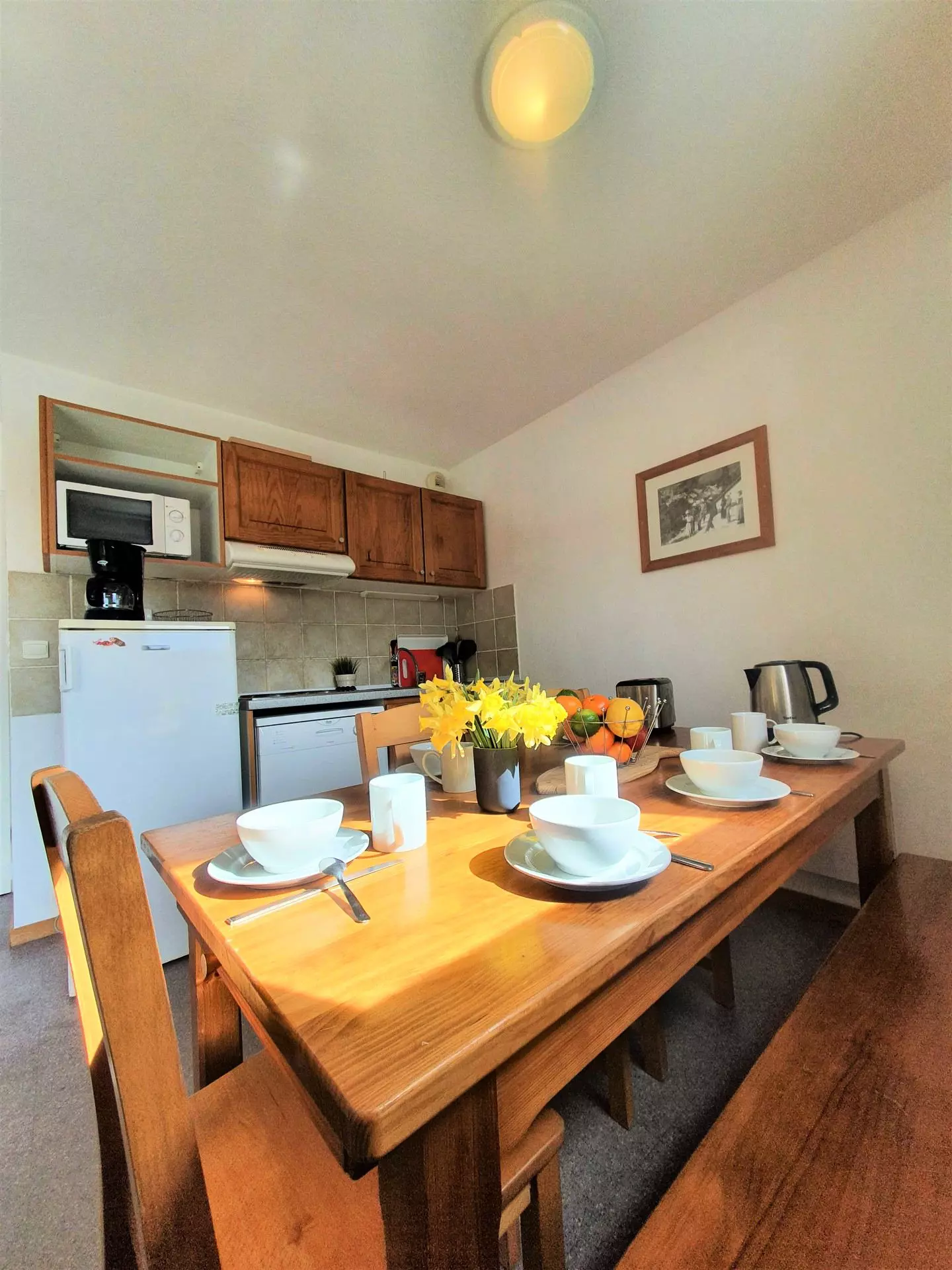 Equipped kitchenette, dishwasher, washing machine, refrigerator, microwave, filter coffee maker, raclette machine.