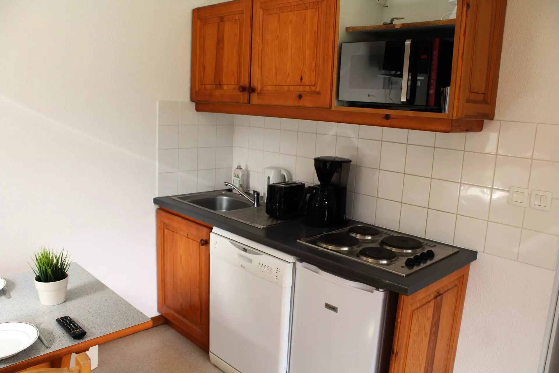 Fully equipped kitchenette. Dishwasher, microwave, filter coffee maker, toaster, electric kettle.