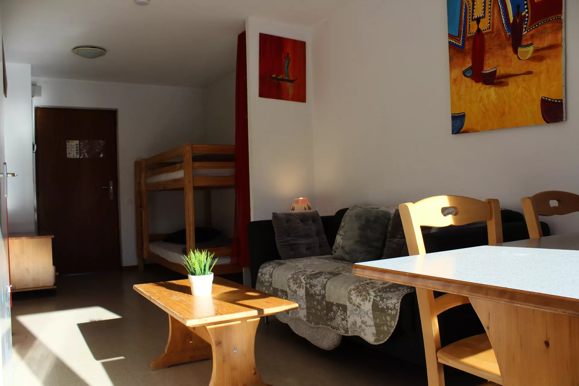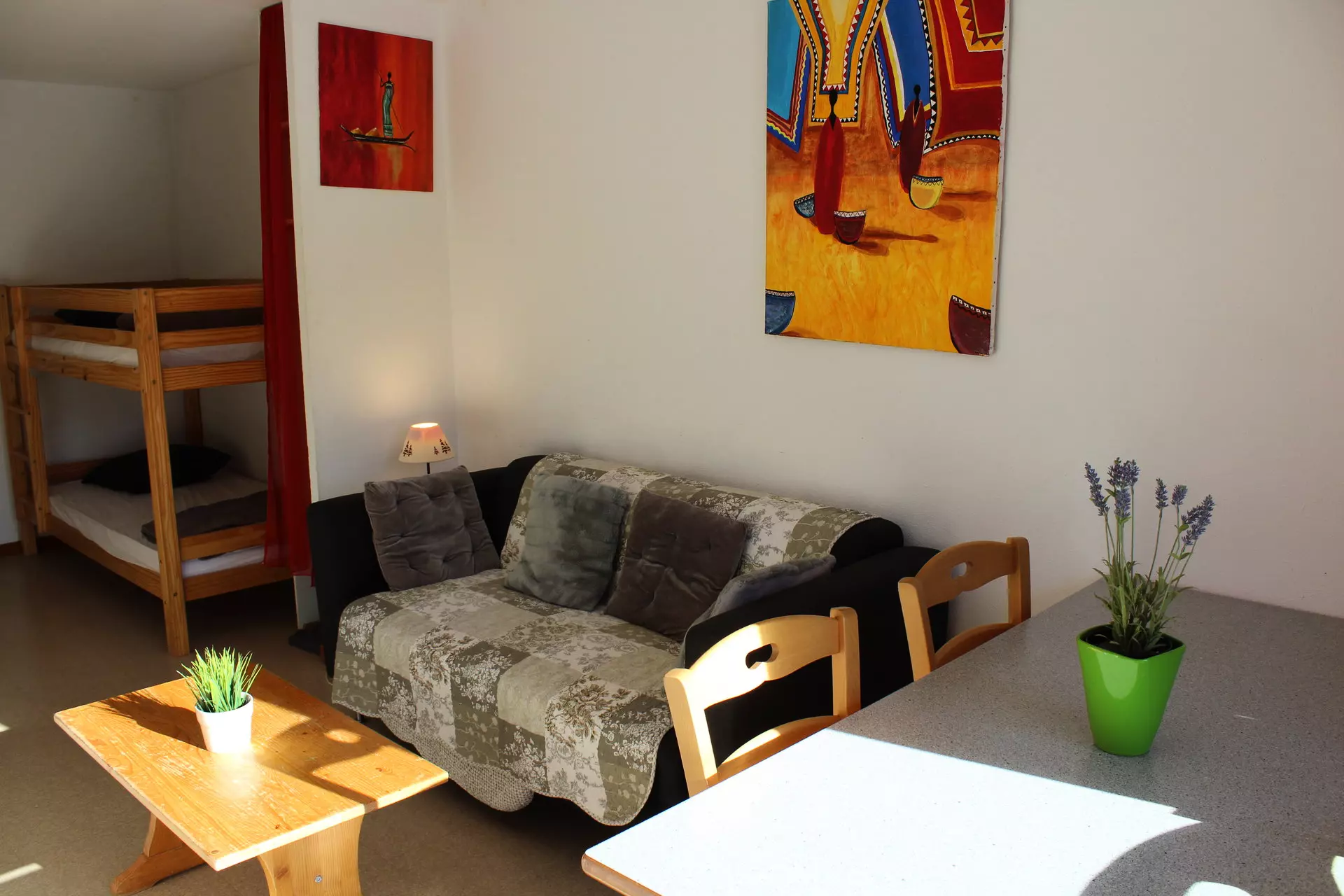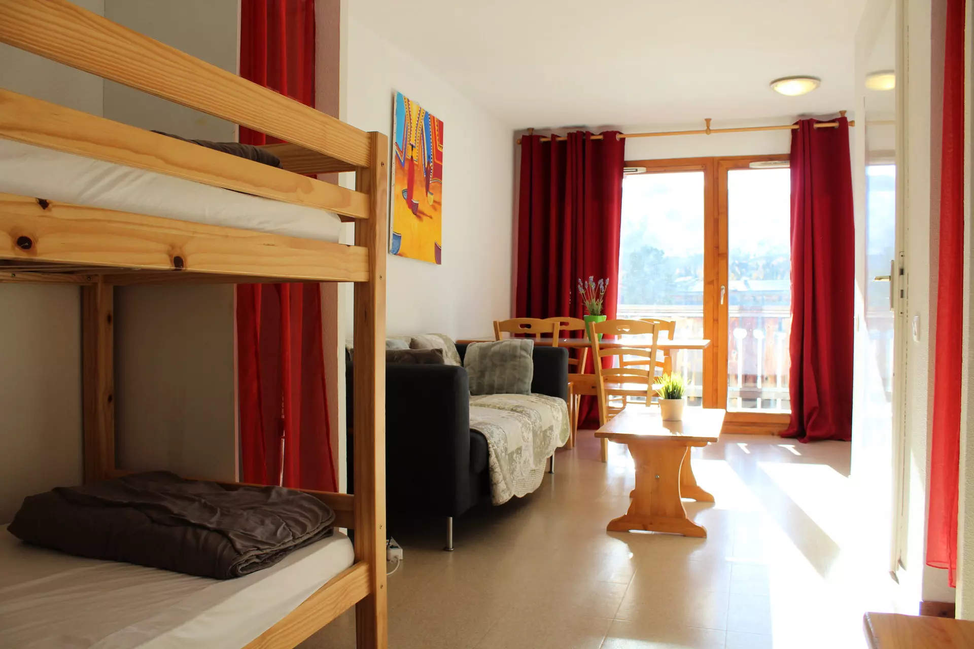 Living room with kitchenette, 1 bedroom with double bed. Mountain corner with bunk bed.