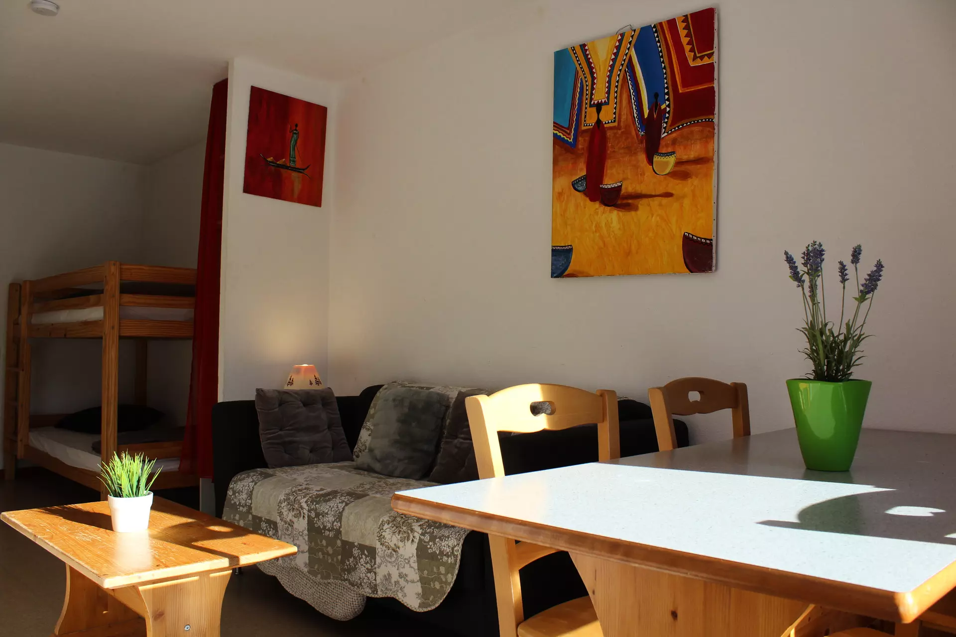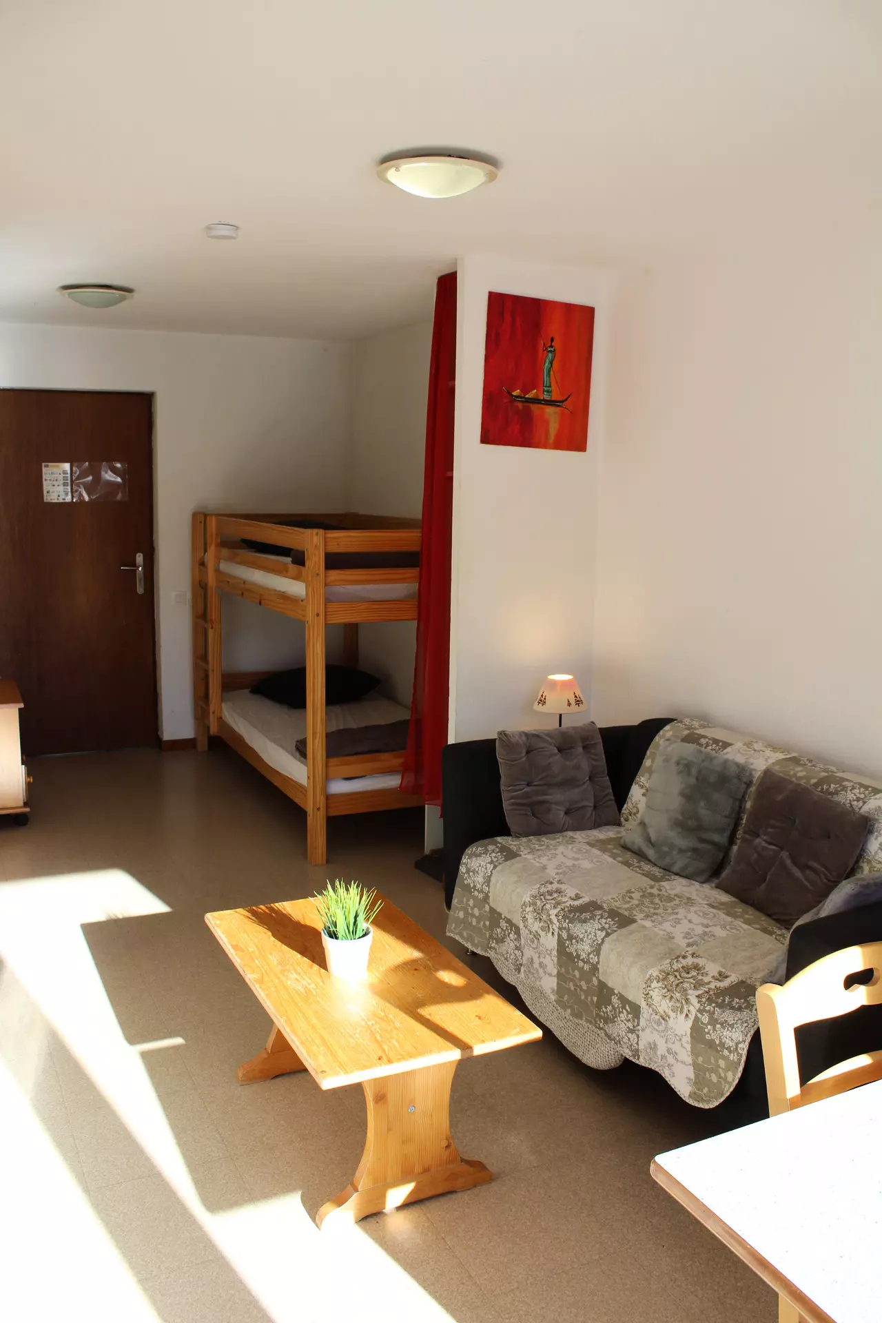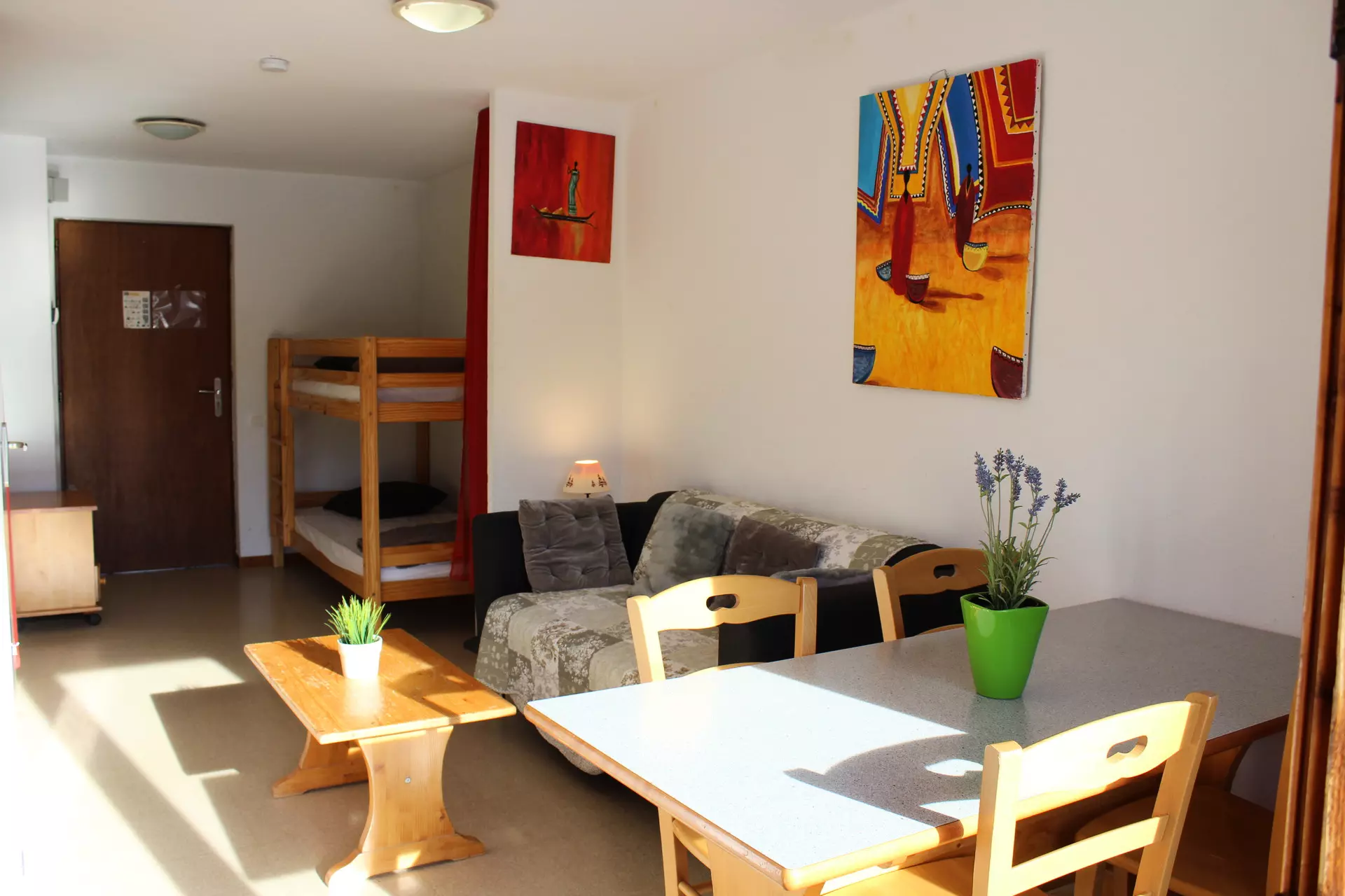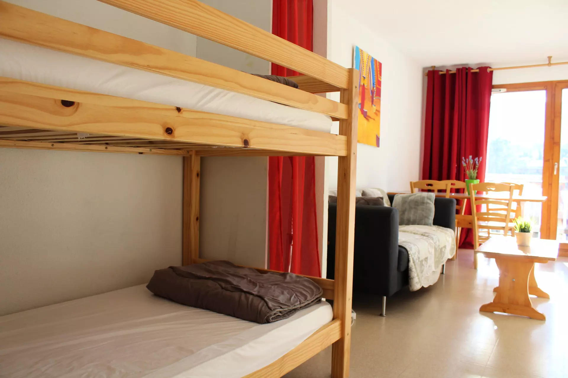 Living room with kitchenette, 1 bedroom with double bed. Mountain corner with bunk bed.