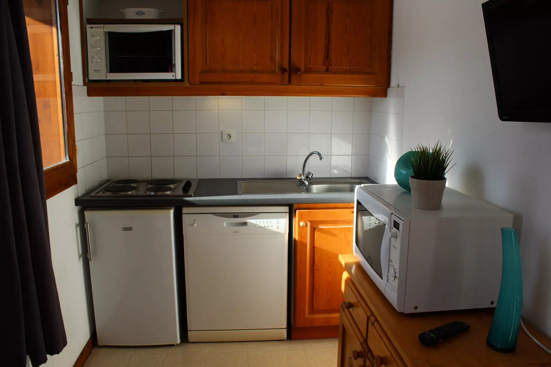 Living room with equipped kitchenette, refrigerator, dishwasher, oven, microwave, filter coffee maker, toaster, electric kettle.