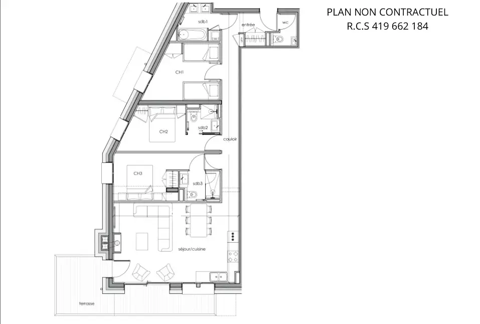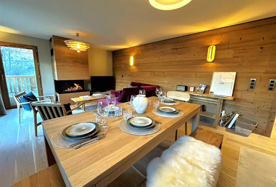 Apartment PRAMINT - LES CHALETS DU CHEVAL NOIR n° B4, 4 rooms with 3 bedrooms for 8 people 85m², west facing with balcony and garden level terrace with panoramic view of the valley.