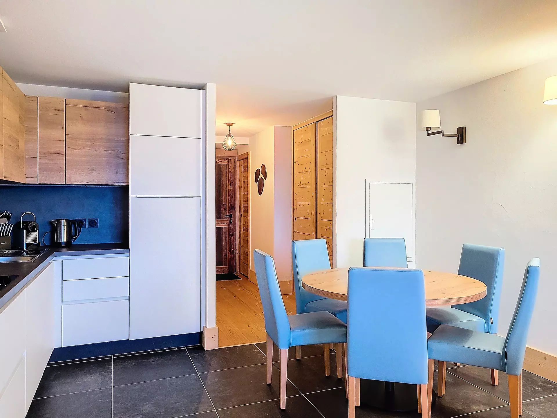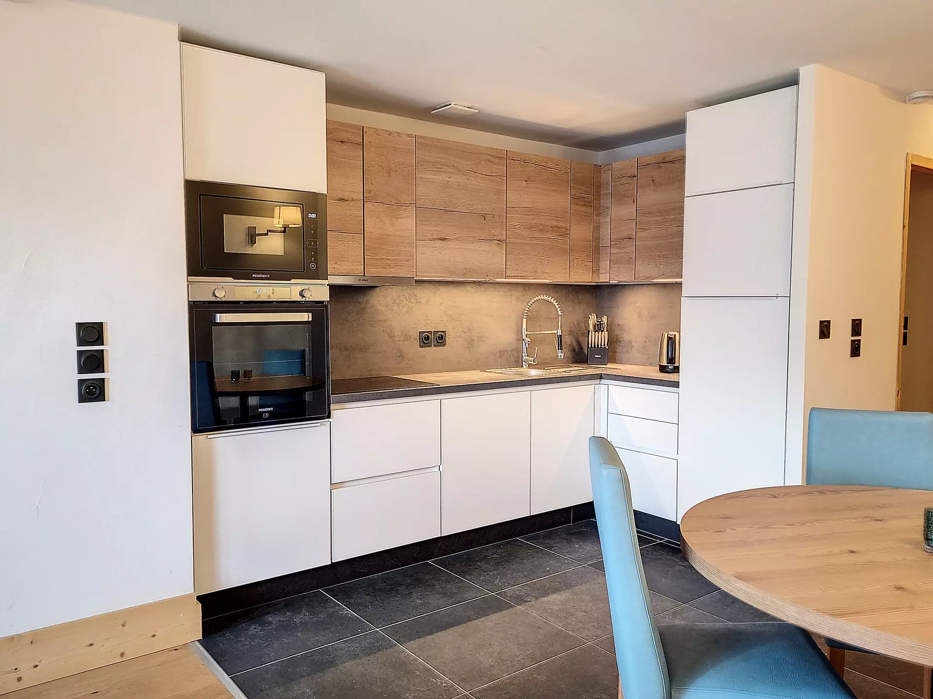 Open kitchen equipped with induction hob, microwave, dishwasher, oven, fridge with freezer, kettle, toaster and electric coffee maker.