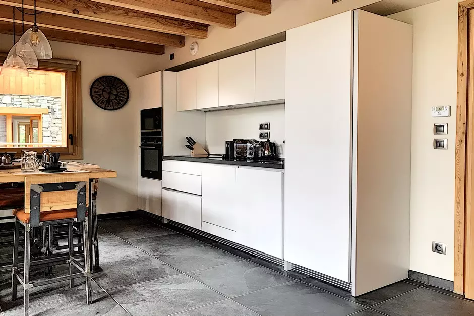 Fully equipped kitchen: induction hob, dishwasher, oven, microwave, kettle, toaster and Nespresso coffee machine.