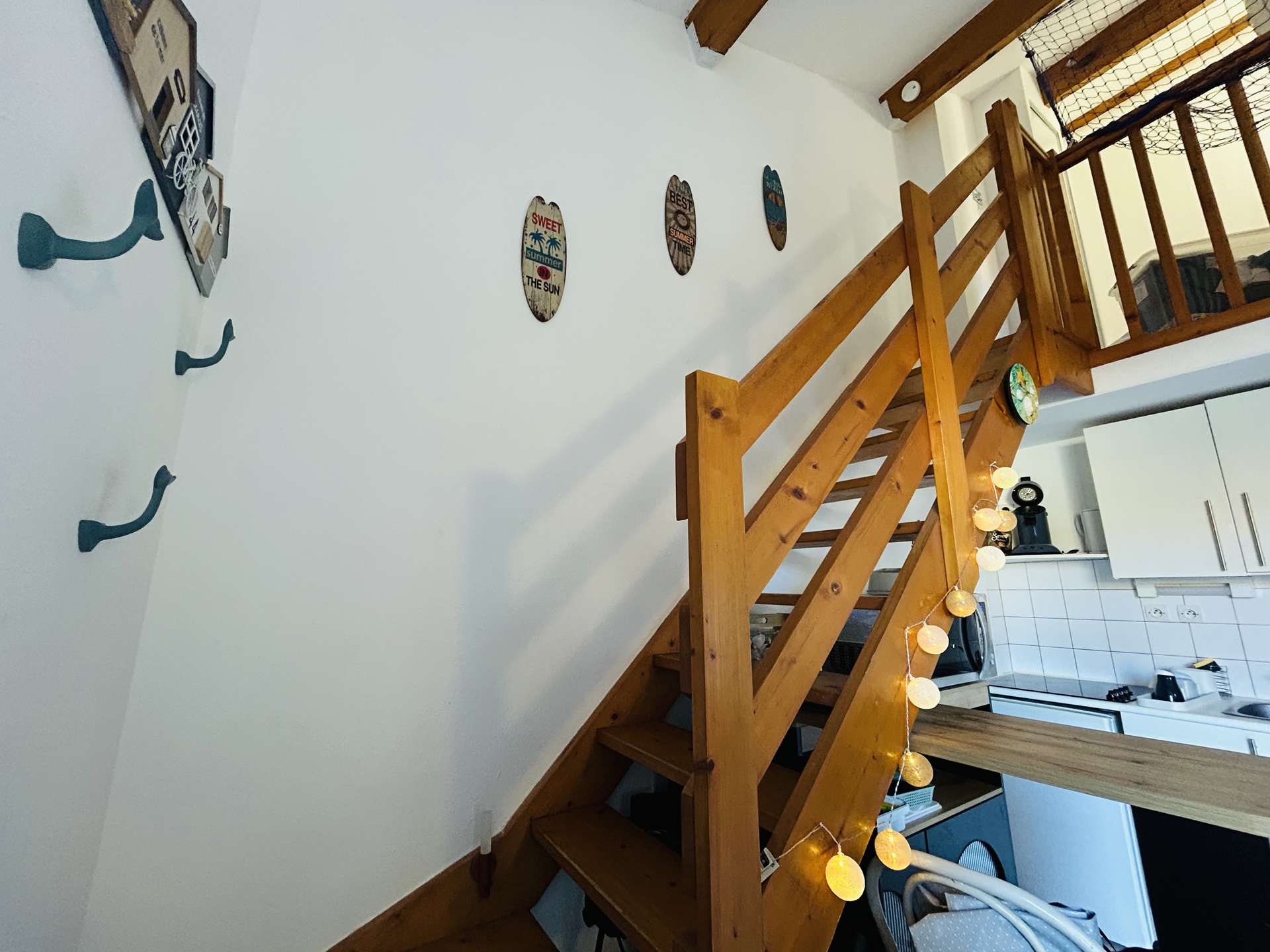 This seaside holiday accommodation comprises on the ground floor a living room with sofa and television (subject to good reception), a kitchen area, a bedroom with two single beds and a bathroom with WC. Upstairs there is a bedroom with a double bed and a mezzanine with a single bed.