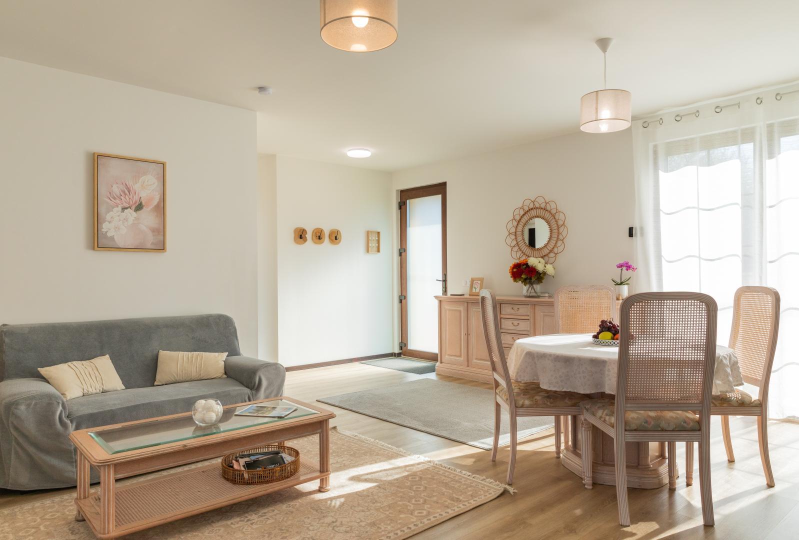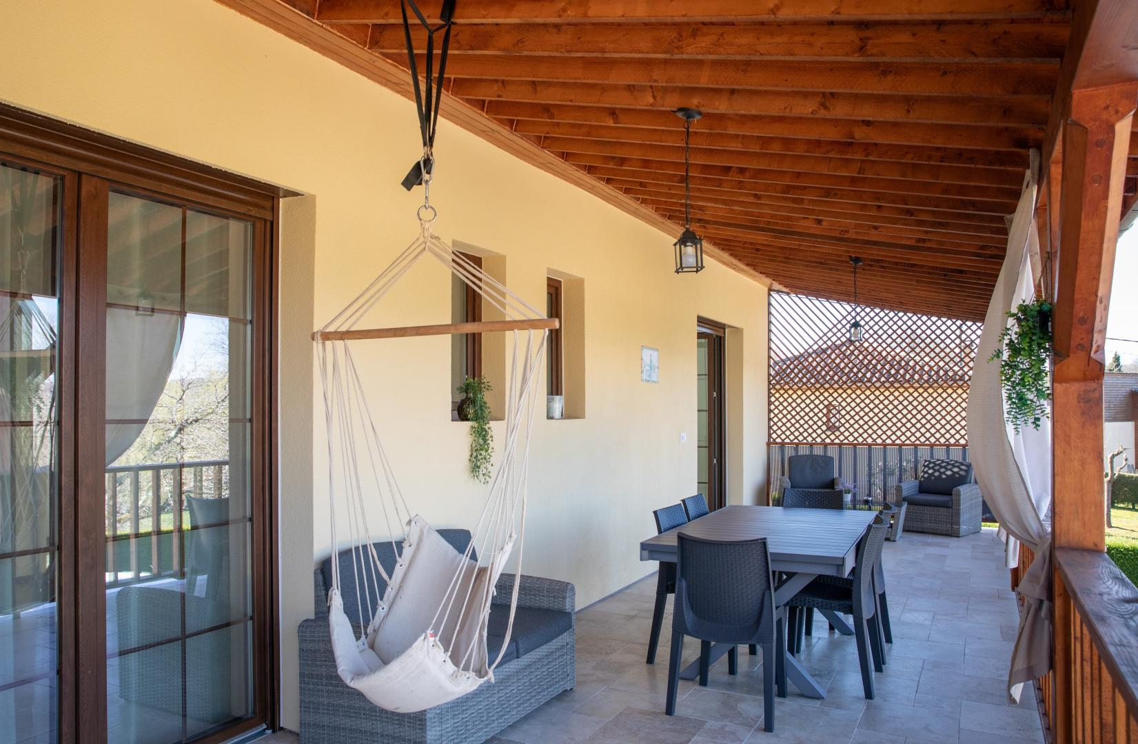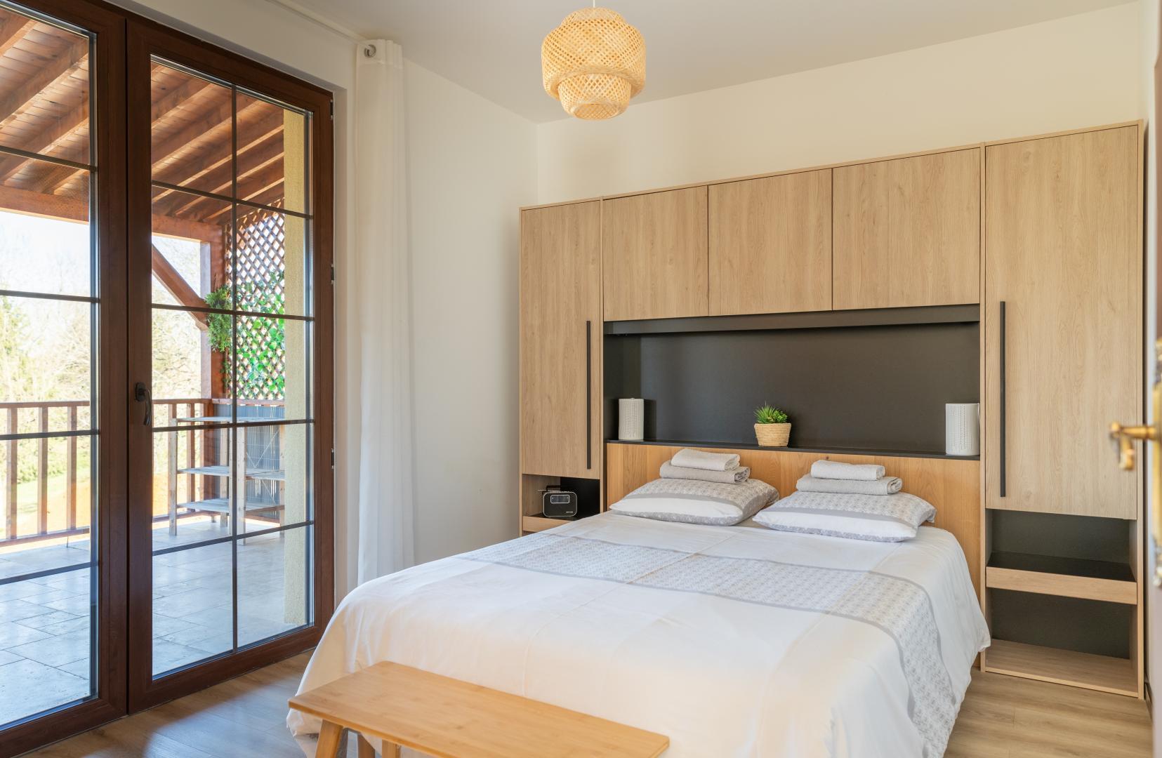 This newly built, detached house is nestled in a quiet hamlet. On the ground floor, you'll enjoy the open-plan kitchen, living room, and dining room. Two lovely bedrooms are available, each with a 140x200 cm bed and a private bathroom. There's a separate toilet. Outside, you'll enjoy a 500 m² unfenced garden in front of the house, and a private covered terrace with garden furniture and a plancha grill at the back.