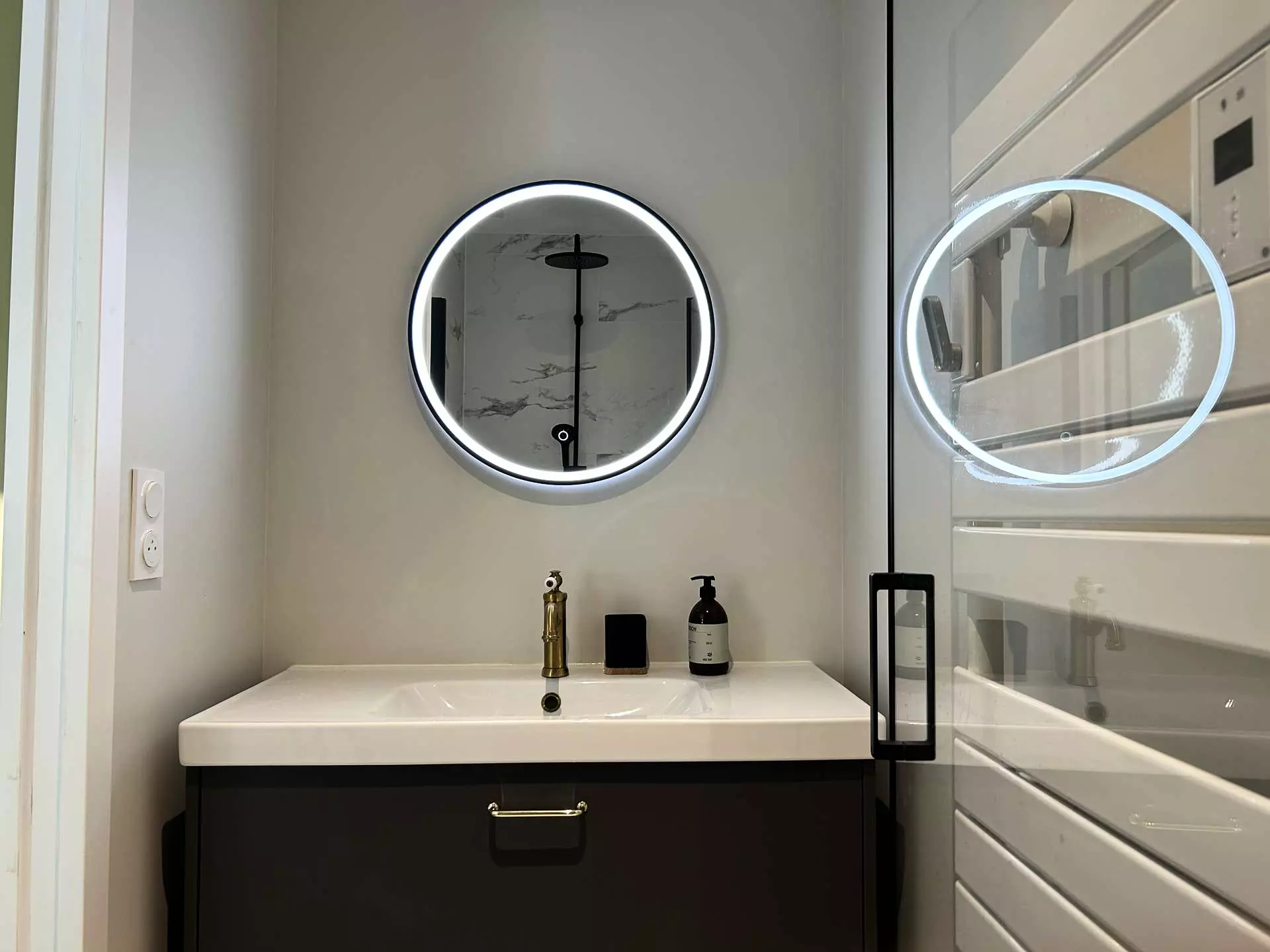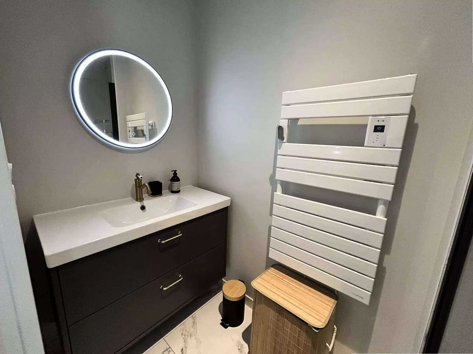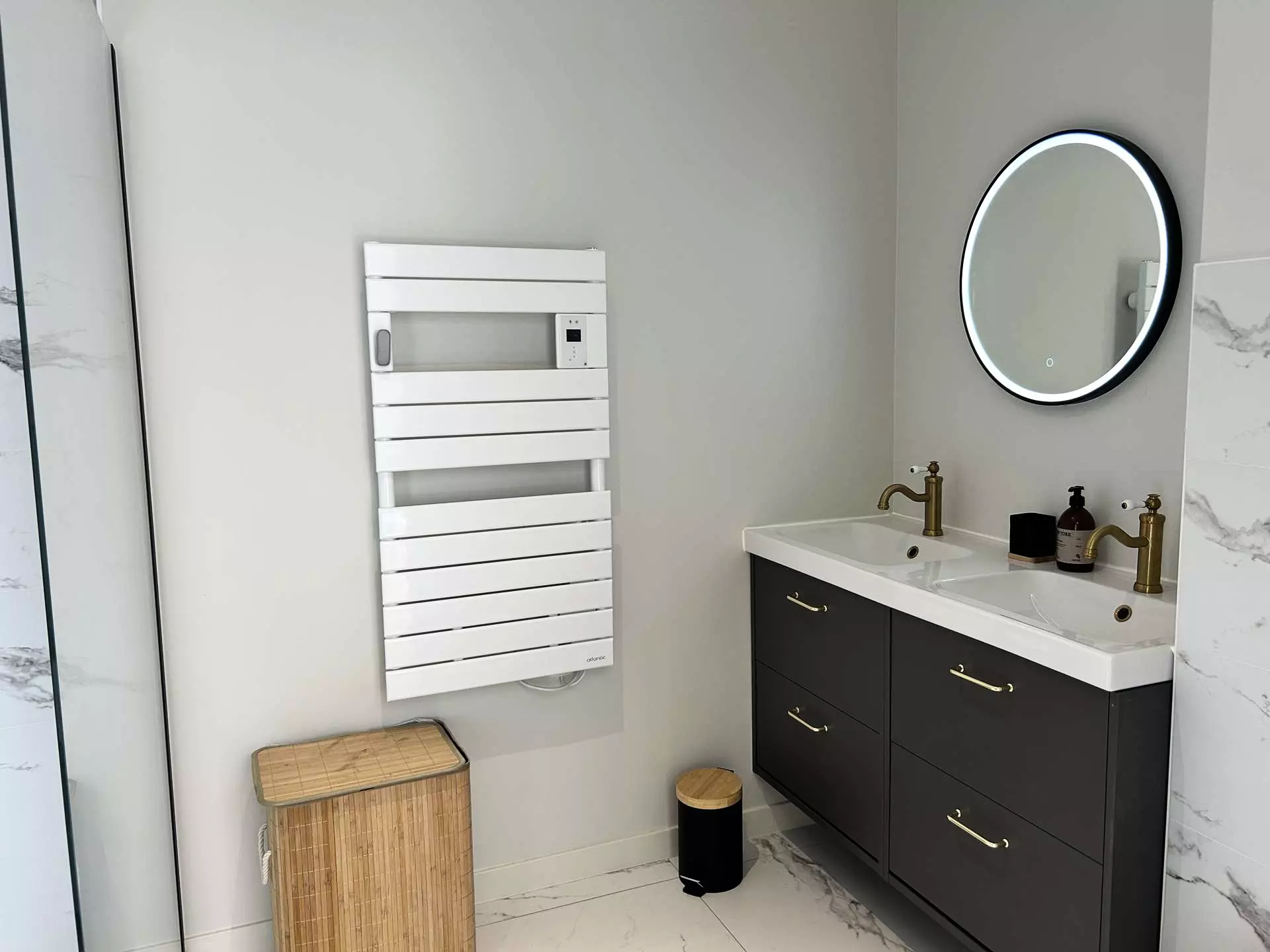 - An open kitchen, fully equipped: sink, induction hob (4 burners), extractor fan, dishwasher, oven, fridge-freezer, microwave, Nespresso Krups coffee machine, citrus press, toaster, kettle, as well as numerous accessories (cutting board, utensils, pans, saucepans, etc.);