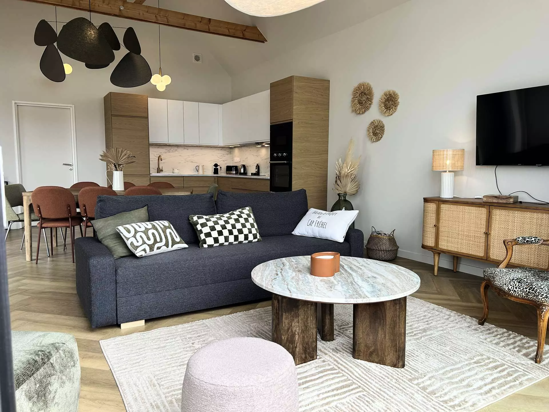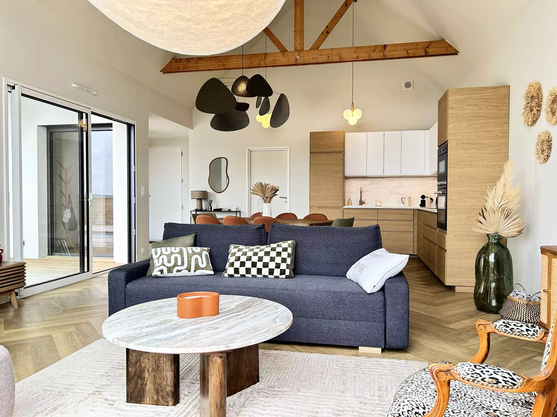 - A large, welcoming living room, furnished with a sofa, armchairs and a dining area that can accommodate up to 6 people;