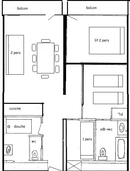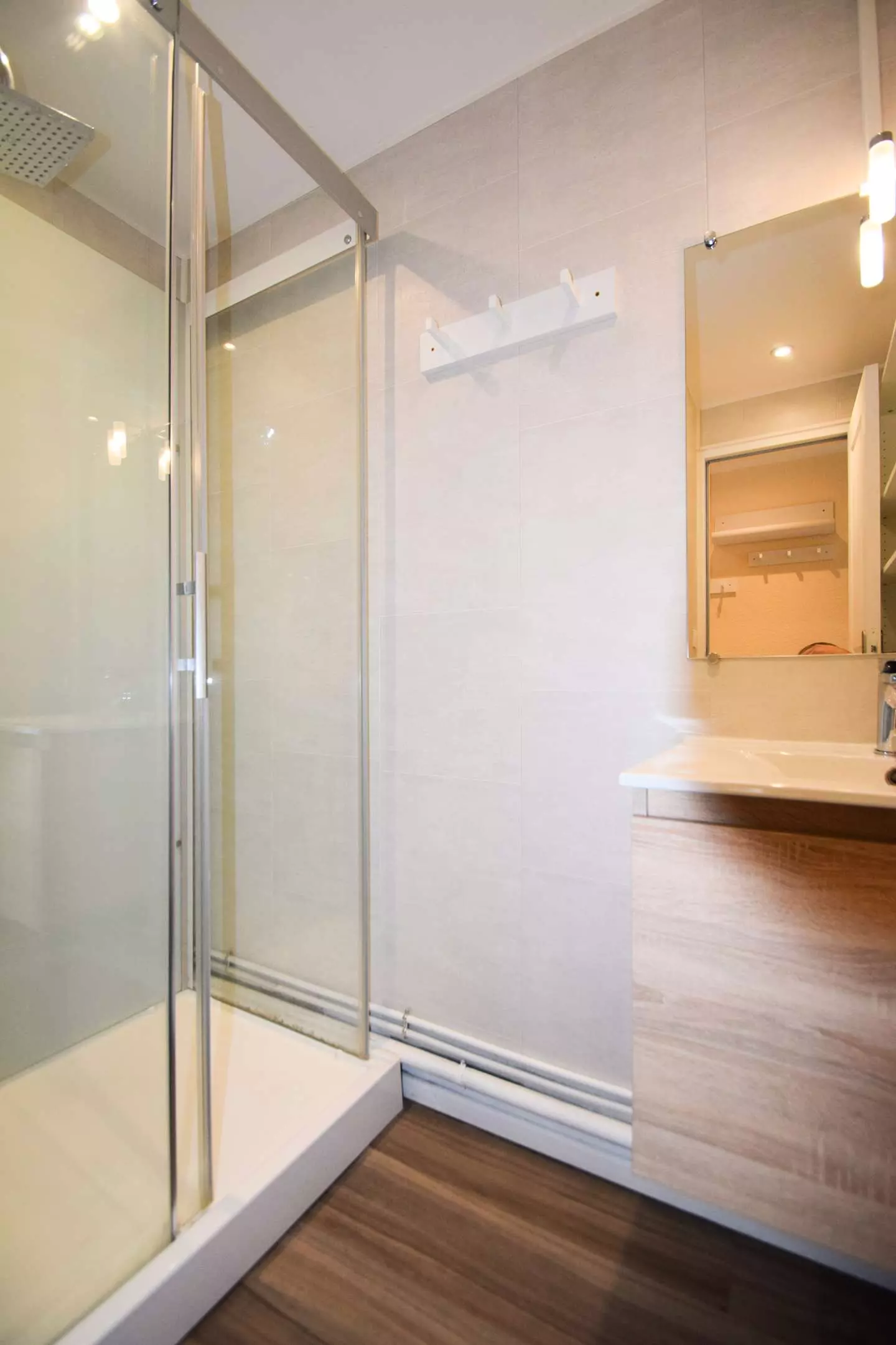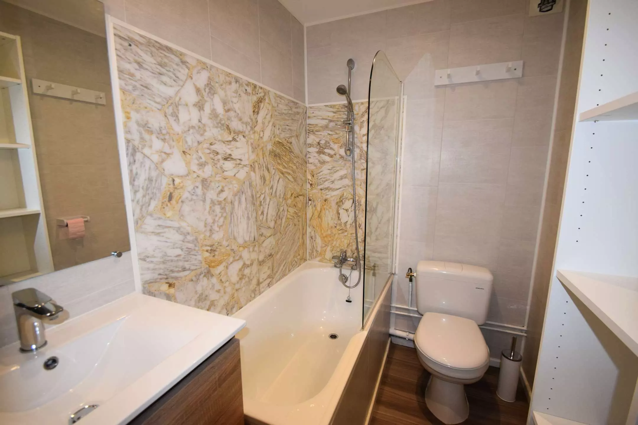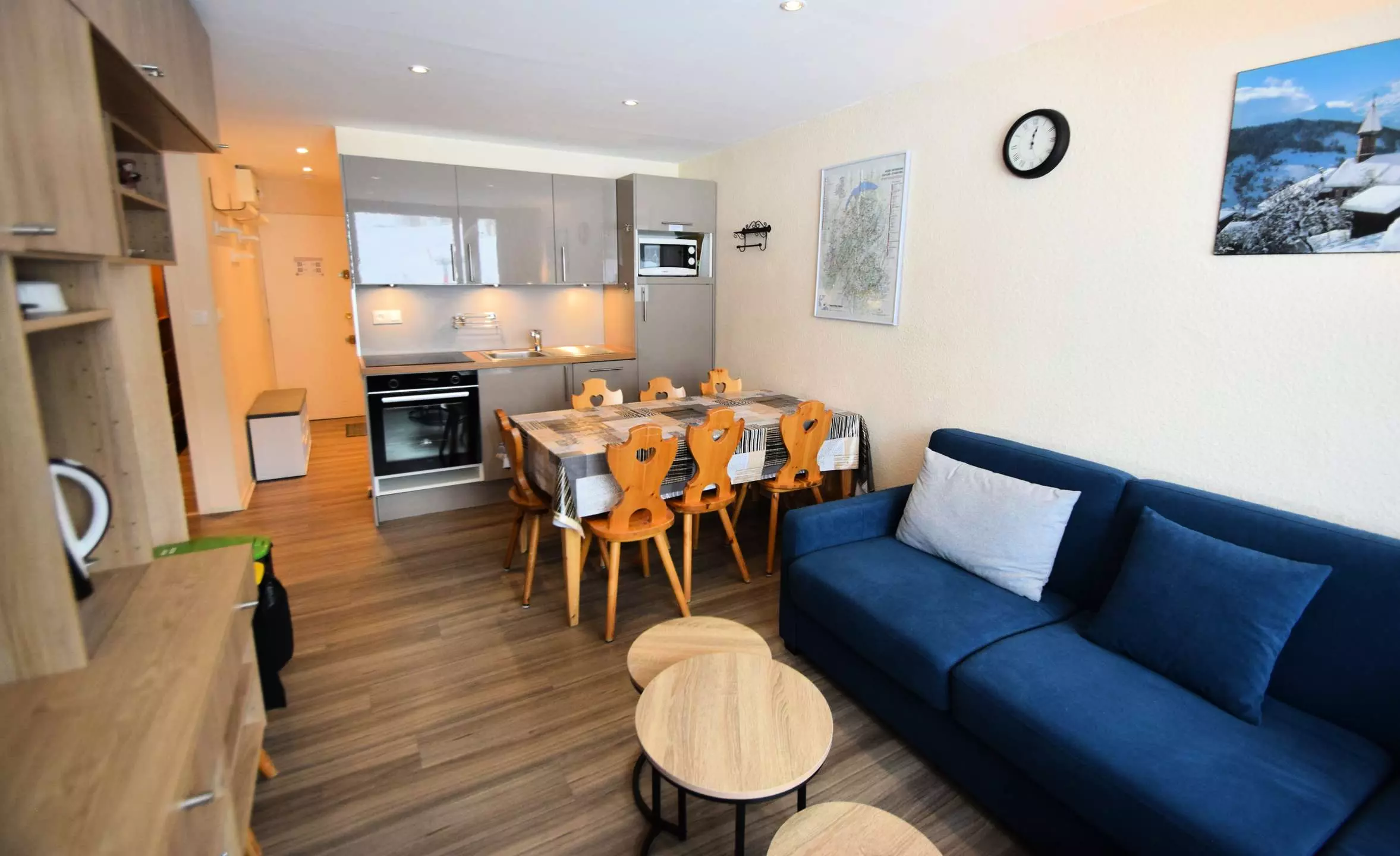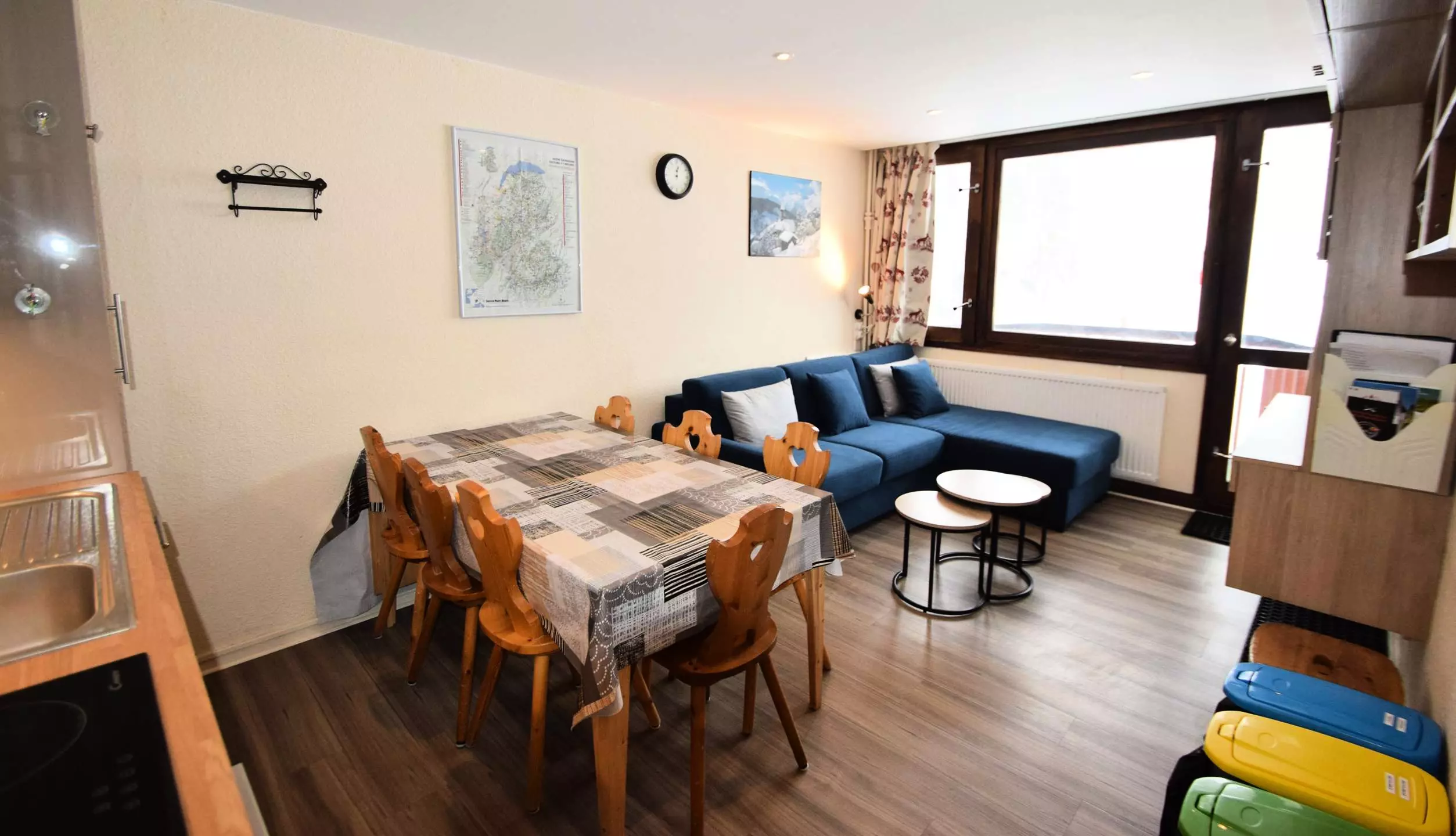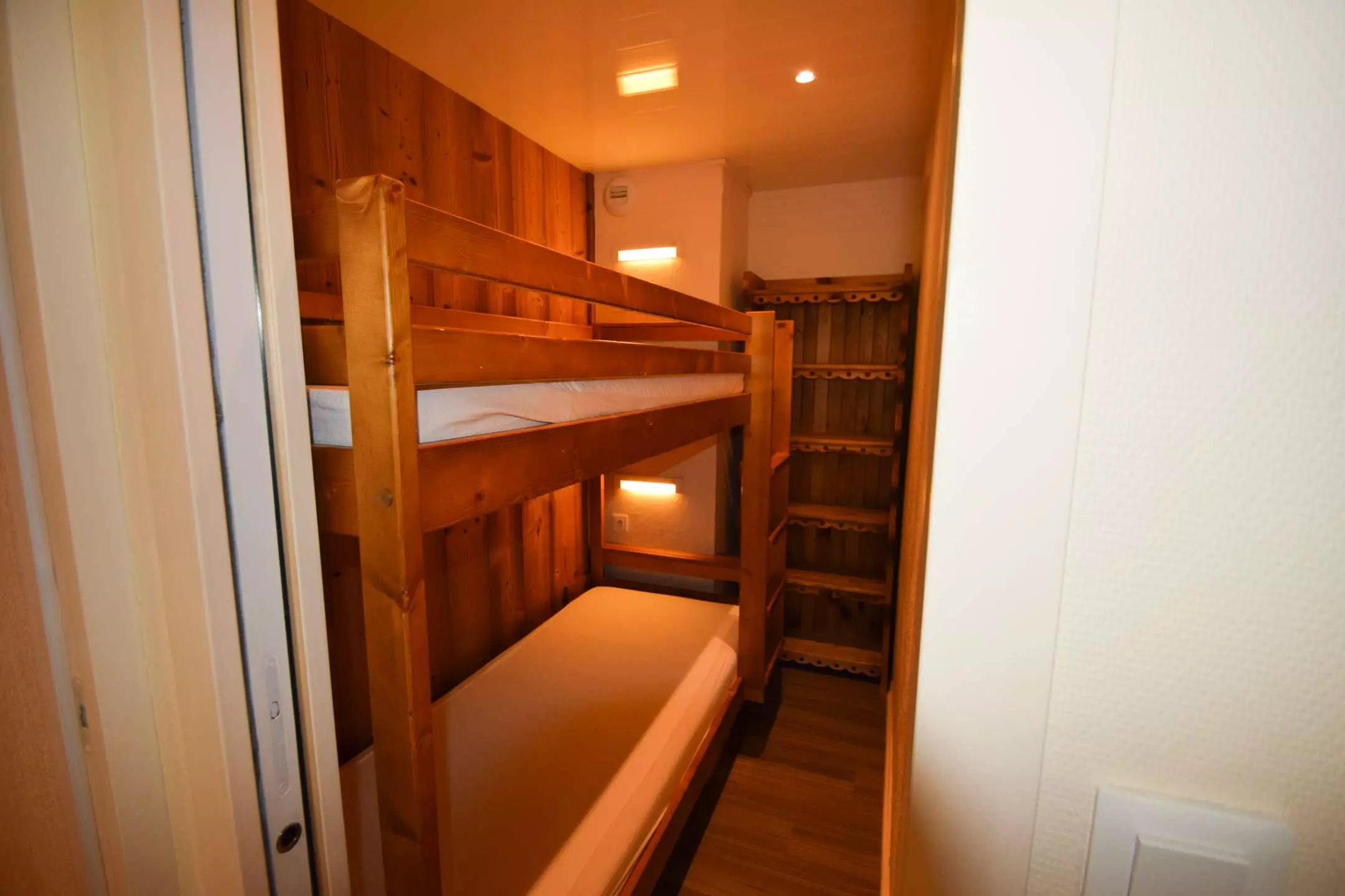 Apartment 6/7 people, 45m2, Living room + 2 Bedrooms + mountain corner facing SOUTH, with balcony, view of the slopes, on the 5th floor with elevator. Kitchen in living room: ceramic hob, refrigerator, traditional oven, microwave, dishwasher - Living room (balcony access): dining area, corner sofa with bed for 1 person (120cm)., TV. Bedroom 1 (balcony access): 1 double bed 140cm, TV - Bedroom 2 (without window): 2 single pull-out beds - Mountain corner (without window): 2 bunk beds - Bathroom: bathtub, WC included - Shower room - 1 separate WC - Bedding: 4 single duvets and 2 double duvets - Apartment well located at the foot of the slopes and enjoying a beautiful view of the slopes. Ski lockers N°524 and 525 on the "Villages" side, level-1. NO PETS ALLOWED and NON-SMOKING APPT - End-of-stay cleaning, sheets, towels and ski passes are optional.