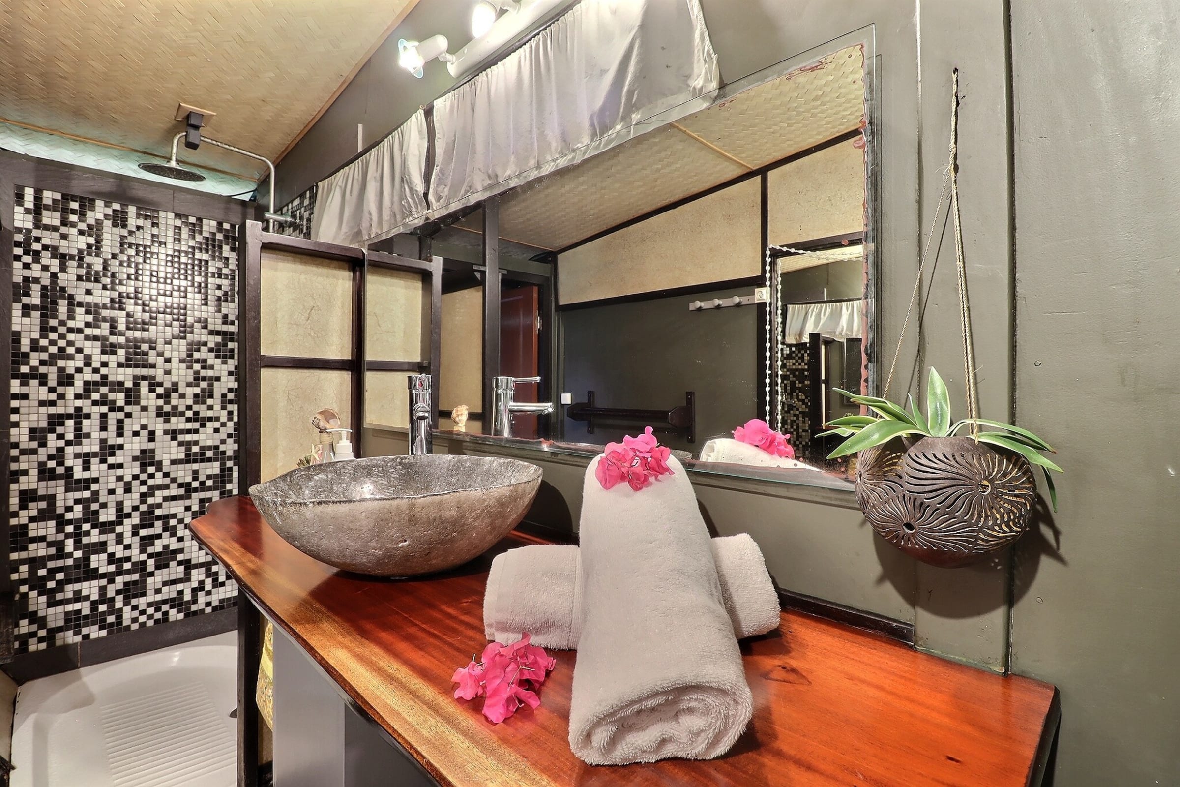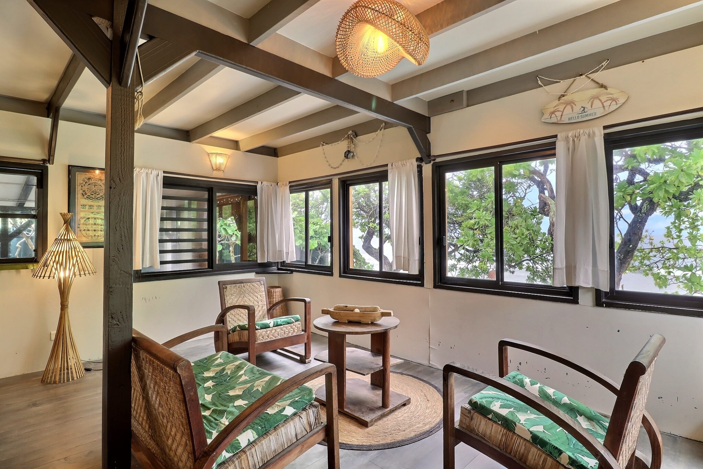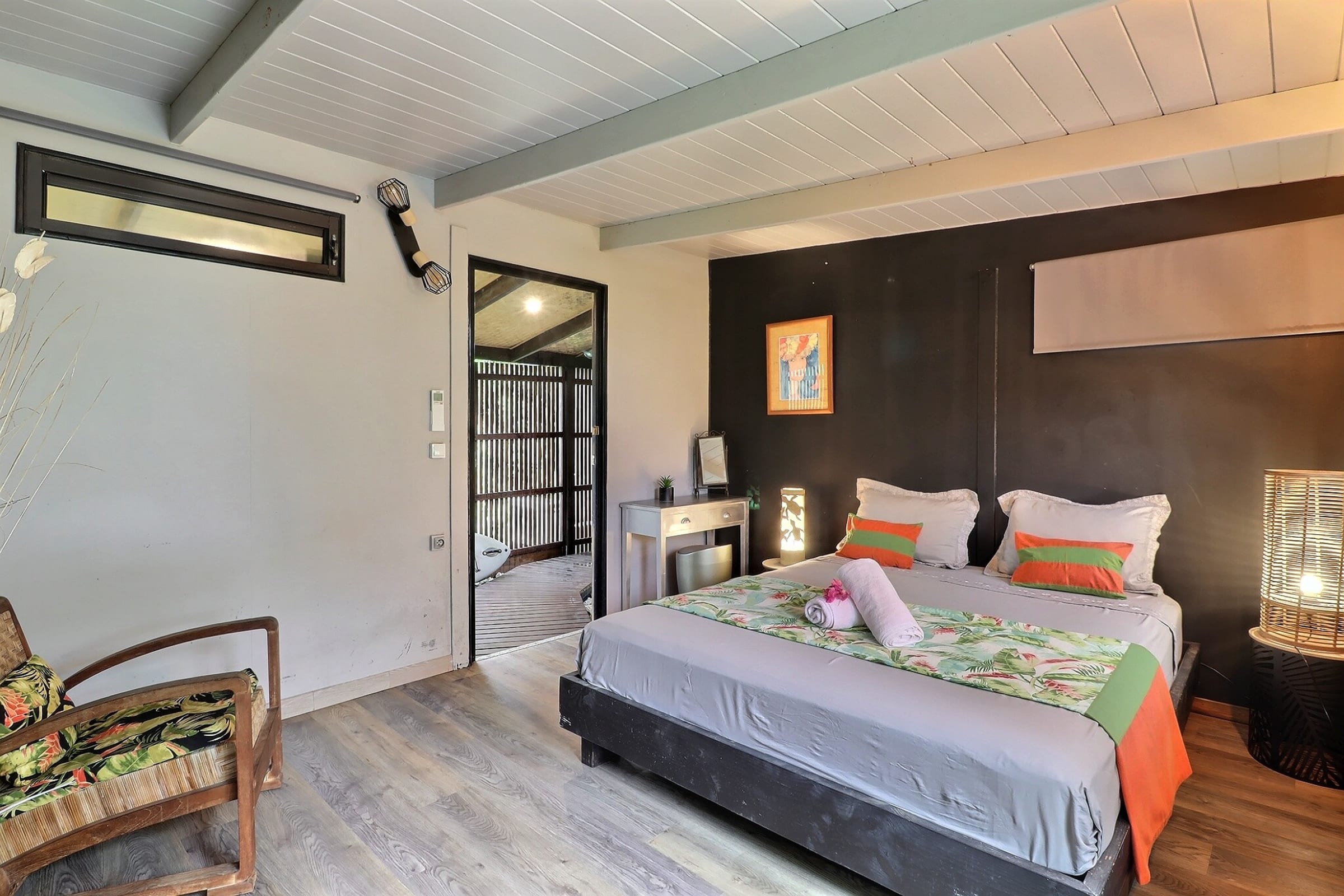 Built in the spirit of traditional Polynesian architecture, the house blends harmoniously with its natural surroundings. It was designed as a fluid and open living space, favoring natural ventilation, clean lines, and raw materials. Everything here encourages a lifestyle that flows between indoors and outdoors, with nature as your constant backdrop.