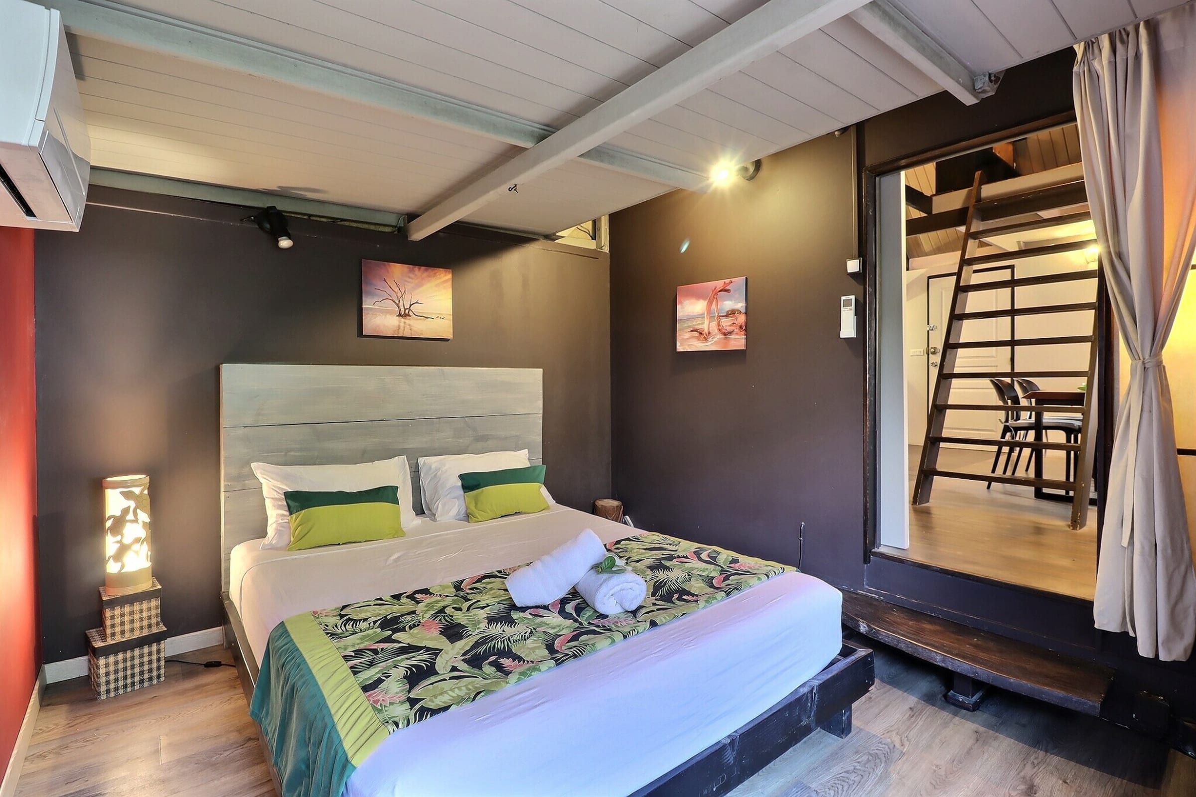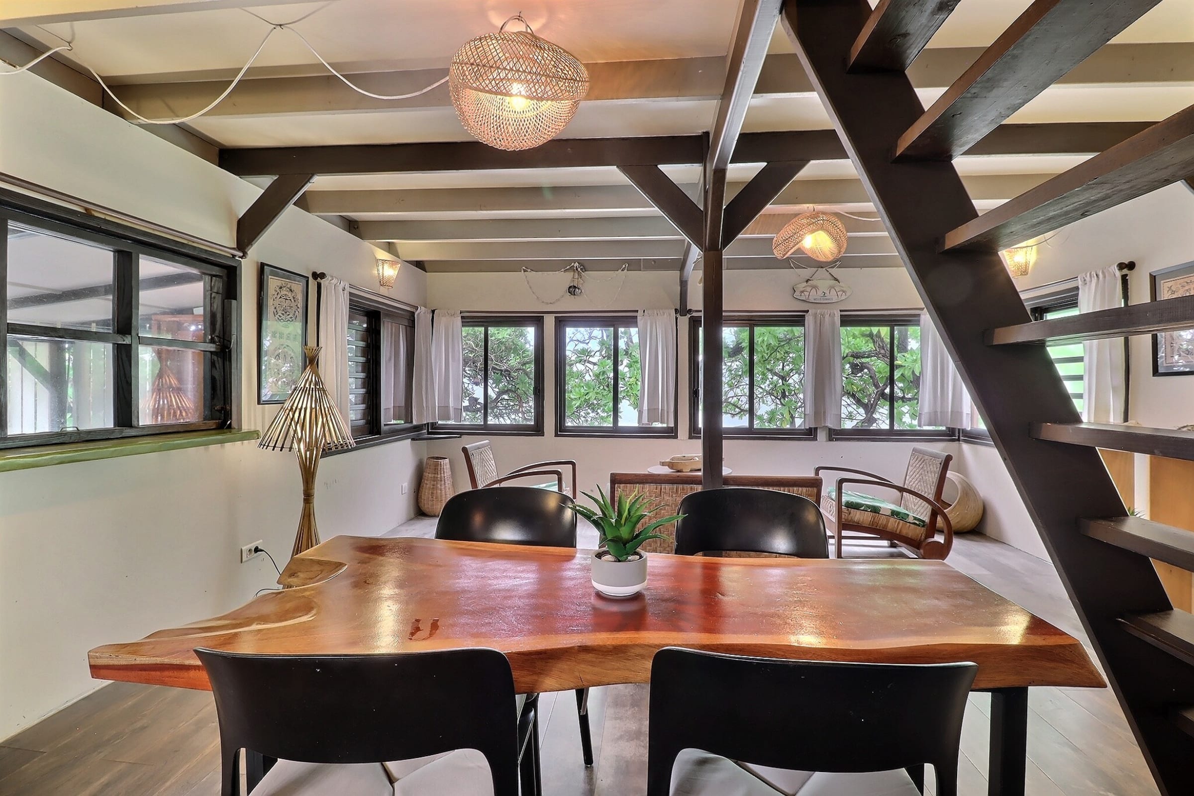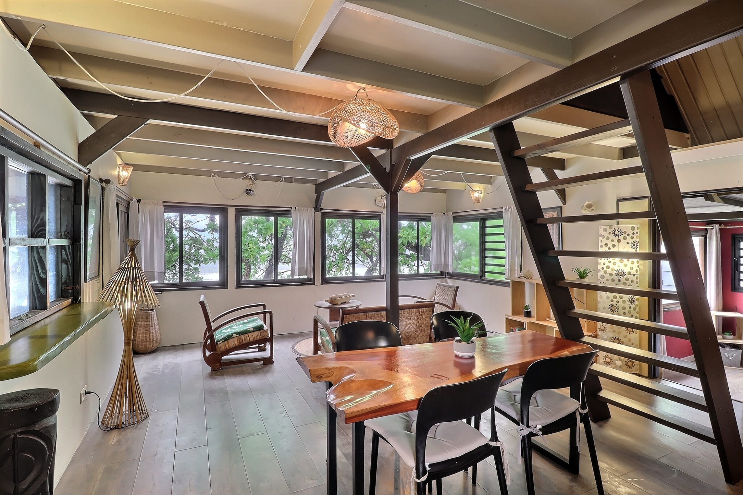 Built in the spirit of traditional Polynesian architecture, the house blends harmoniously with its natural surroundings. It was designed as a fluid and open living space, favoring natural ventilation, clean lines, and raw materials. Everything here encourages a lifestyle that flows between indoors and outdoors, with nature as your constant backdrop.