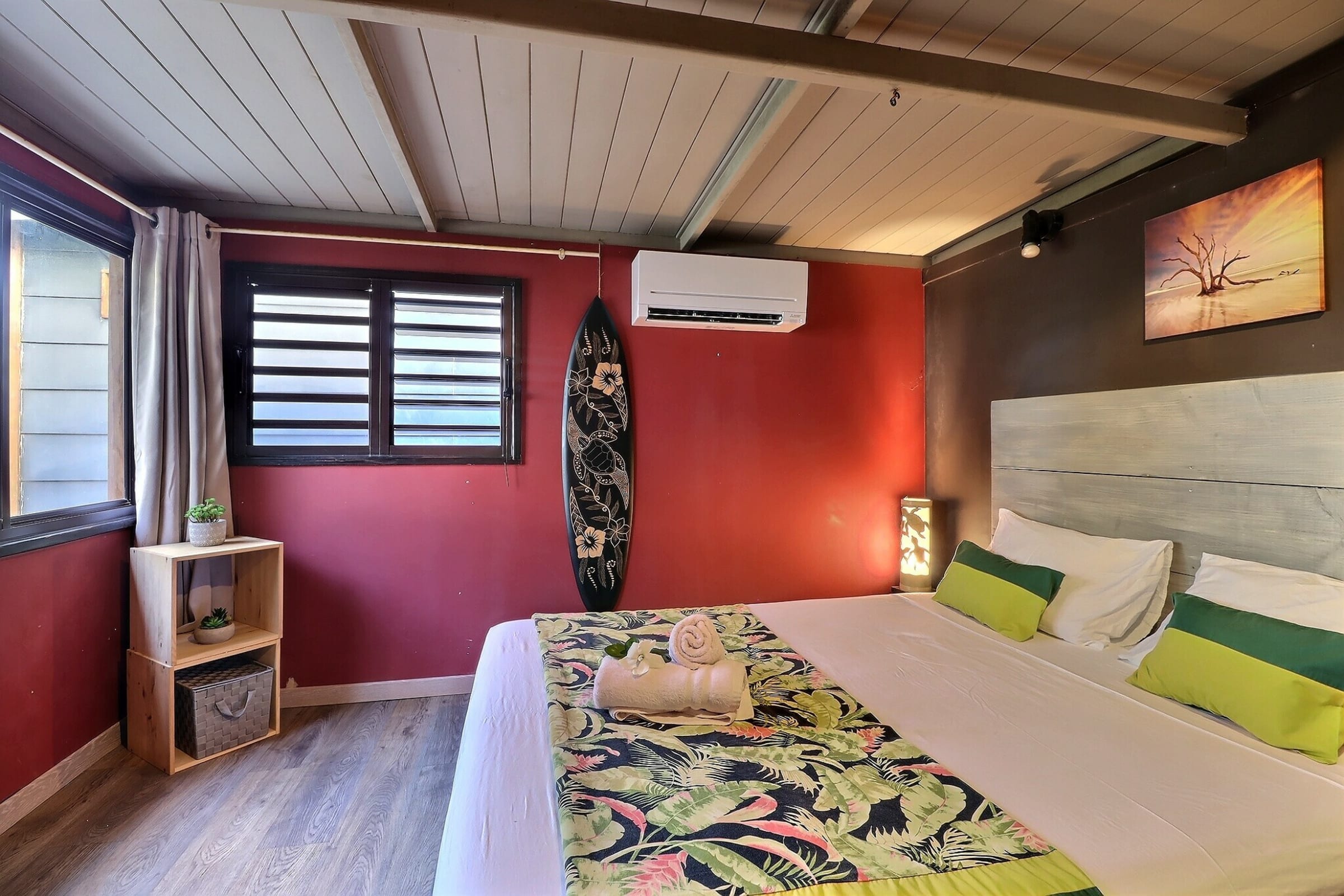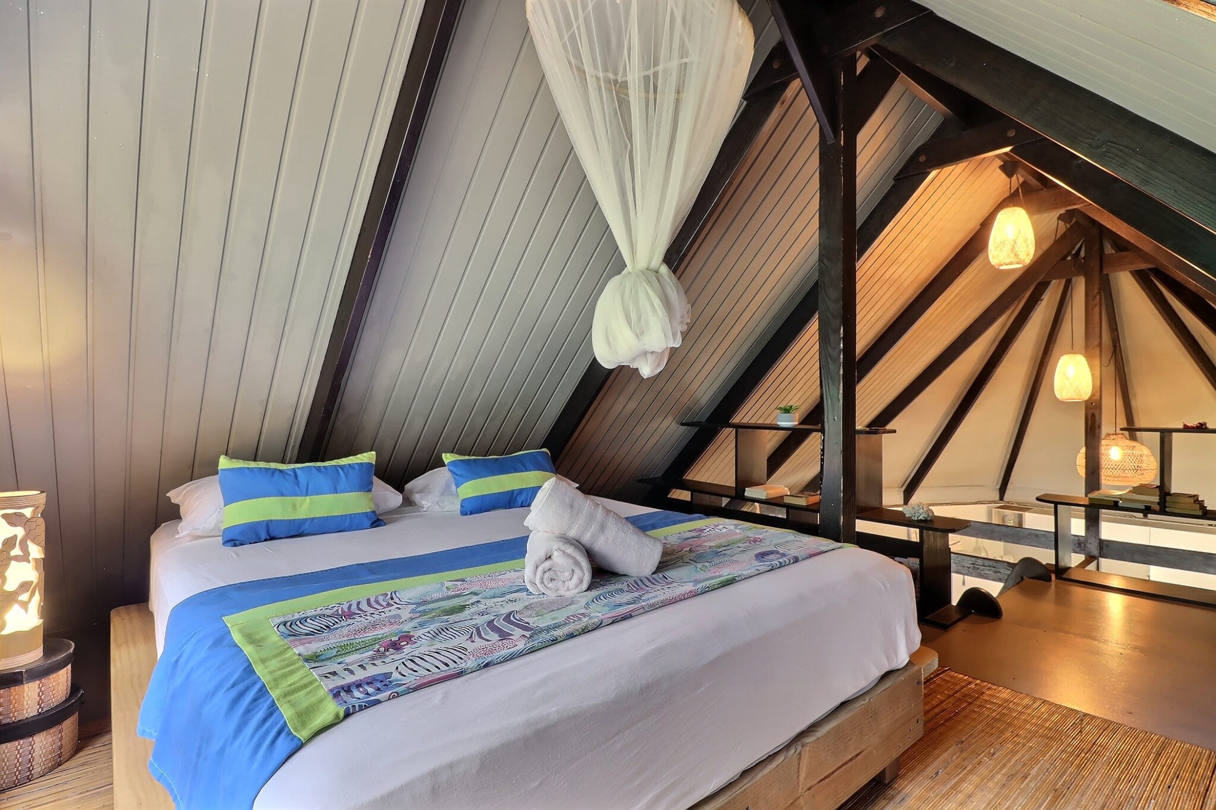 A master bedroom with air conditioning faces the lagoon, featuring a queen-size bed (160 x 200 cm) and direct sea view — a true cocoon of tranquility.