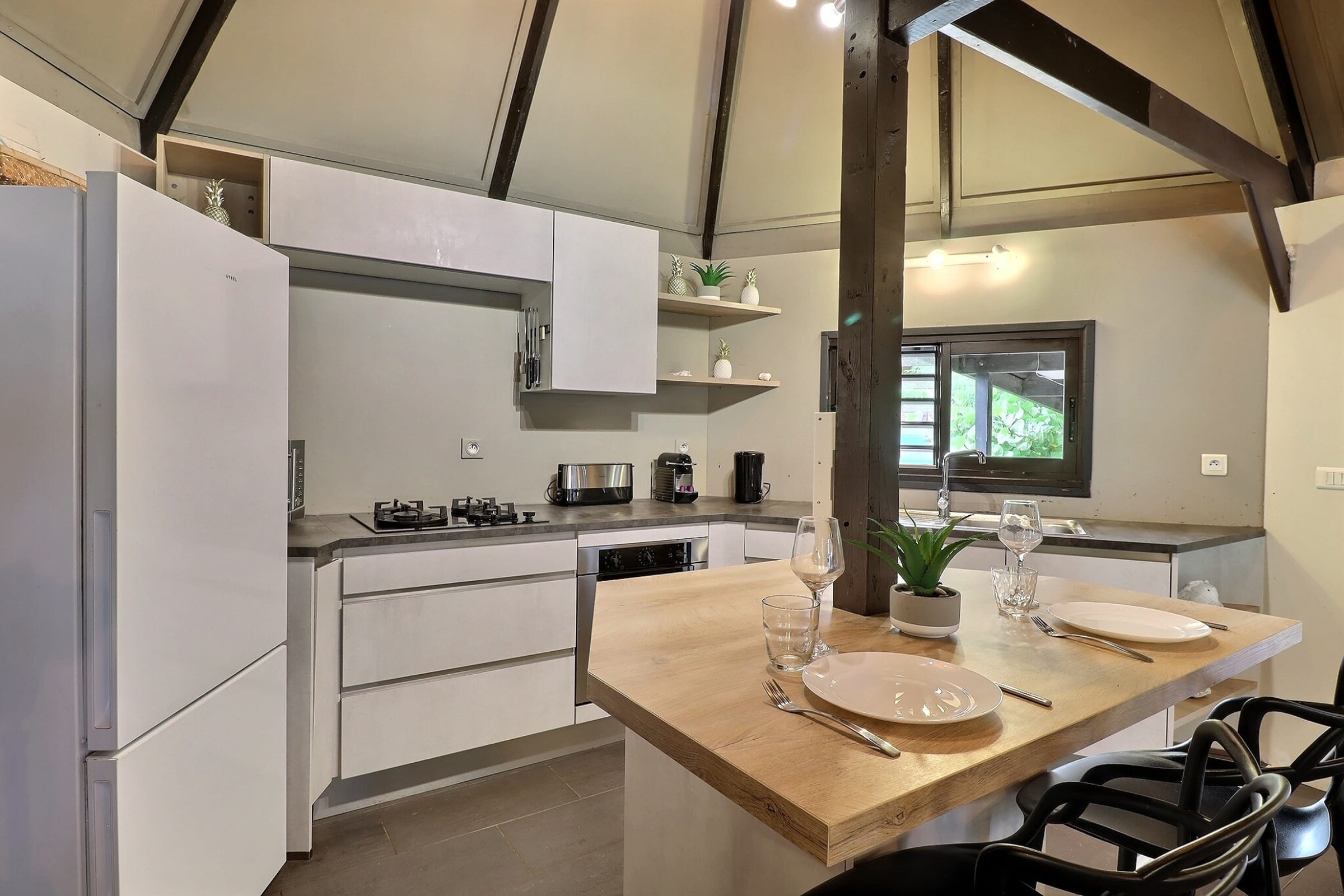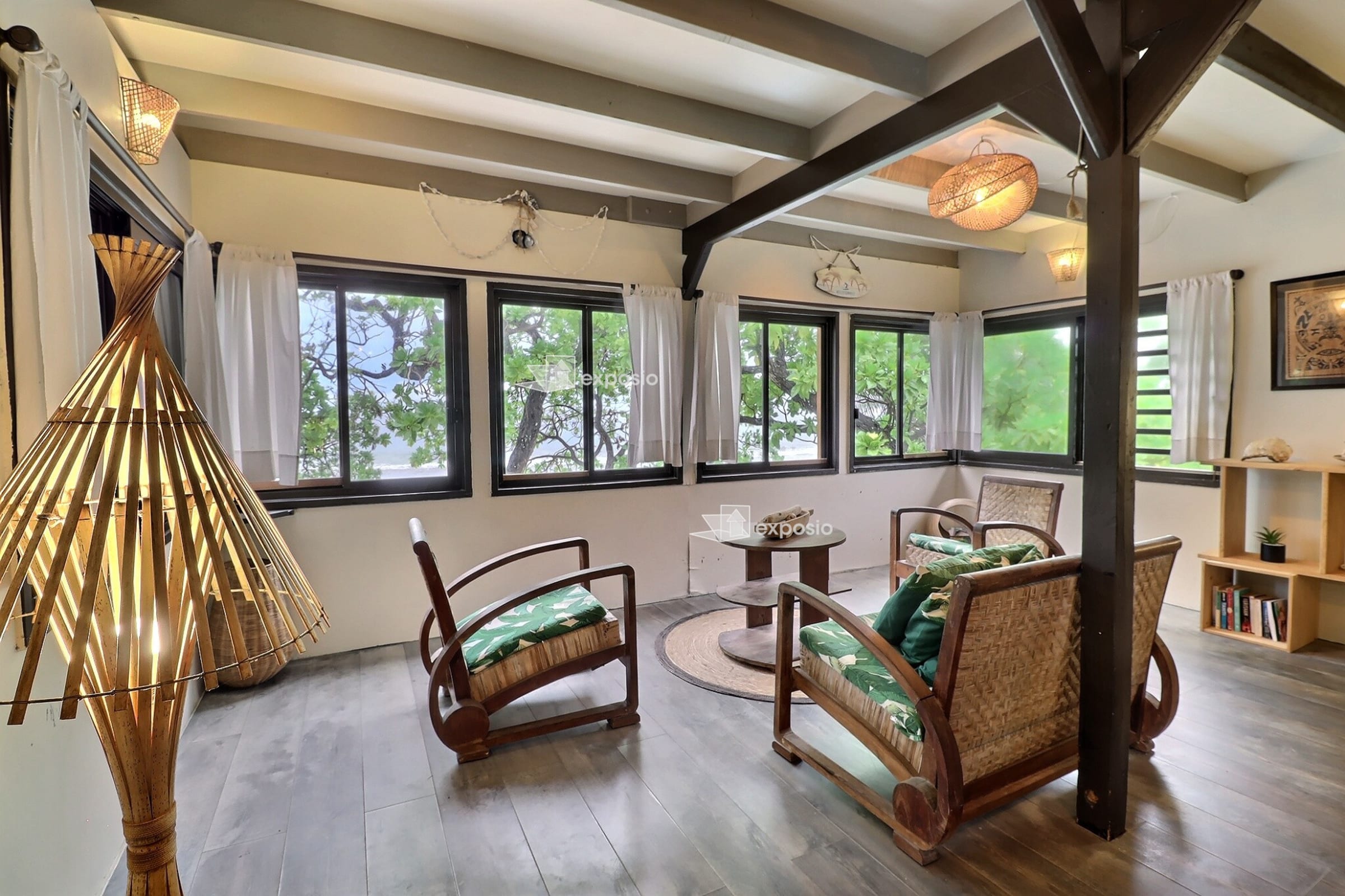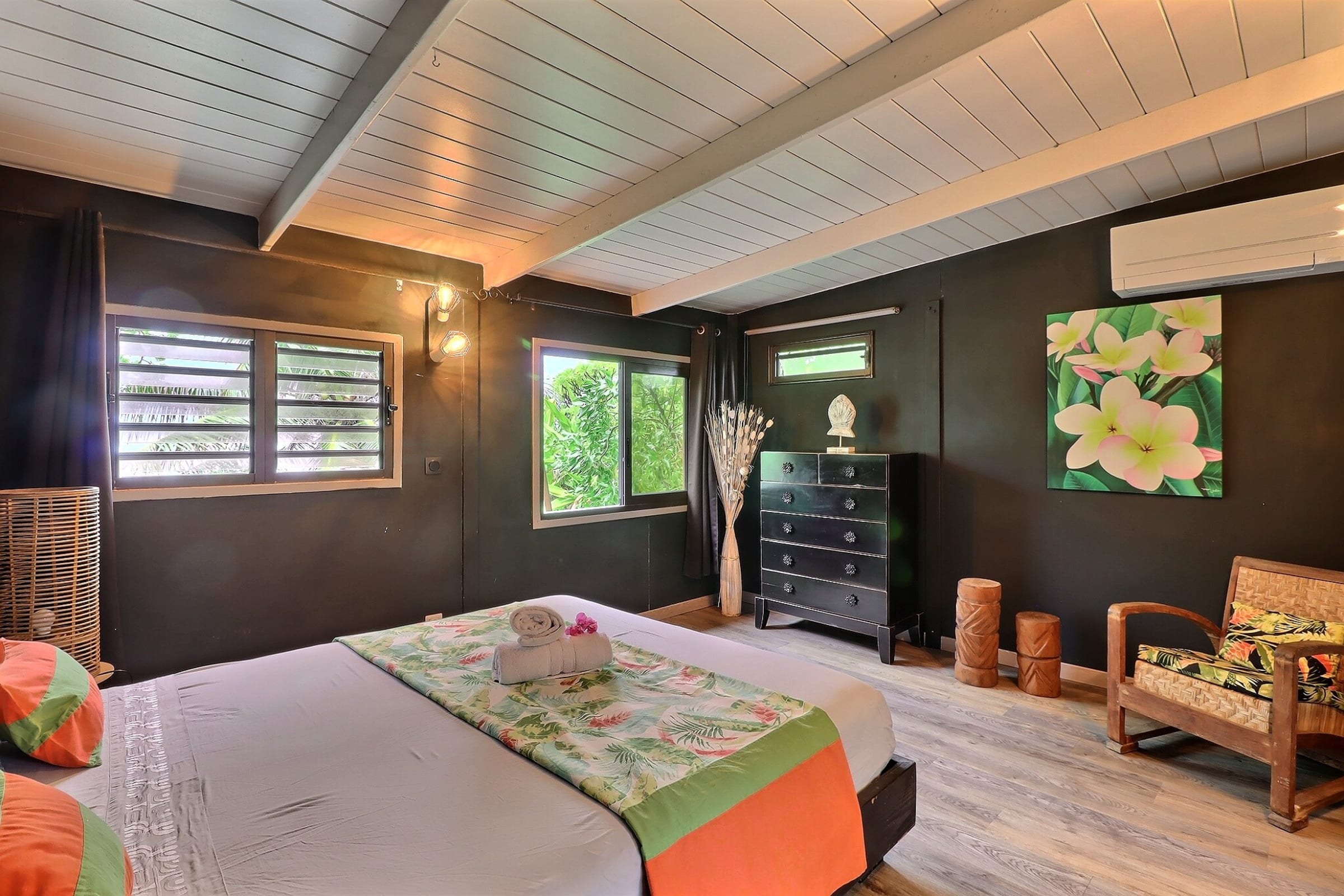 Built in the spirit of traditional Polynesian architecture, the house blends harmoniously with its natural surroundings. It was designed as a fluid and open living space, favoring natural ventilation, clean lines, and raw materials. Everything here encourages a lifestyle that flows between indoors and outdoors, with nature as your constant backdrop.