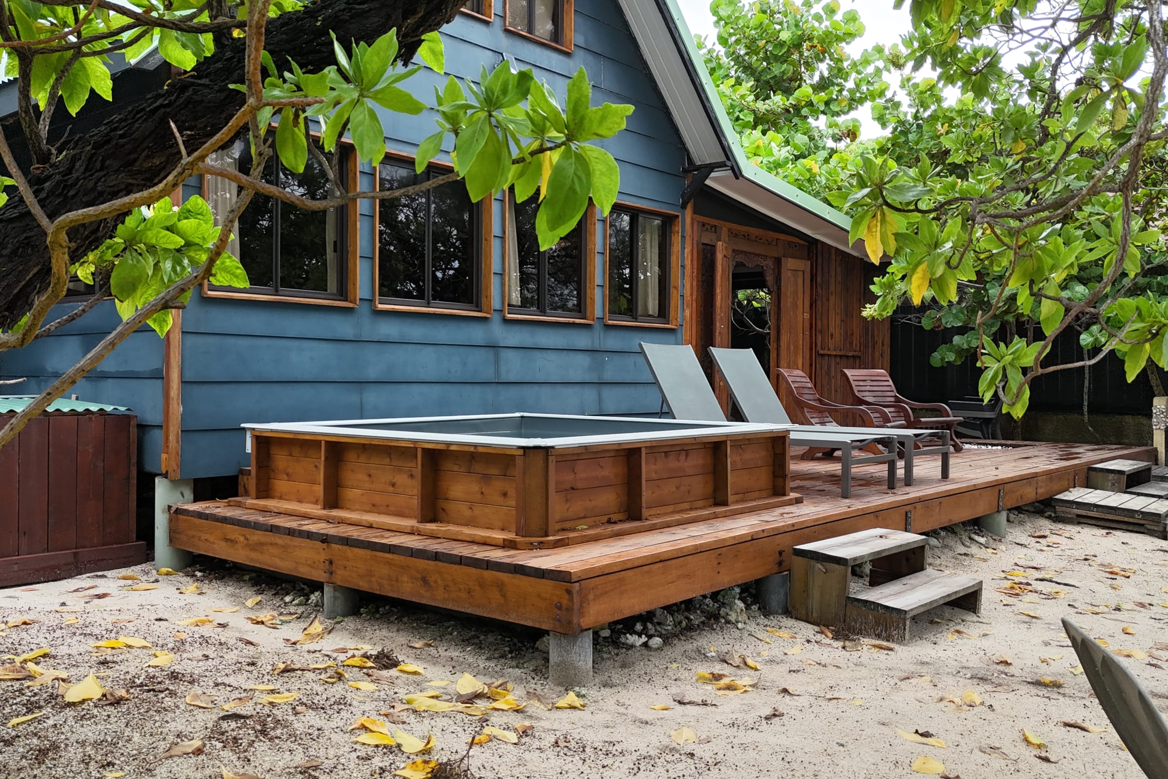 The bright, open-plan living room extends fully onto the shaded terrace and ocean beyond, blurring the line between inside and out. It’s a welcoming and peaceful space, ideal for reading, conversation, or simply admiring the lagoon. The kitchen, modest but fully functional, includes a fridge, microwave, coffee maker, and kettle. Portable fans are also available in the living area.