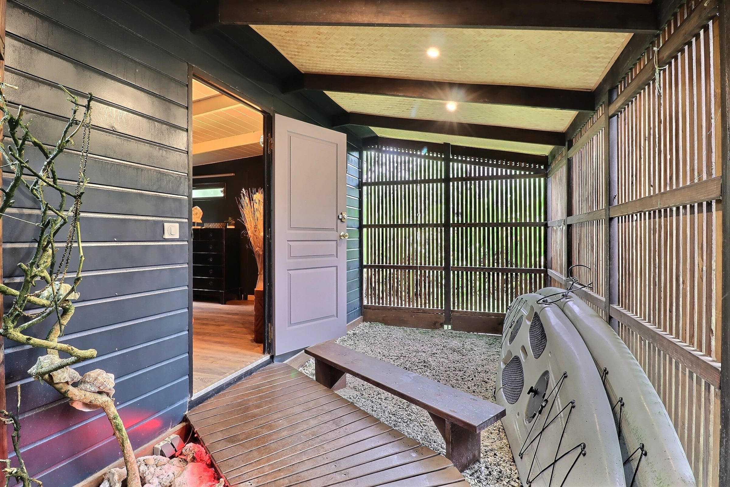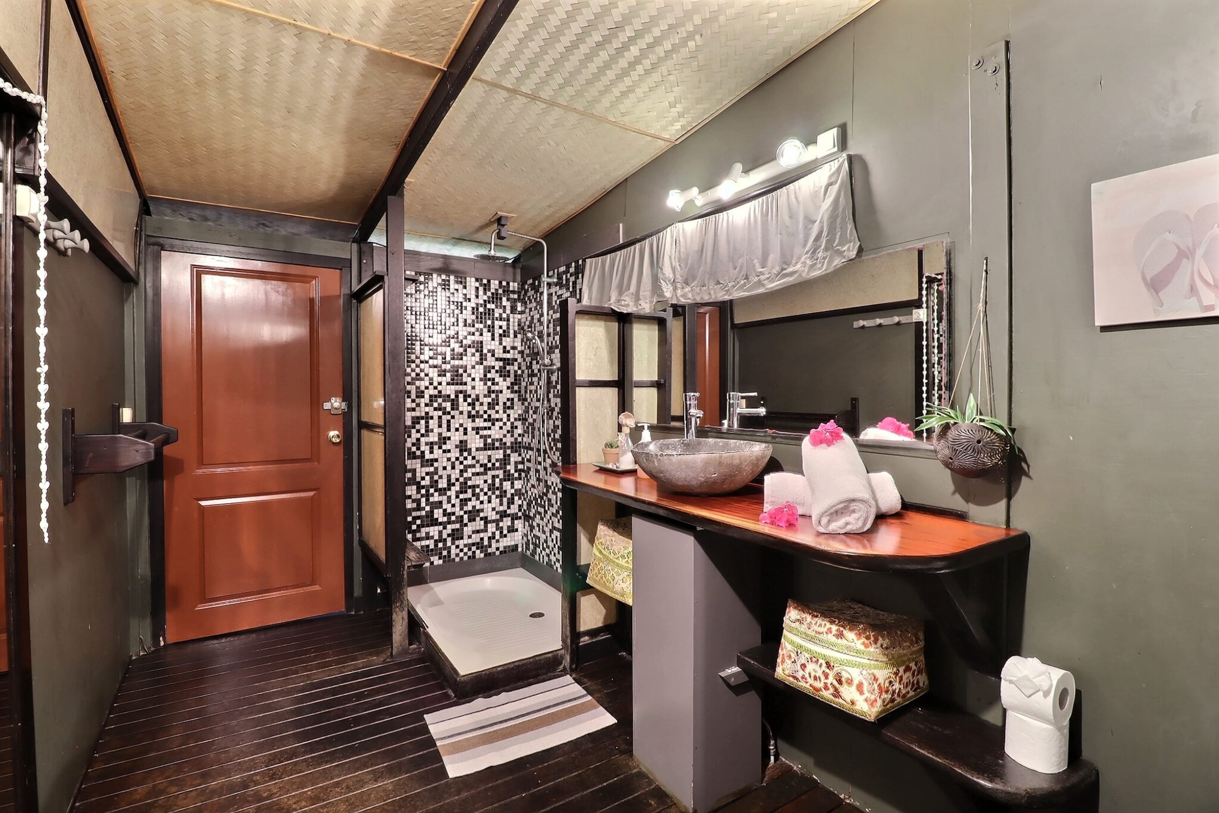 The home has one bathroom, equipped with a walk-in shower — ideal after a dip in the lagoon or a hike through the tropical landscape. Practical and minimal, it mirrors the home’s natural spirit.