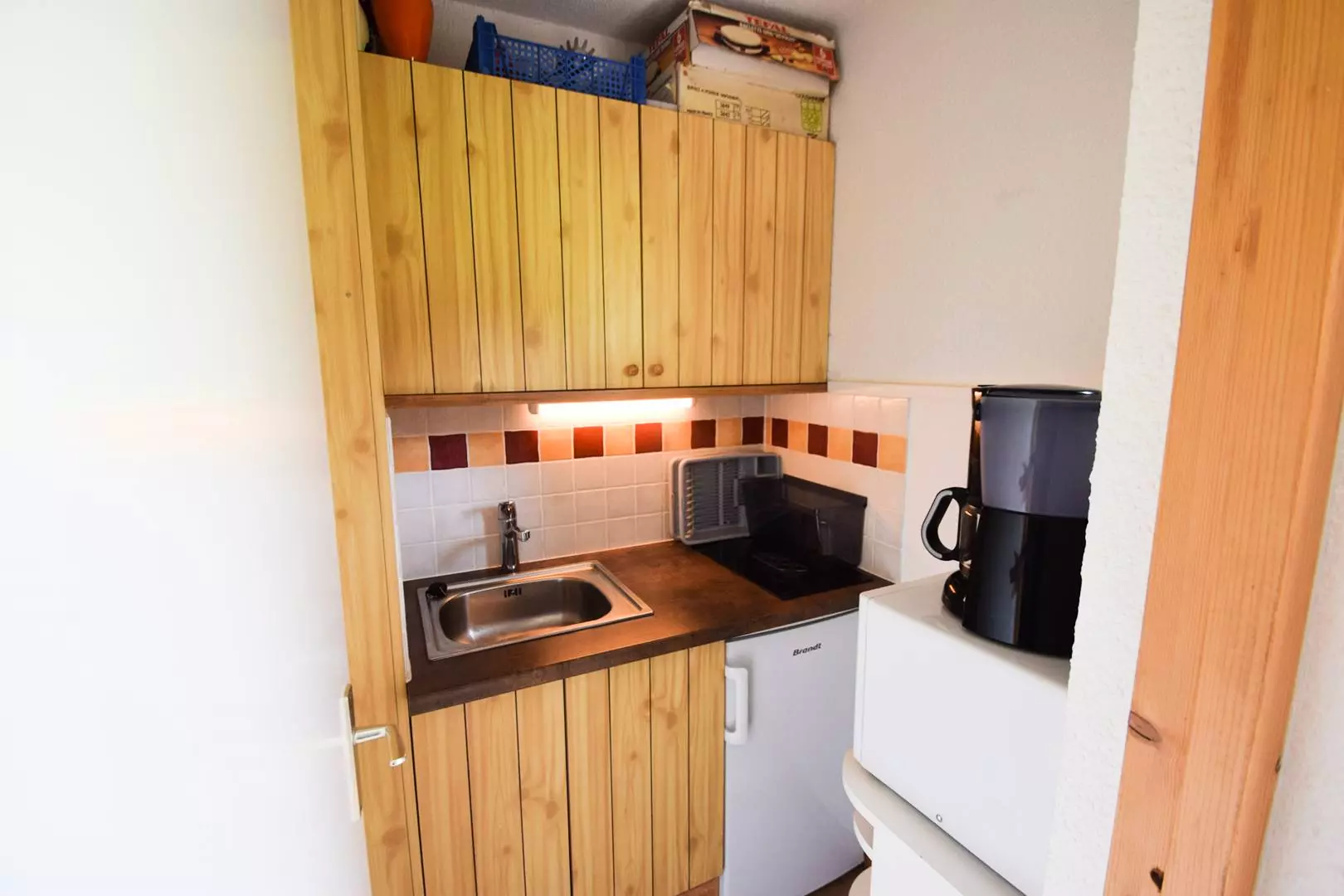 Divisible studio for 3/4 people, approx. 24m2, south-east facing with balcony, view of the slopes, 2nd floor with elevator - Kitchenette: 2 ceramic hobs, refrigerator, microwave oven - Living room: dining area, 2 pull-out beds, TV - Part divisible by a sliding partition: 2 bunk beds 70cm - Bathroom: bathtub, separate WC - Bedding: 1 double duvet + 2 single duvets - Floors: plastic - Ski locker: No. 200 on the ground floor