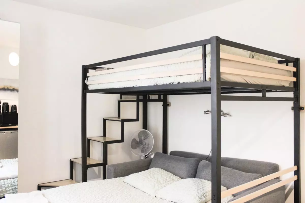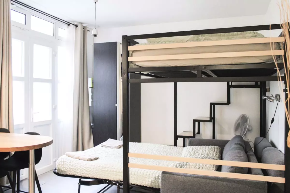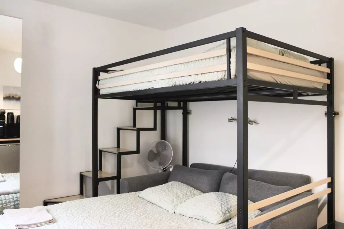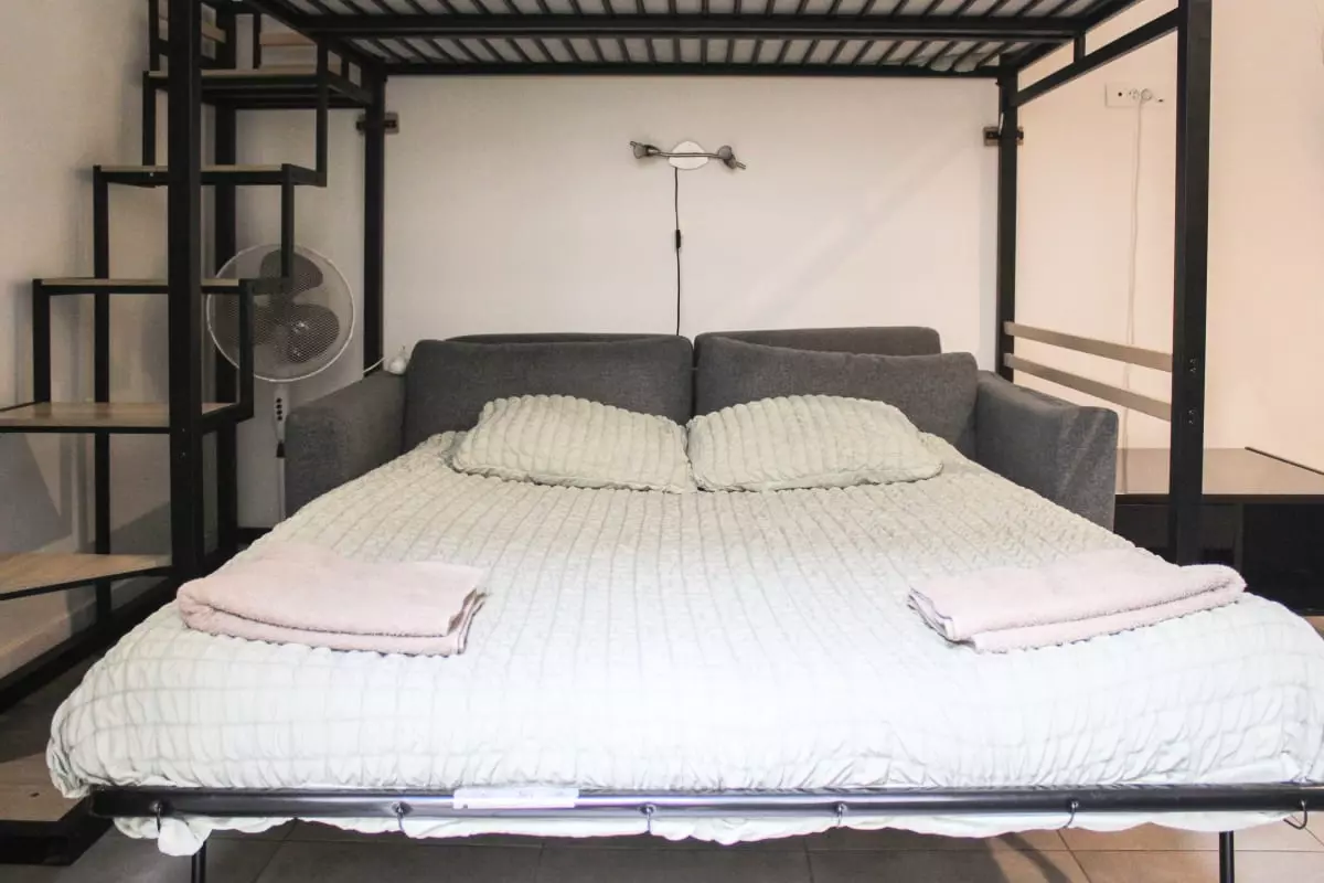 Designed to accommodate up to 4 people, the studio combines comfort and practicality: a sleeping area with a double bed, a lounge area with a convertible sofa, a functional bathroom, and all the equipment necessary for your stay (coffee machine, oven, microwave, washing machine, iron, hair dryer, etc.).