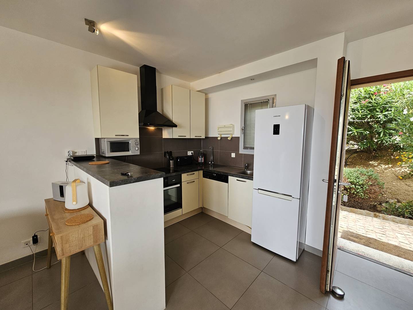Air conditioned villa, with 2 bedrooms and a sofa bed in the living room, for 6 people, located in a residence overlooking the bay of Tarco. 500m from sandy beaches, this villa has a private heated pool with alarm.