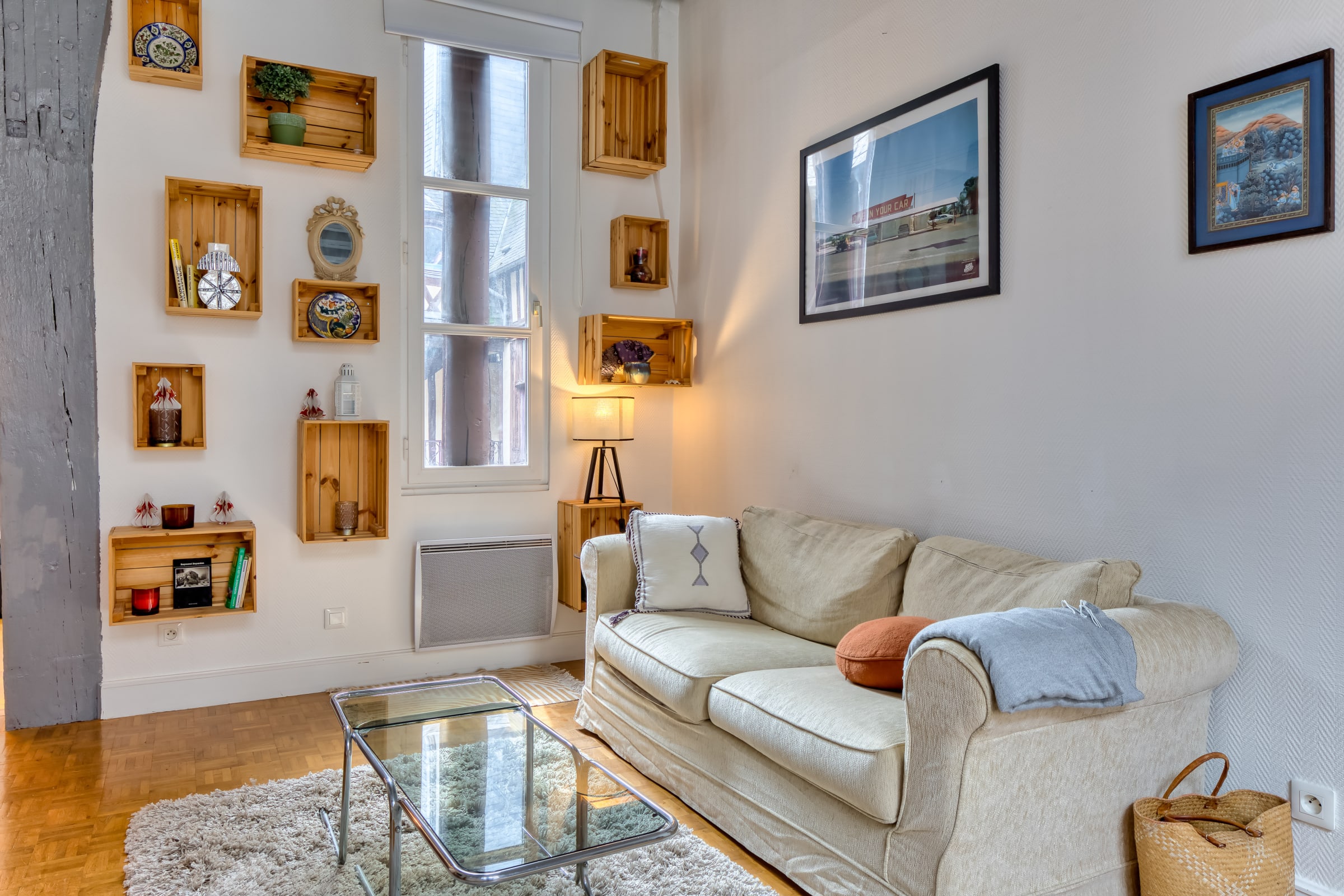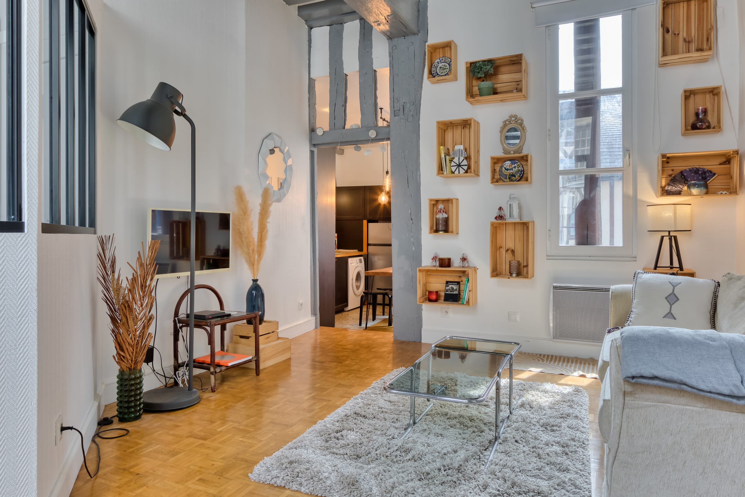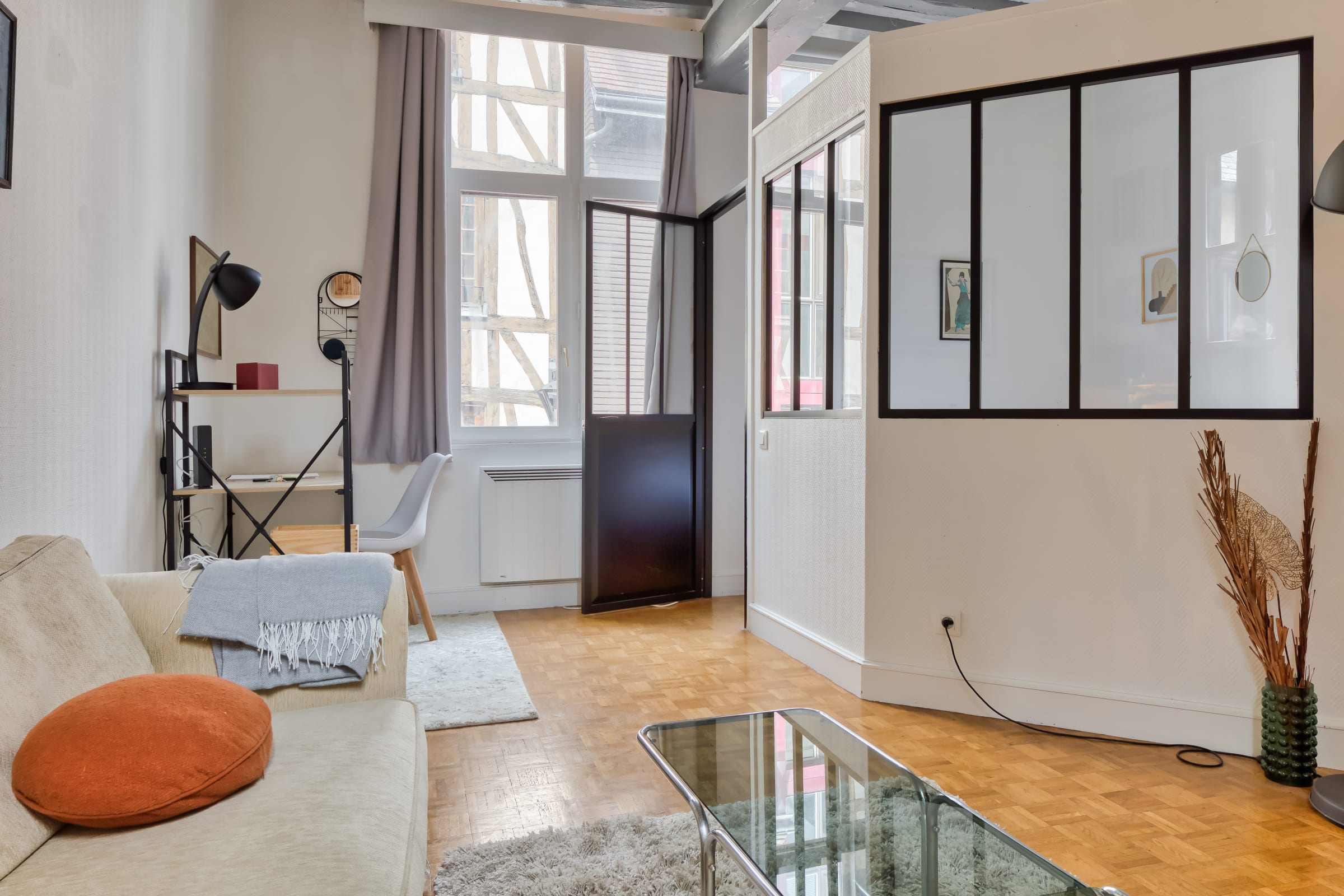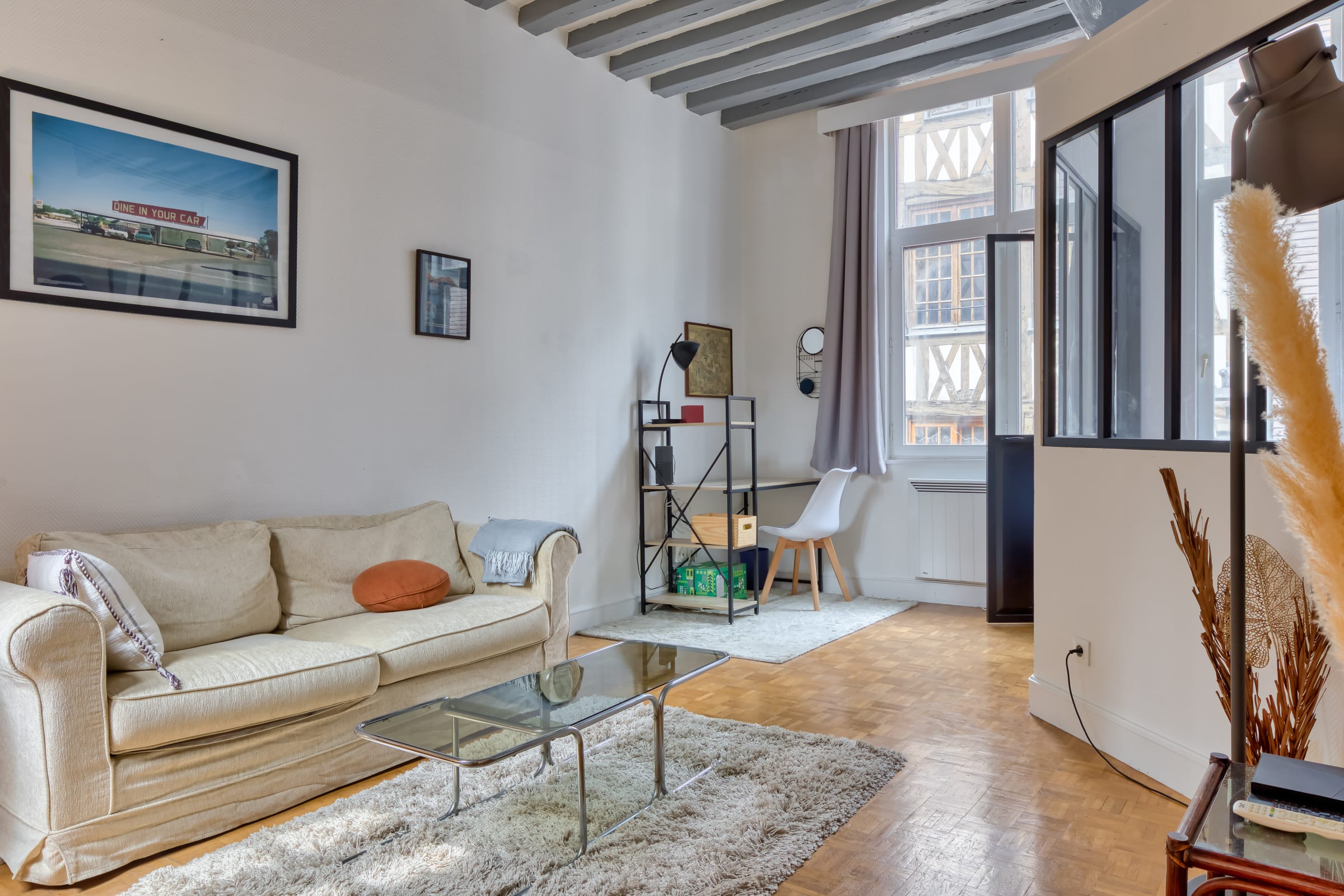 Let yourself be charmed by this delightful two-room apartment bathed in light, nestled in a quiet inner courtyard in the heart of Rouen's historic center. Just a few steps away from the famous Place du Vieux Marché, you will live to the rhythm of the city, among cobbled streets, designer boutiques, lively terraces, and friendly restaurants. This 40 m² apartment, located on the floor of a listed building, welcomes you into a soft and cozy atmosphere, elegantly blending the charm of the old with contemporary comfort.