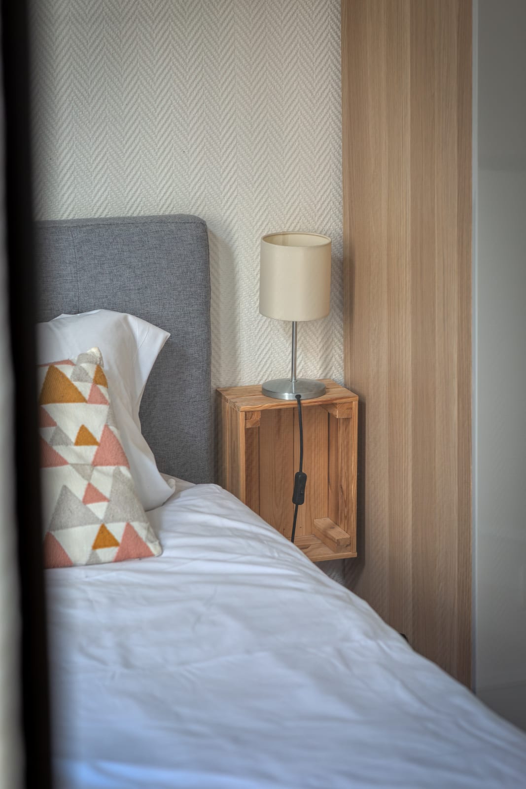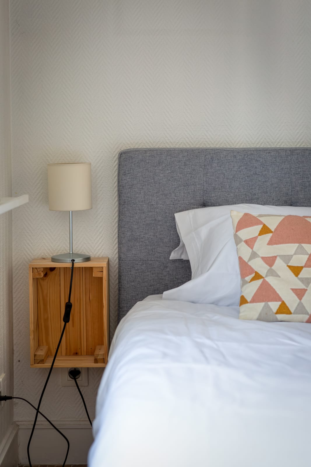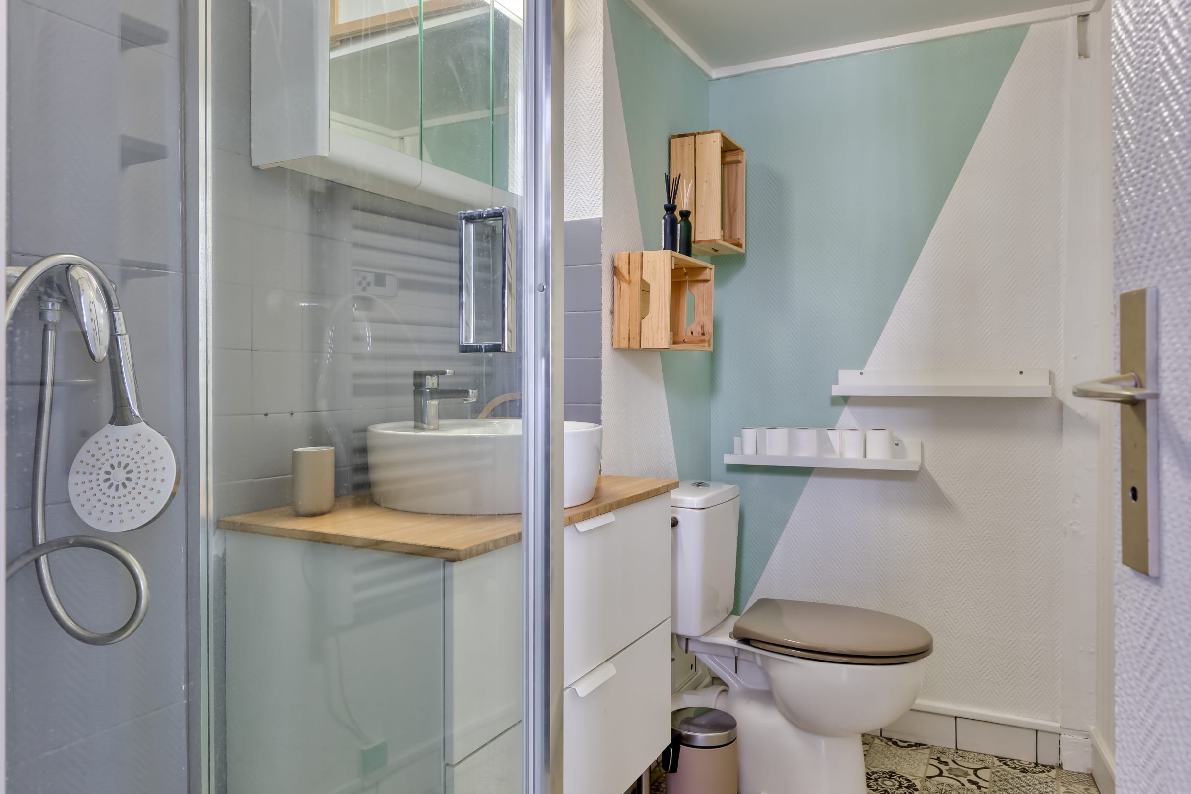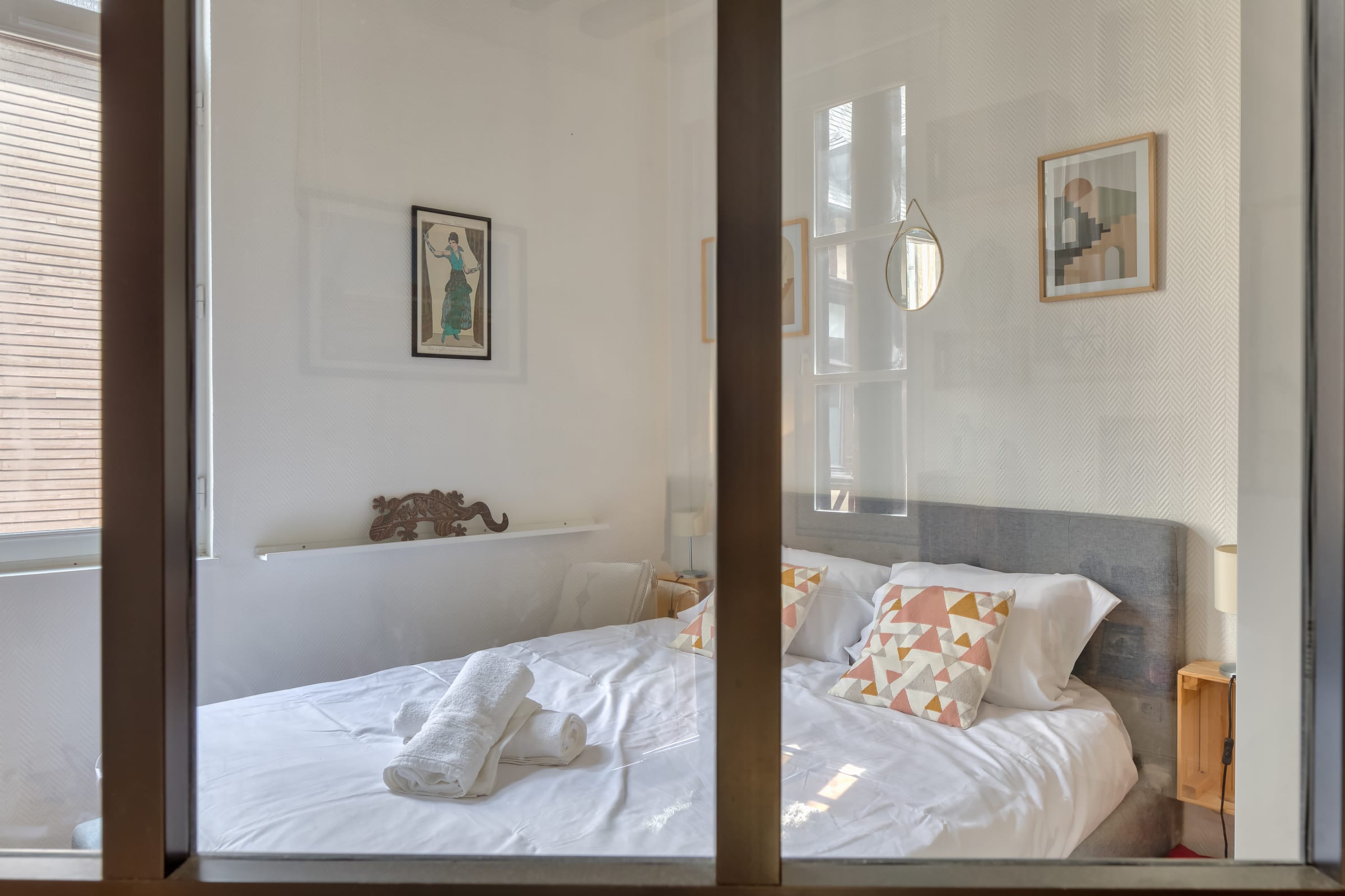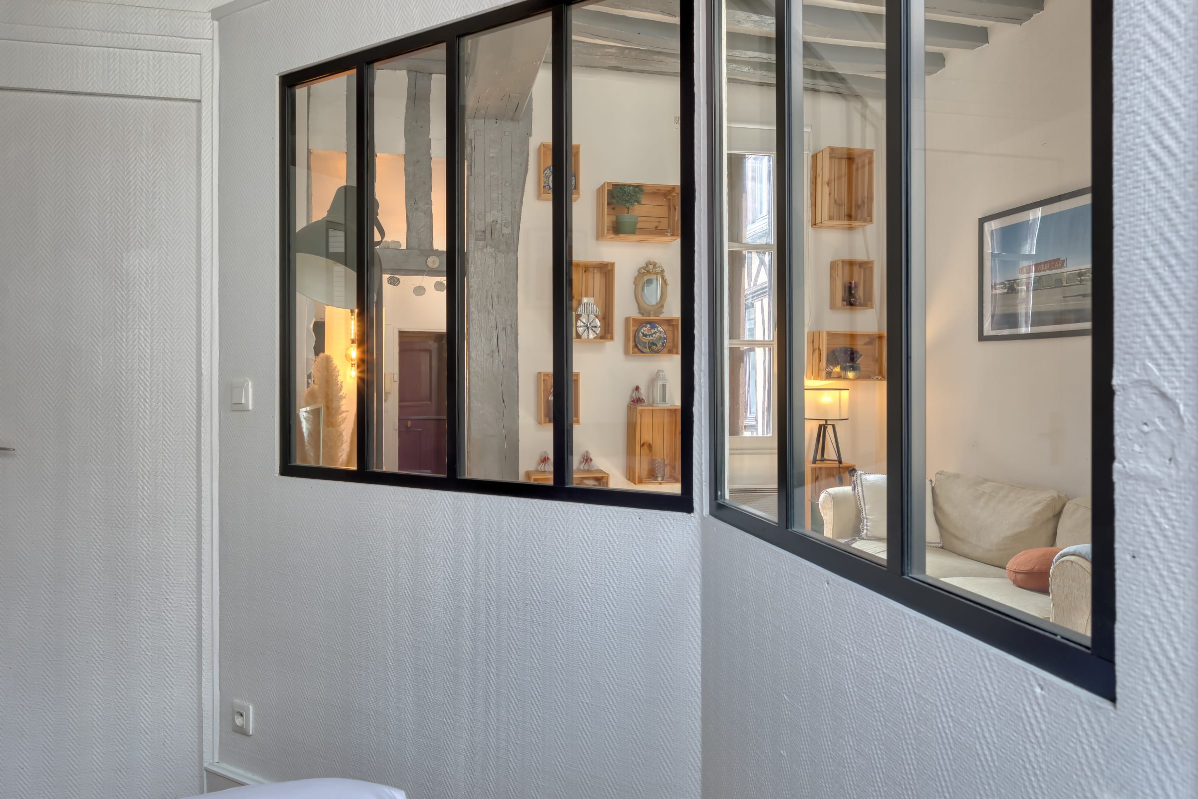 The sleeping area, separated by an elegant glass partition, has a comfortable double bed and practical storage space. Adjacent to the bedroom, the bathroom has a shower, sink, toilet, and hairdryer. Whether you are traveling for business, on a romantic getaway, or staying with a young child, you will find all the comforts you need, including a crib available for the little ones. Ideally located and carefully furnished, this cozy retreat in the heart of Rouen is the perfect place for a peaceful and inspiring break, surrounded by heritage, culture, and a relaxed lifestyle.