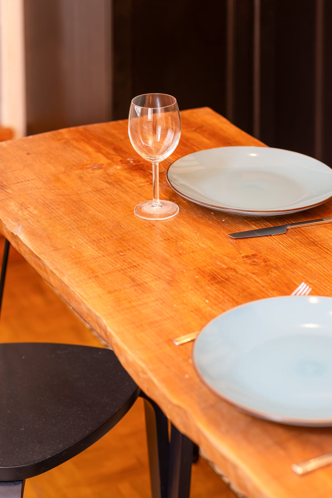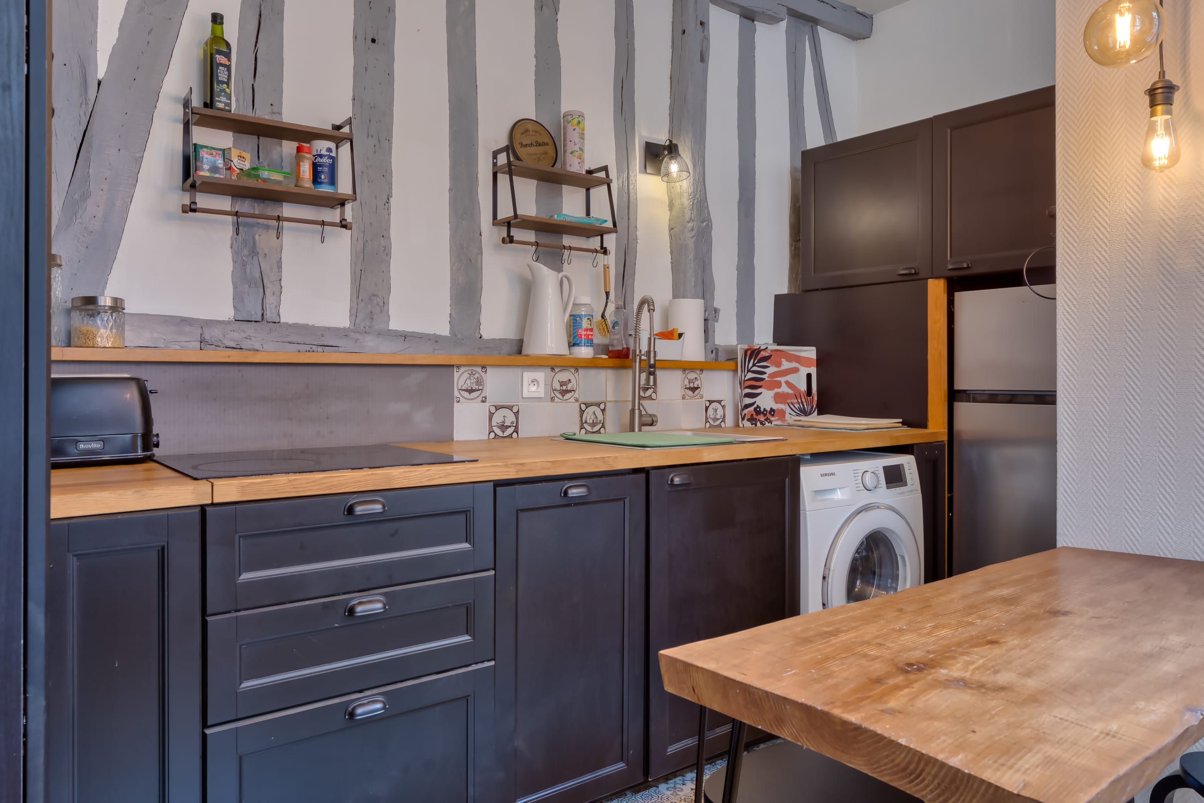 The exposed beams, half-timbering, and high ceilings offer an authentic and charming setting, while the bohemian decor, glass partition, and natural colors add a modern and warm touch. The living area invites you to relax with its cozy sofa, TV, coffee table, and desk area, ideal for working or planning your days. The open-plan, fully equipped kitchen allows you to prepare your meals just like at home, whether it's a quick coffee before heading out to explore the city or a simple dinner. It includes a dishwasher, washing machine, kettle, coffee maker, toaster, microwave, refrigerator/freezer, and all necessary kitchen utensils.