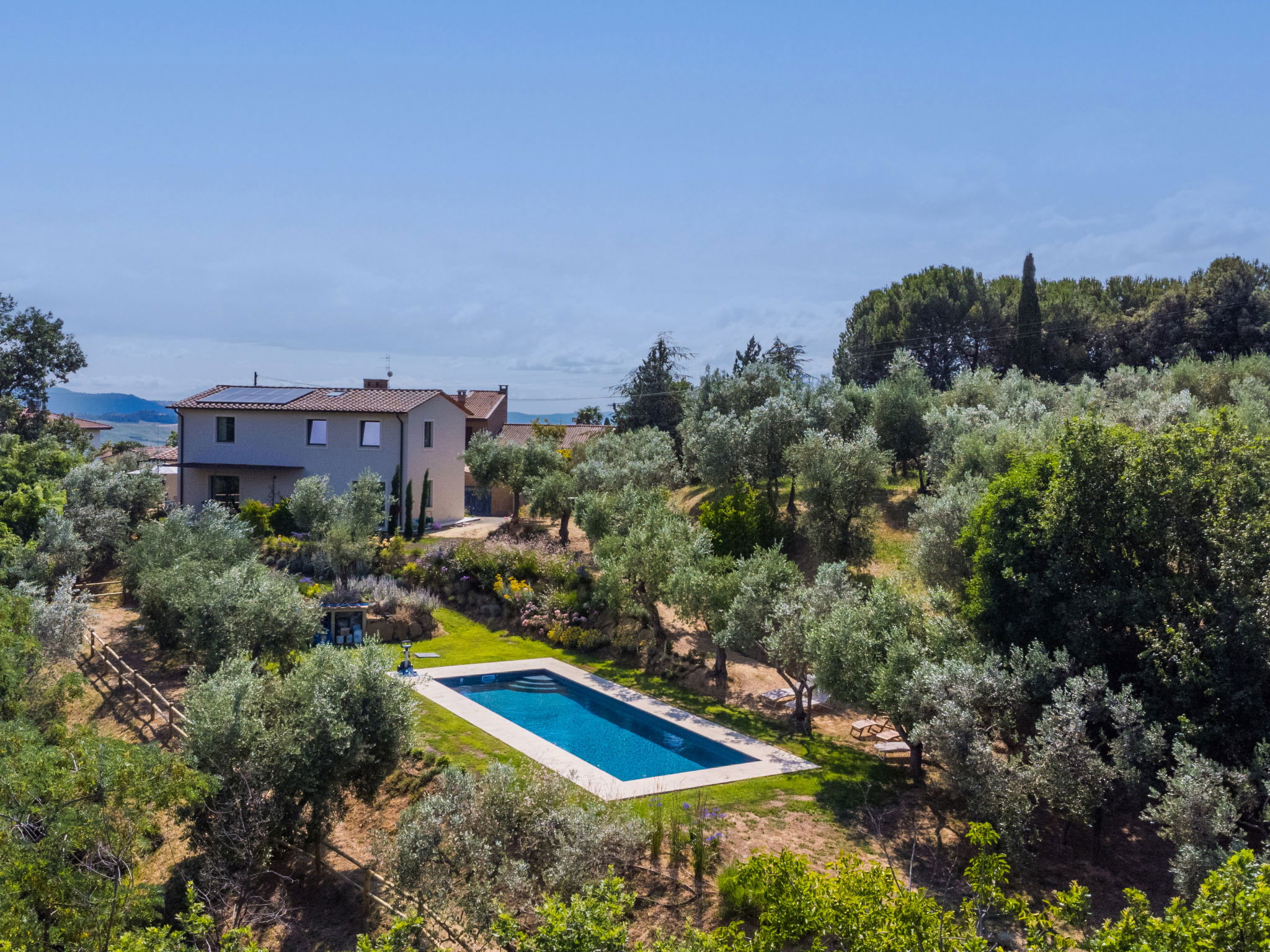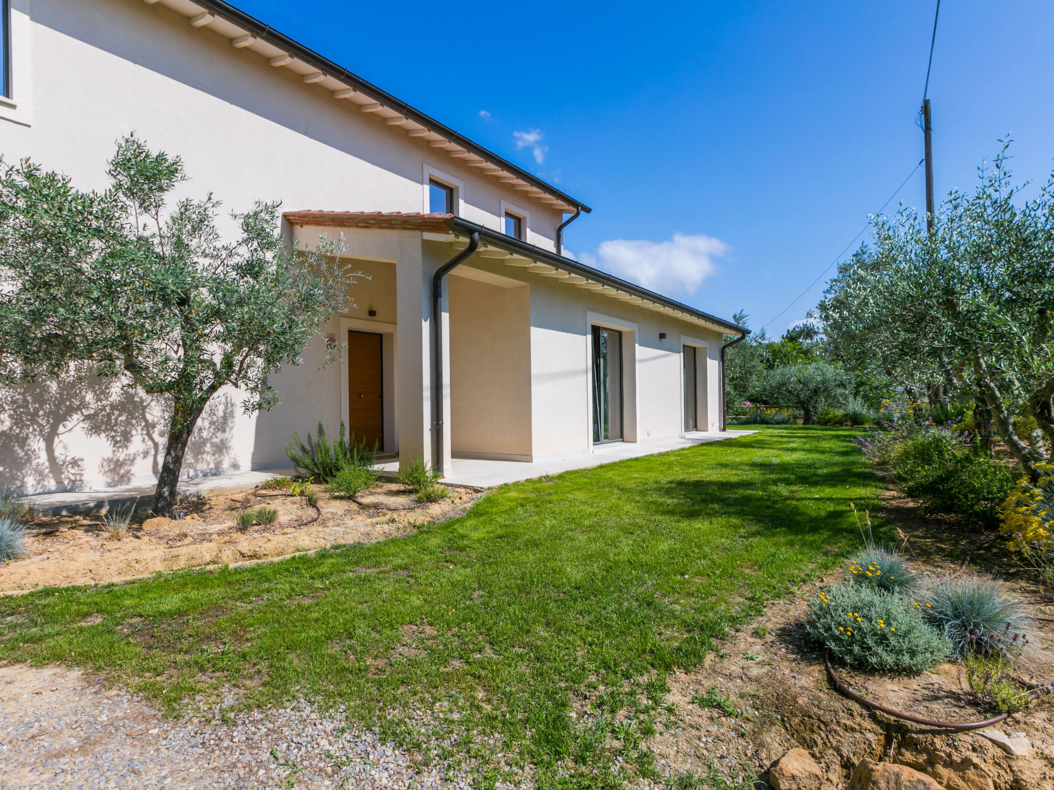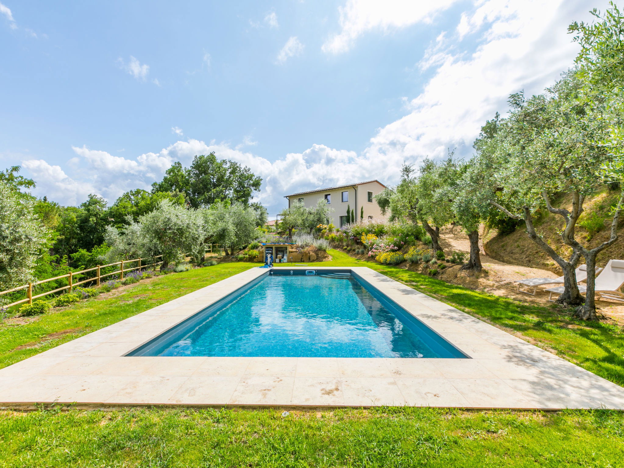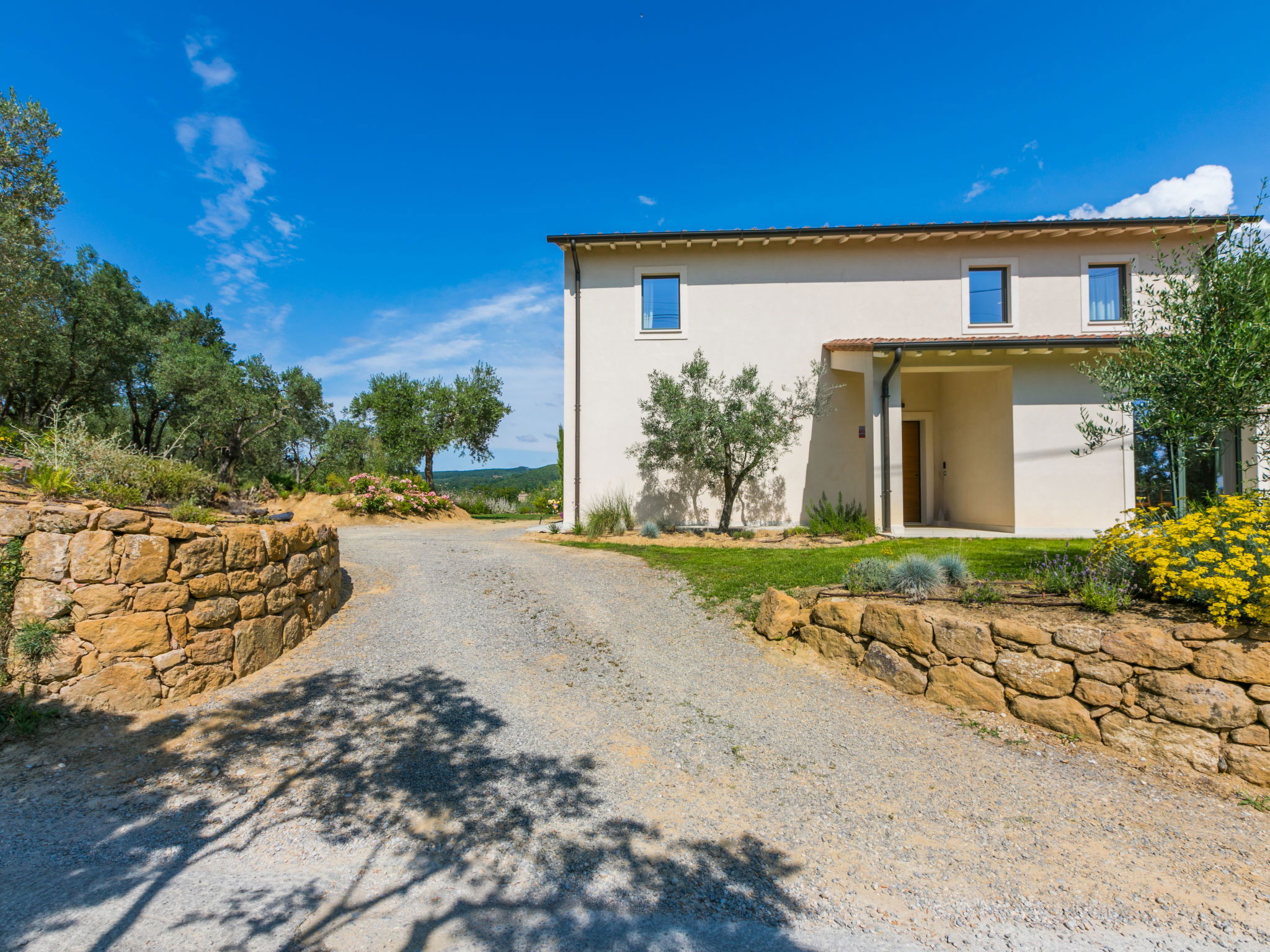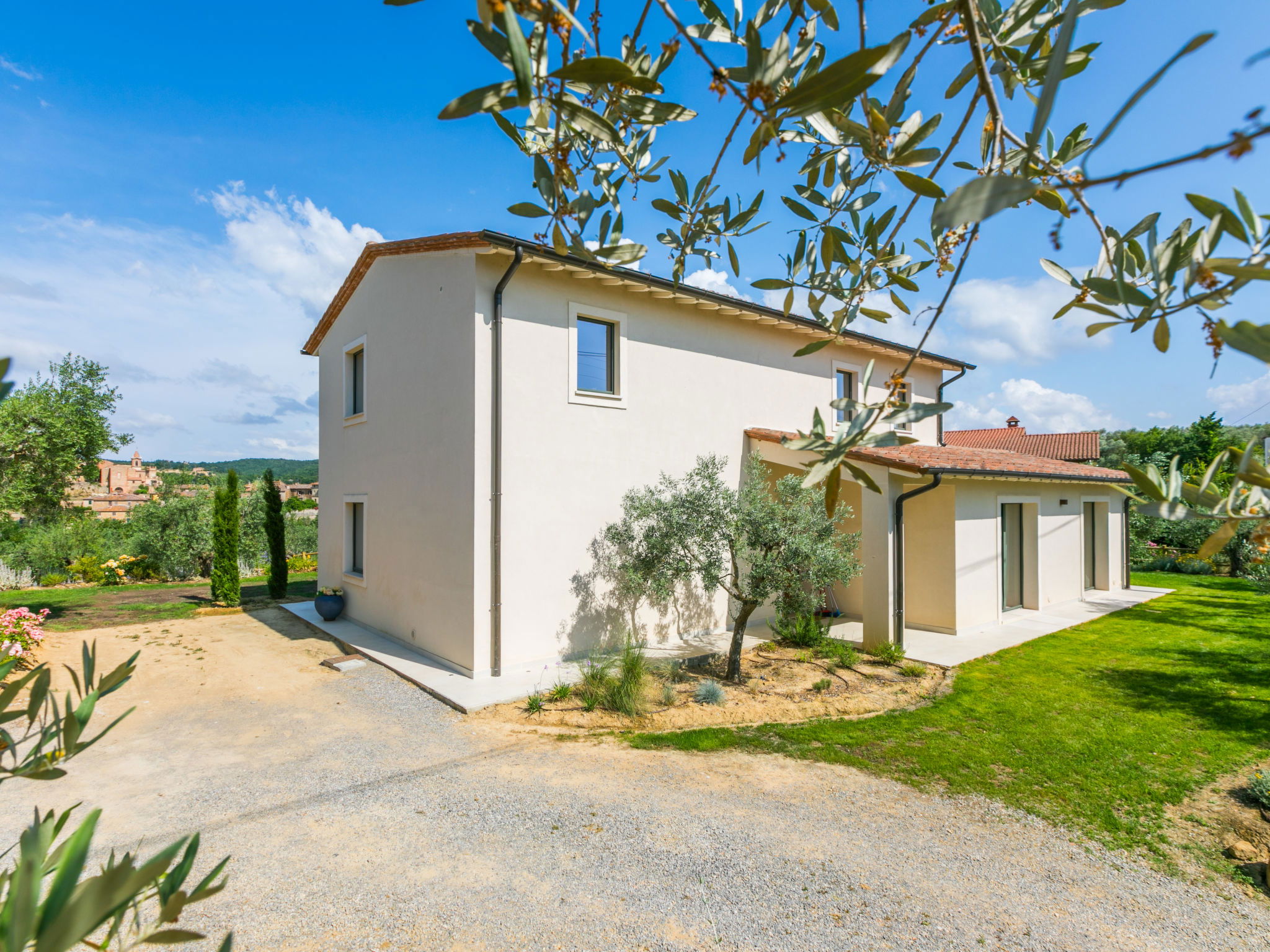 Montisi 15 km from Montalcino: Modern, beautiful house "Villa Montisi", 2 storeys, built in 2020, surrounded by trees and fields. 500 m from the centre of Montisi, in a sunny, elevated position in the residential district, in the countryside. Private: beautiful garden with flowers and trees, swimming pool (4 x 12 m, depth 120 - 150 cm, seasonal availability: 01.May. - 30.Sep.) with internal staircase. Outdoor shower, garden furniture, barbecue, pool maintenance by the owner/gardener. In the house: air conditioning, washing machine, tumble dryer. Storeroom available. Parking at the house on the premises. Shop, grocery 500 m, supermarket 10 km, restaurant 500 m, 5 minute walk to the centre, bus stop "Montisi" 500 m. Nearby attractions: Montalcino 23 km, Pienza 30 km, Montapulciano 25 km, Siena 50 km. Please note: baby equipment (included). Groups of teenagers on request only.