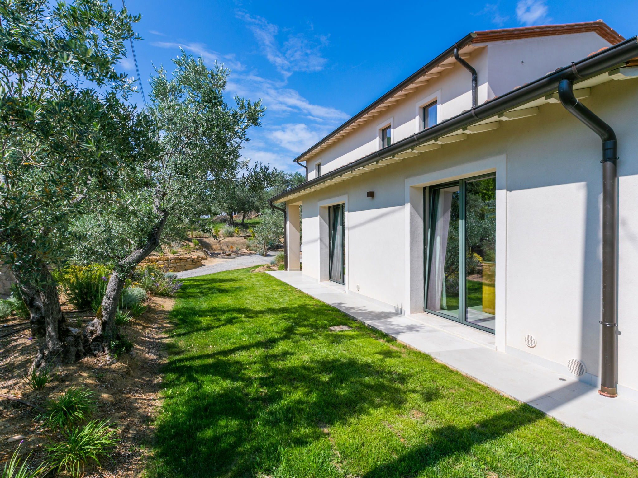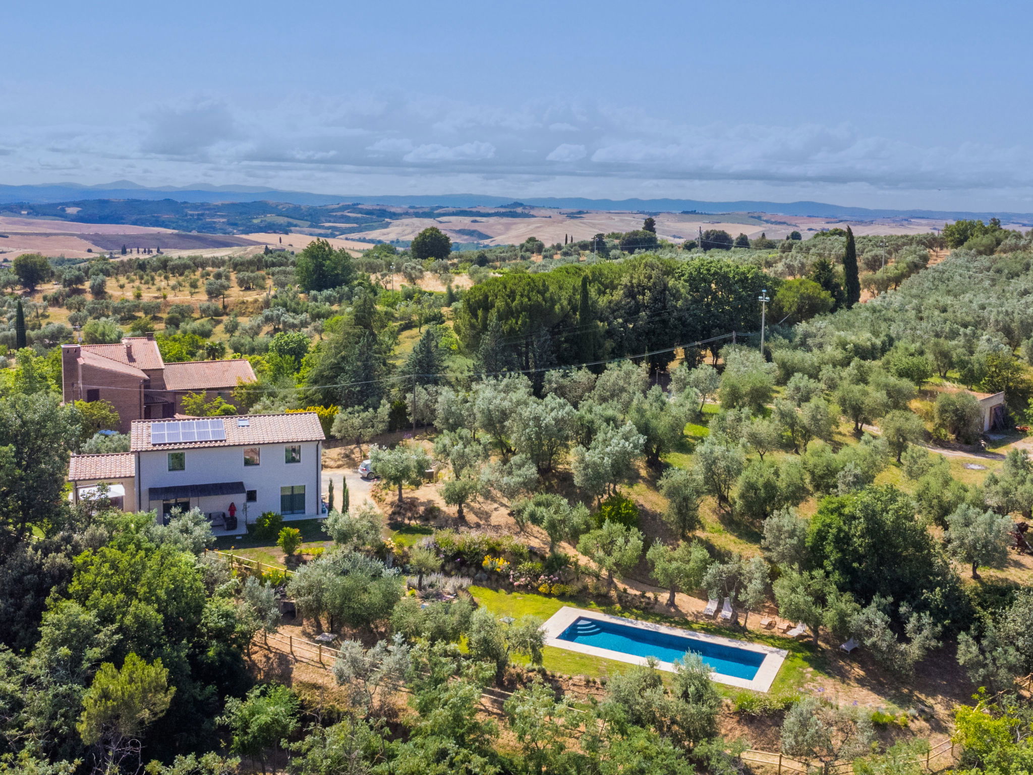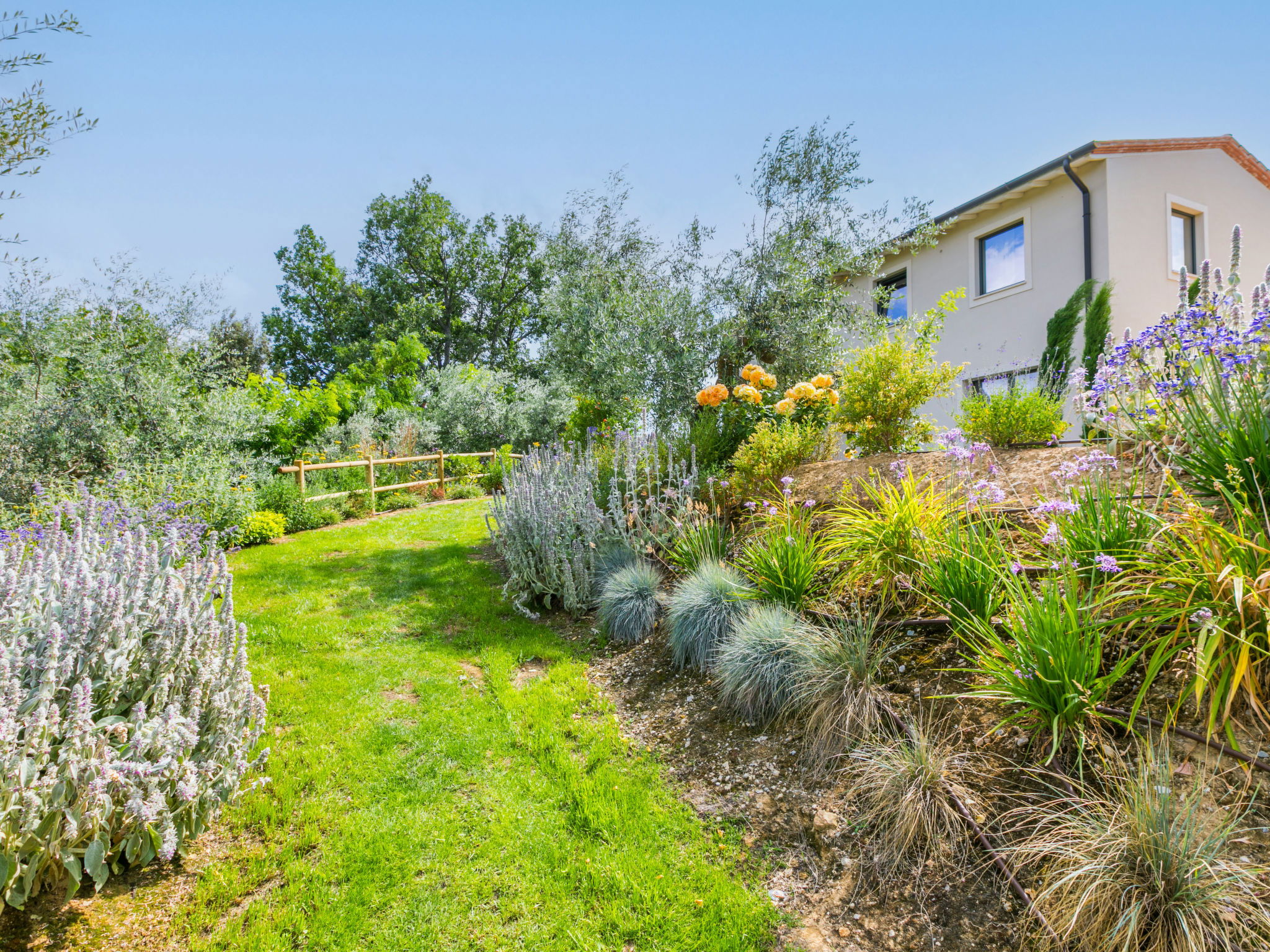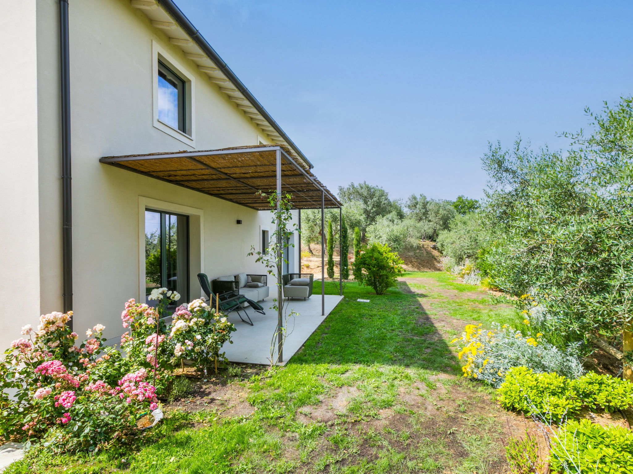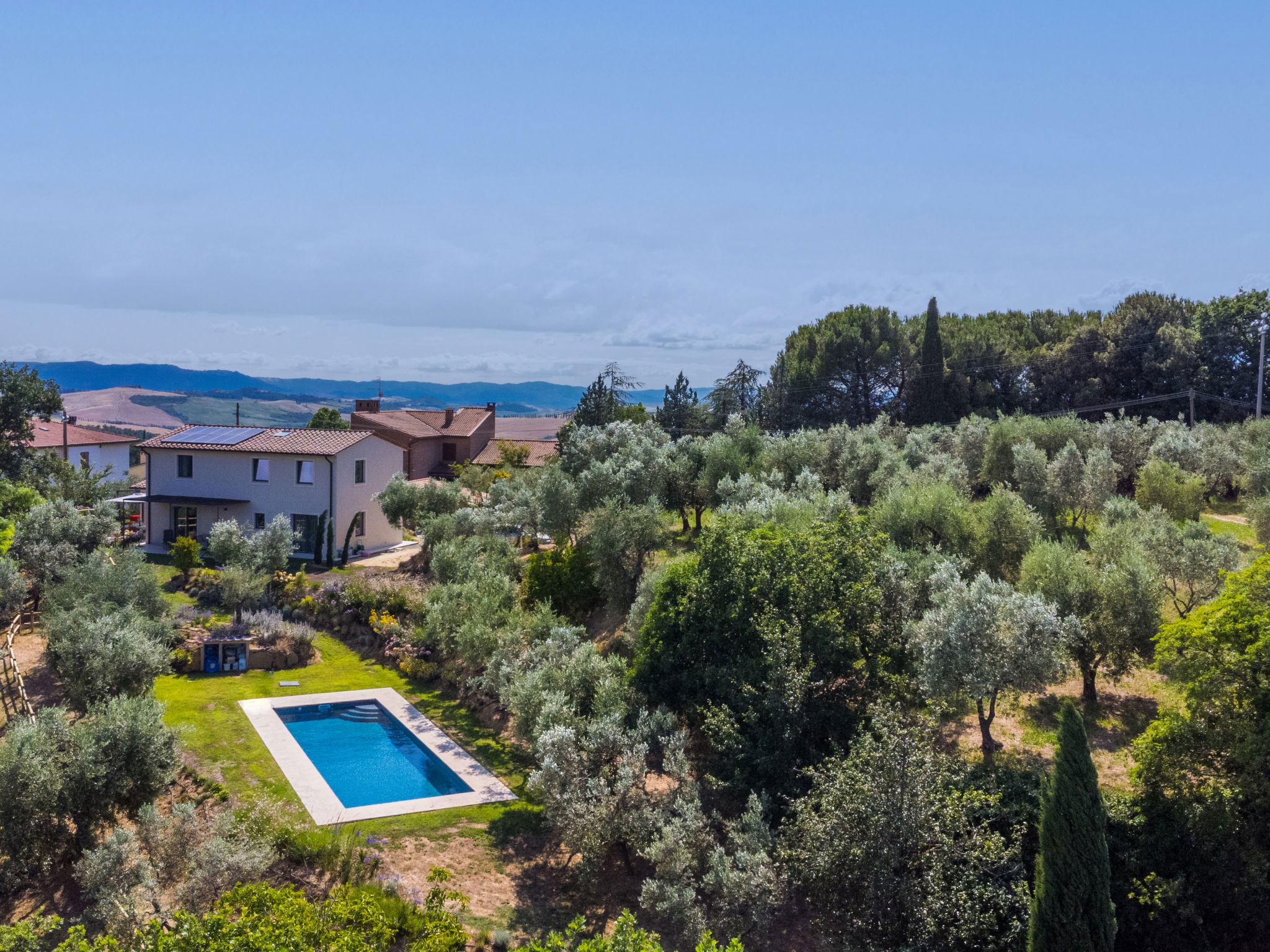 Montisi 15 km from Montalcino: Modern, beautiful house "Villa Montisi", 2 storeys, built in 2020, surrounded by trees and fields. 500 m from the centre of Montisi, in a sunny, elevated position in the residential district, in the countryside. Private: beautiful garden with flowers and trees, swimming pool (4 x 12 m, depth 120 - 150 cm, seasonal availability: 01.May. - 30.Sep.) with internal staircase. Outdoor shower, garden furniture, barbecue, pool maintenance by the owner/gardener. In the house: air conditioning, washing machine, tumble dryer. Storeroom available. Parking at the house on the premises. Shop, grocery 500 m, supermarket 10 km, restaurant 500 m, 5 minute walk to the centre, bus stop "Montisi" 500 m. Nearby attractions: Montalcino 23 km, Pienza 30 km, Montapulciano 25 km, Siena 50 km. Please note: baby equipment (included). Groups of teenagers on request only.
