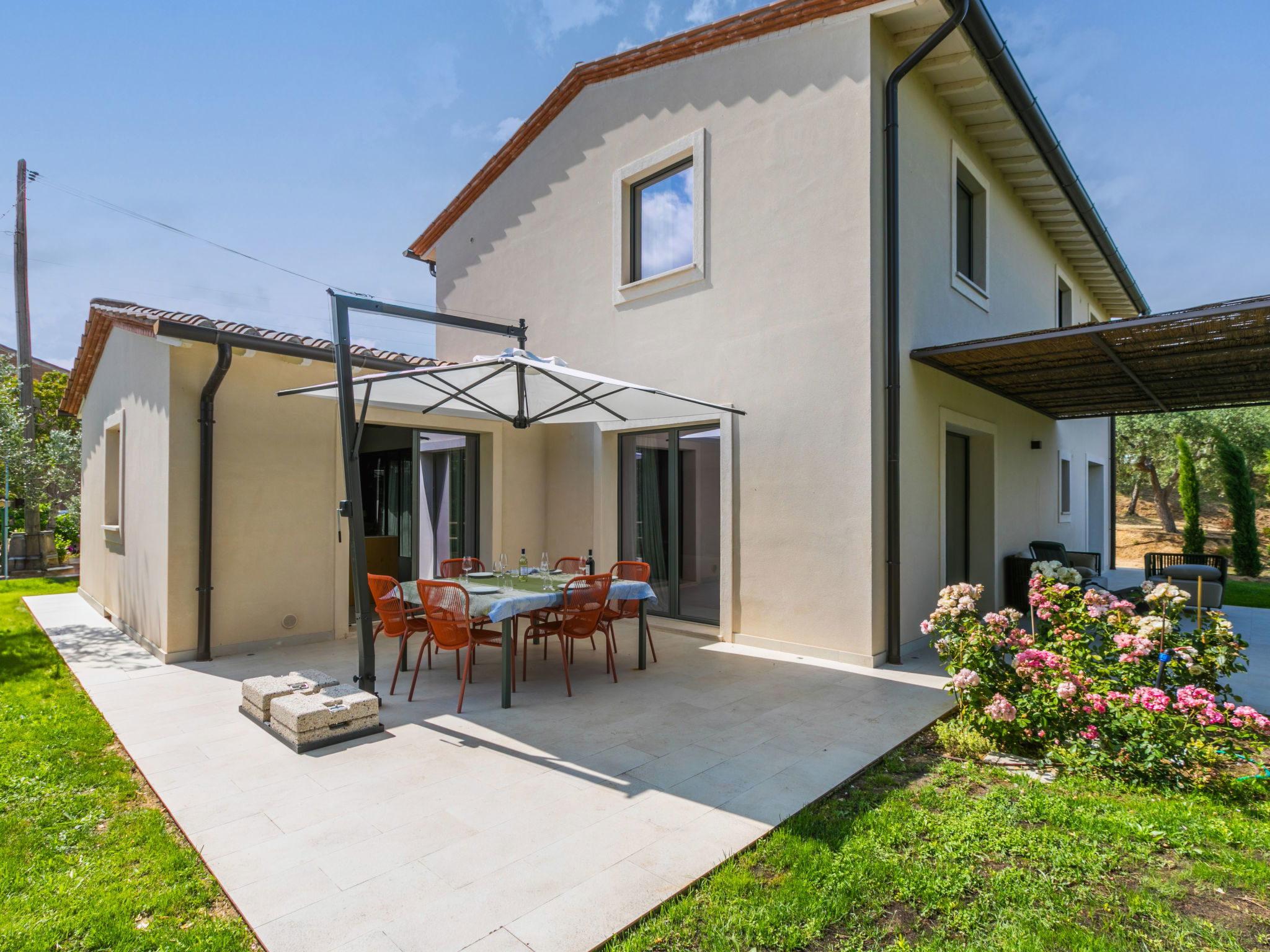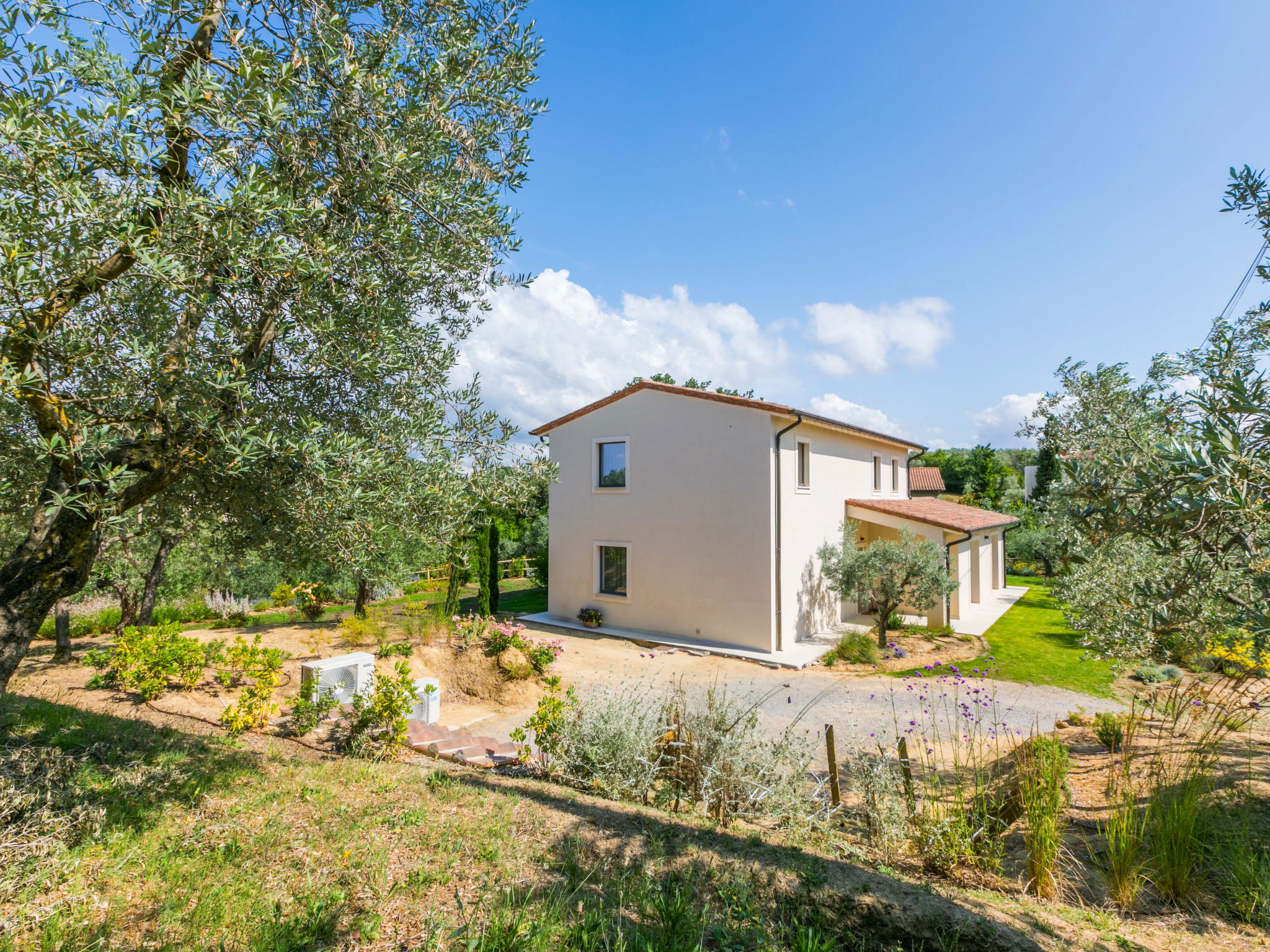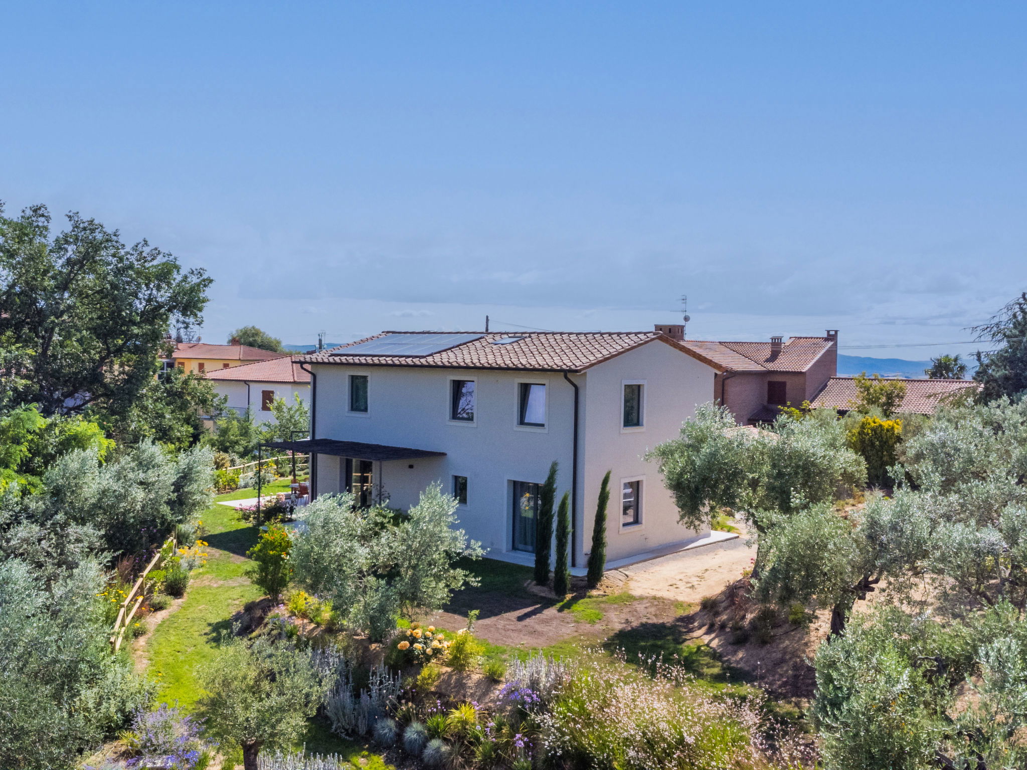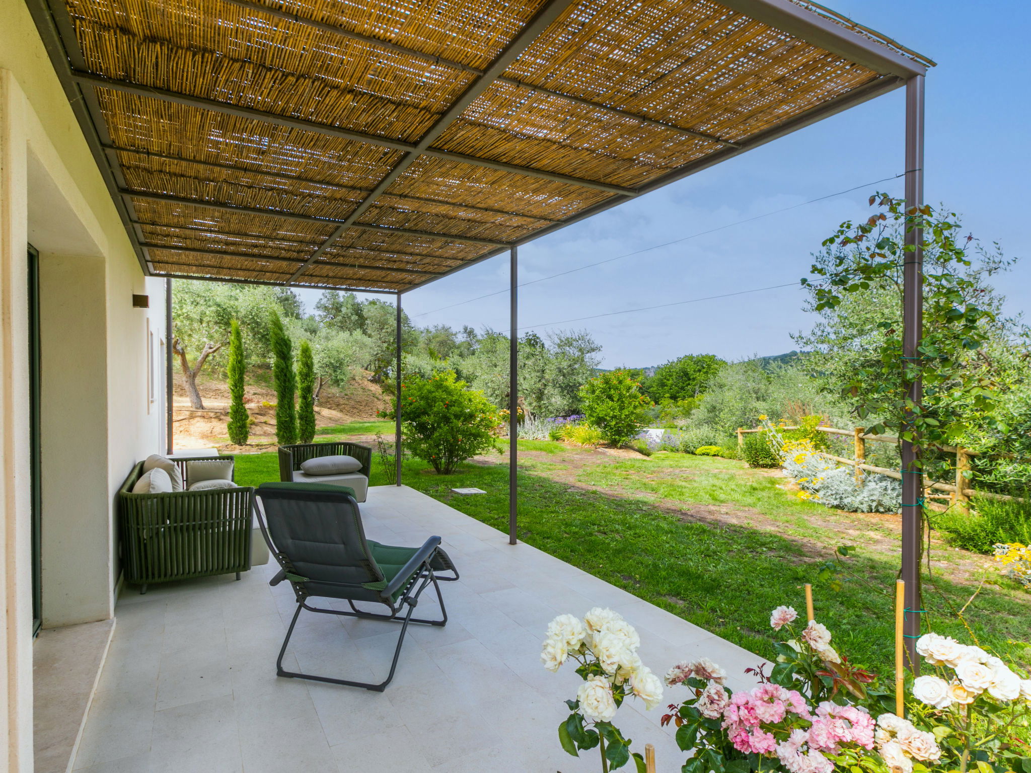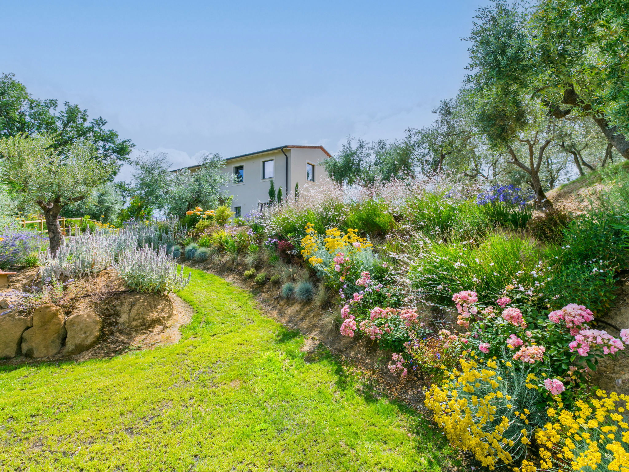 Montisi 15 km from Montalcino: Modern, beautiful house "Villa Montisi", 2 storeys, built in 2020, surrounded by trees and fields. 500 m from the centre of Montisi, in a sunny, elevated position in the residential district, in the countryside. Private: beautiful garden with flowers and trees, swimming pool (4 x 12 m, depth 120 - 150 cm, seasonal availability: 01.May. - 30.Sep.) with internal staircase. Outdoor shower, garden furniture, barbecue, pool maintenance by the owner/gardener. In the house: air conditioning, washing machine, tumble dryer. Storeroom available. Parking at the house on the premises. Shop, grocery 500 m, supermarket 10 km, restaurant 500 m, 5 minute walk to the centre, bus stop "Montisi" 500 m. Nearby attractions: Montalcino 23 km, Pienza 30 km, Montapulciano 25 km, Siena 50 km. Please note: baby equipment (included). Groups of teenagers on request only.