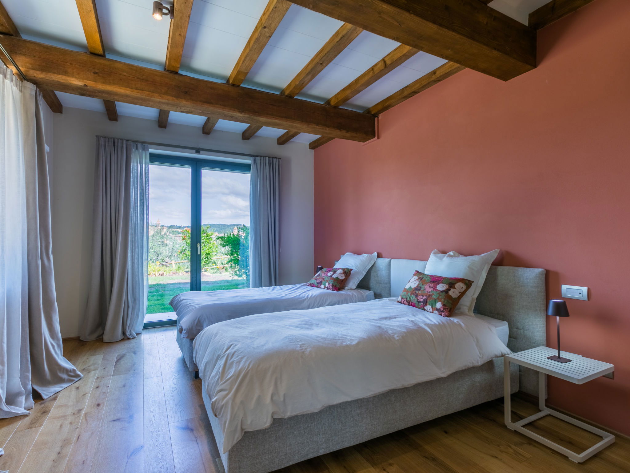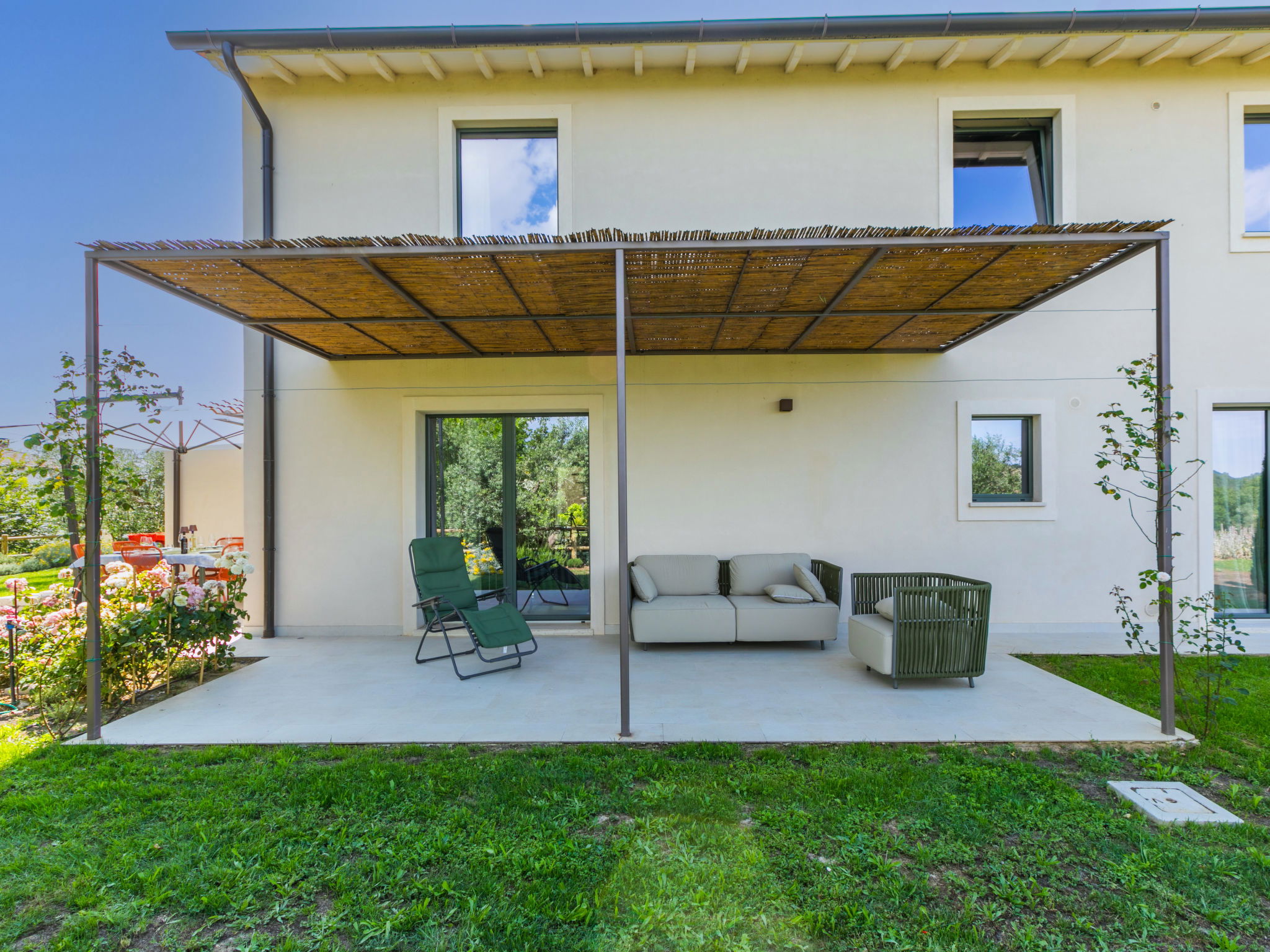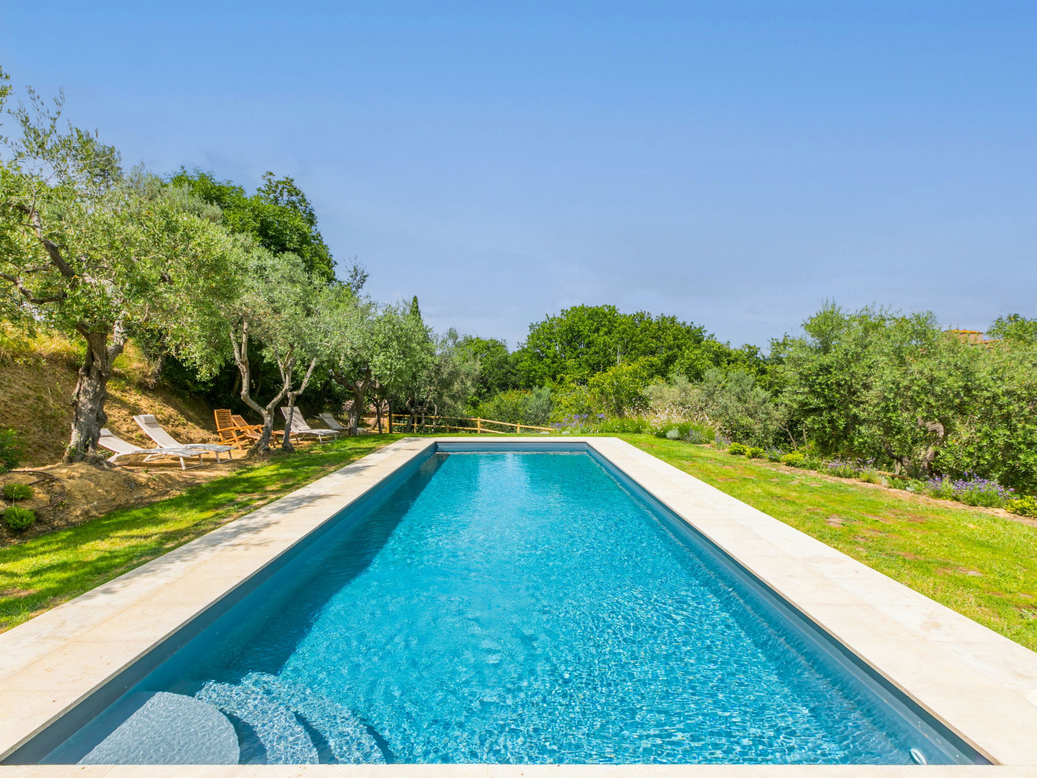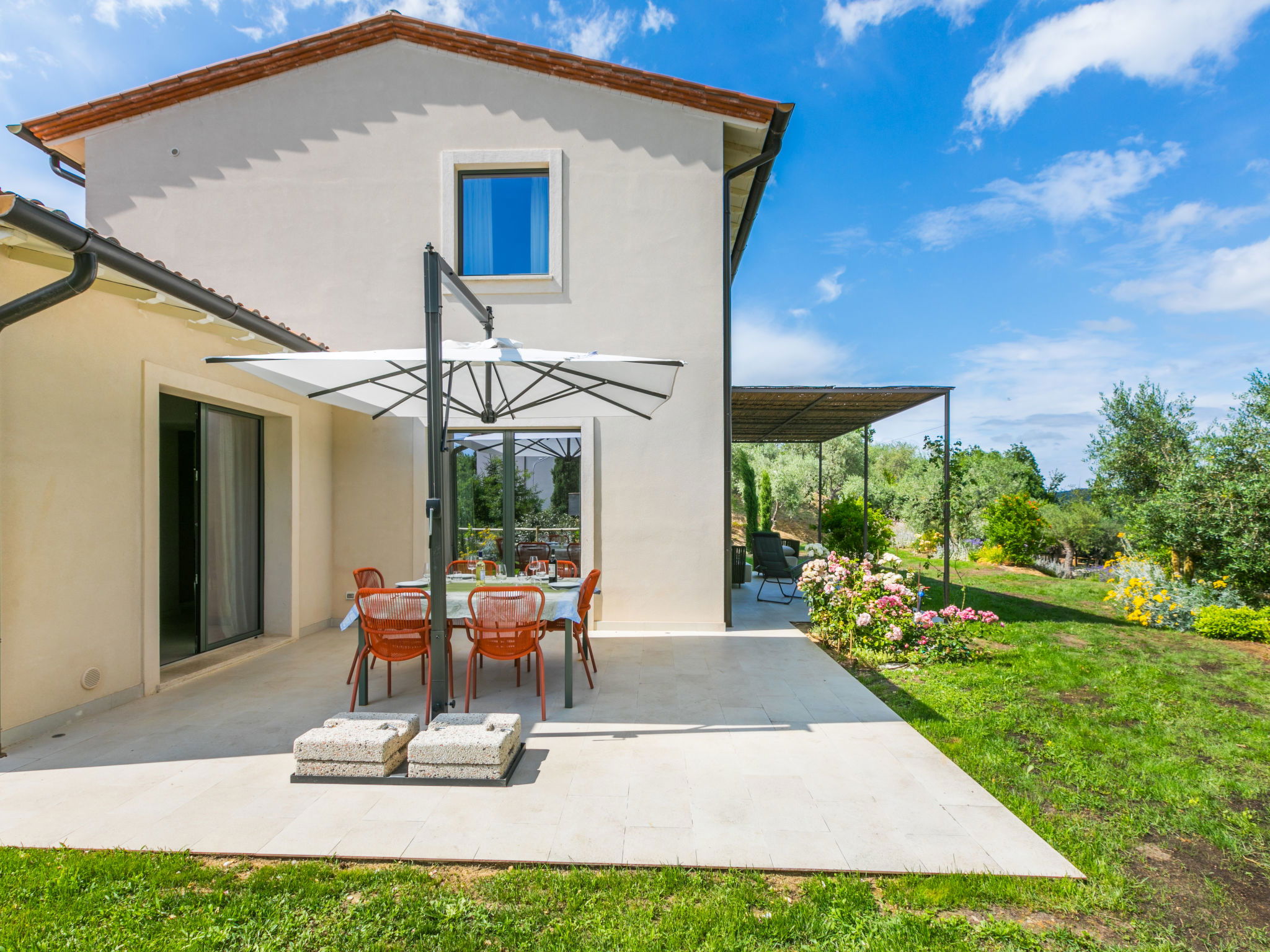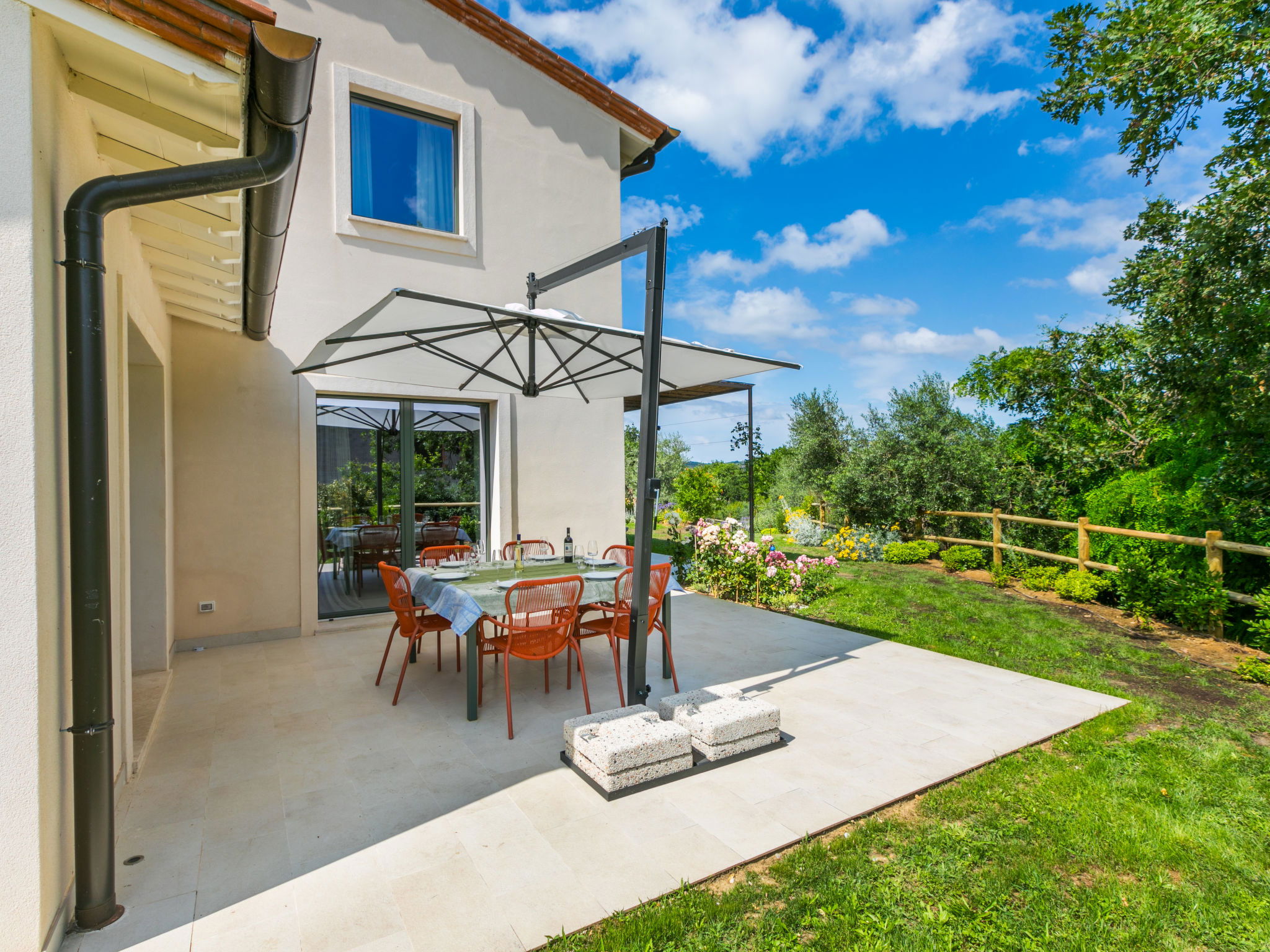 Montisi 15 km from Montalcino: Modern, beautiful house "Villa Montisi", 2 storeys, built in 2020, surrounded by trees and fields. 500 m from the centre of Montisi, in a sunny, elevated position in the residential district, in the countryside. Private: beautiful garden with flowers and trees, swimming pool (4 x 12 m, depth 120 - 150 cm, seasonal availability: 01.May. - 30.Sep.) with internal staircase. Outdoor shower, garden furniture, barbecue, pool maintenance by the owner/gardener. In the house: air conditioning, washing machine, tumble dryer. Storeroom available. Parking at the house on the premises. Shop, grocery 500 m, supermarket 10 km, restaurant 500 m, 5 minute walk to the centre, bus stop "Montisi" 500 m. Nearby attractions: Montalcino 23 km, Pienza 30 km, Montapulciano 25 km, Siena 50 km. Please note: baby equipment (included). Groups of teenagers on request only.