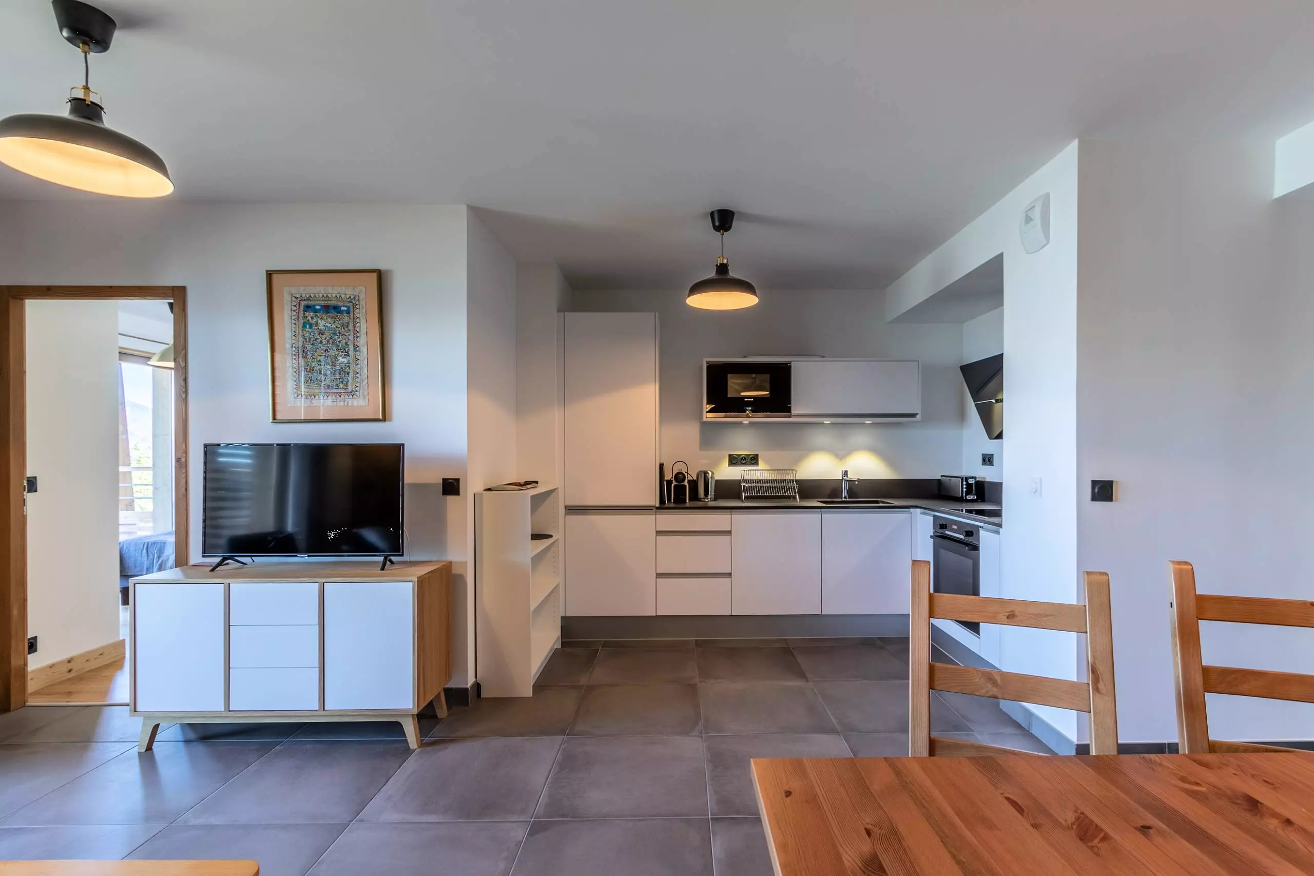 - Kitchen open to the living room: hotplates, dishwasher, fridge-freezer, oven, Nespresso, kettle, toaster