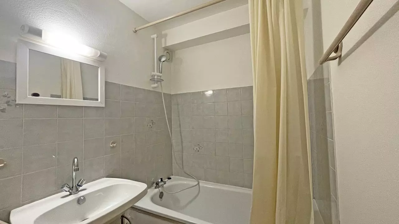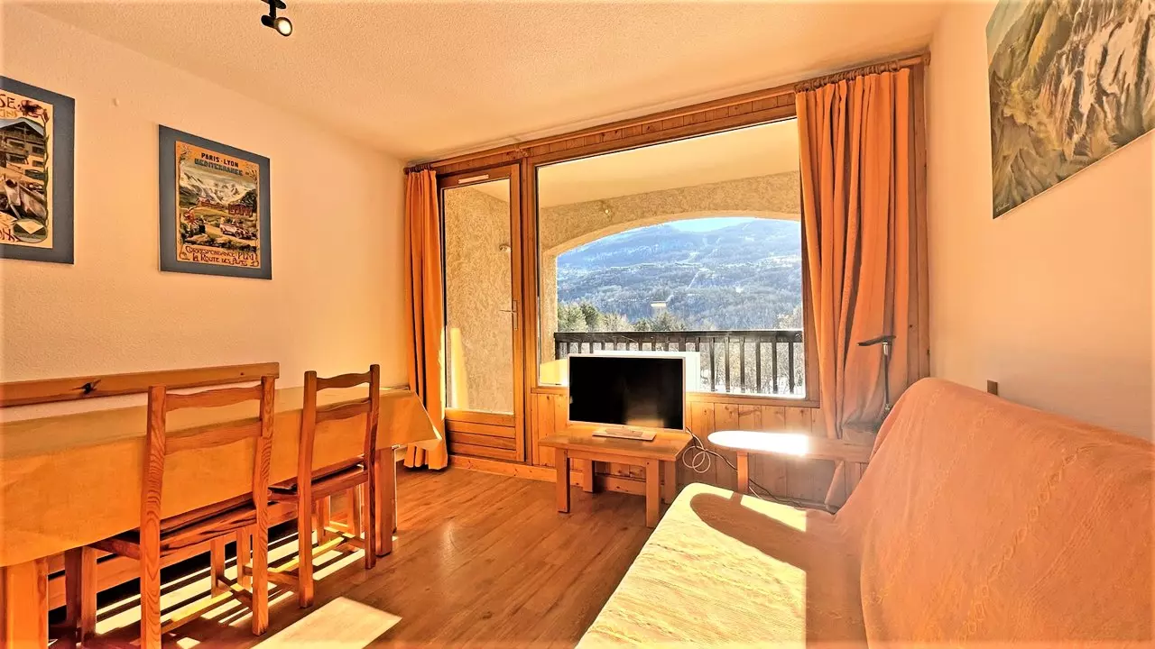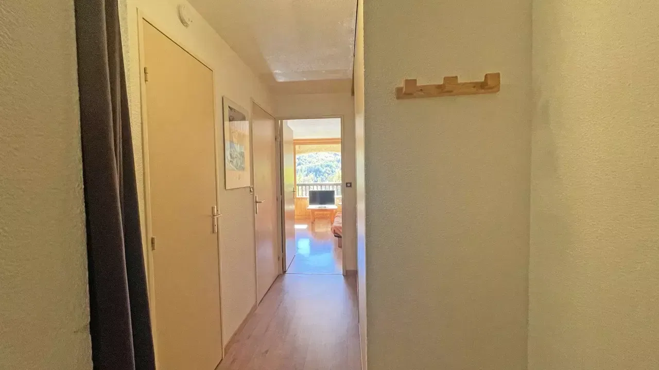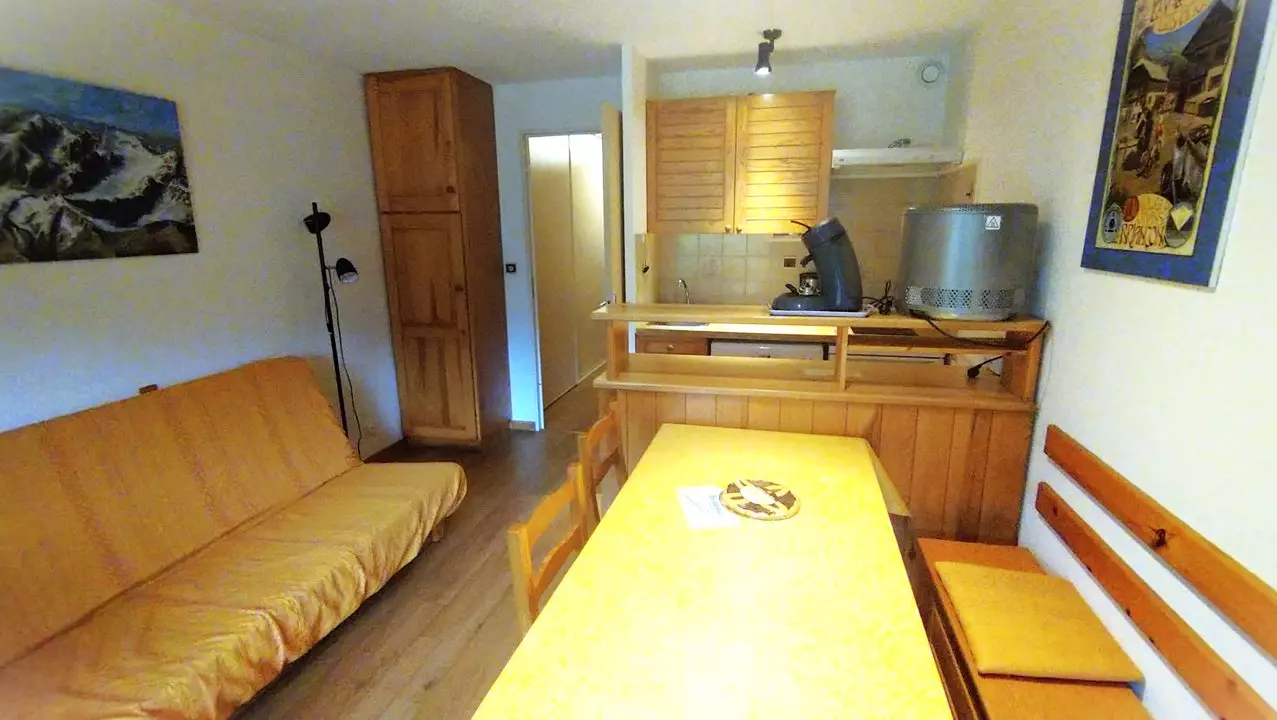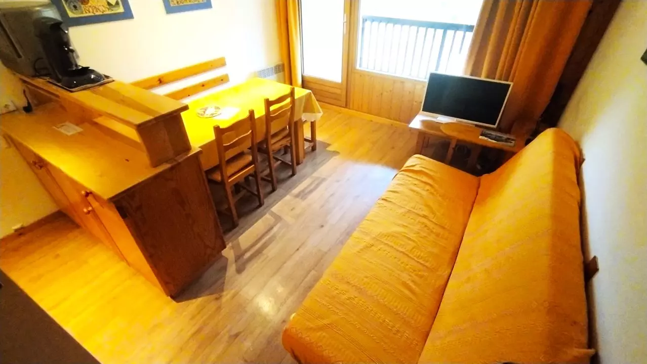 Mountain studio with 4 beds. It consists of an entrance with a large closet, a mountain corner with two bunk beds separated by a curtain, a bathroom, a separate toilet. The living room with a double sofa bed, the kitchen is equipped with a refrigerator, microwave, Senseo electric coffee maker, ceramic hob, washing machine... A pleasant loggia facing south, to enjoy a meal or a moment of relaxation in the sun. A ski locker. Parking is located in front of the residence.
